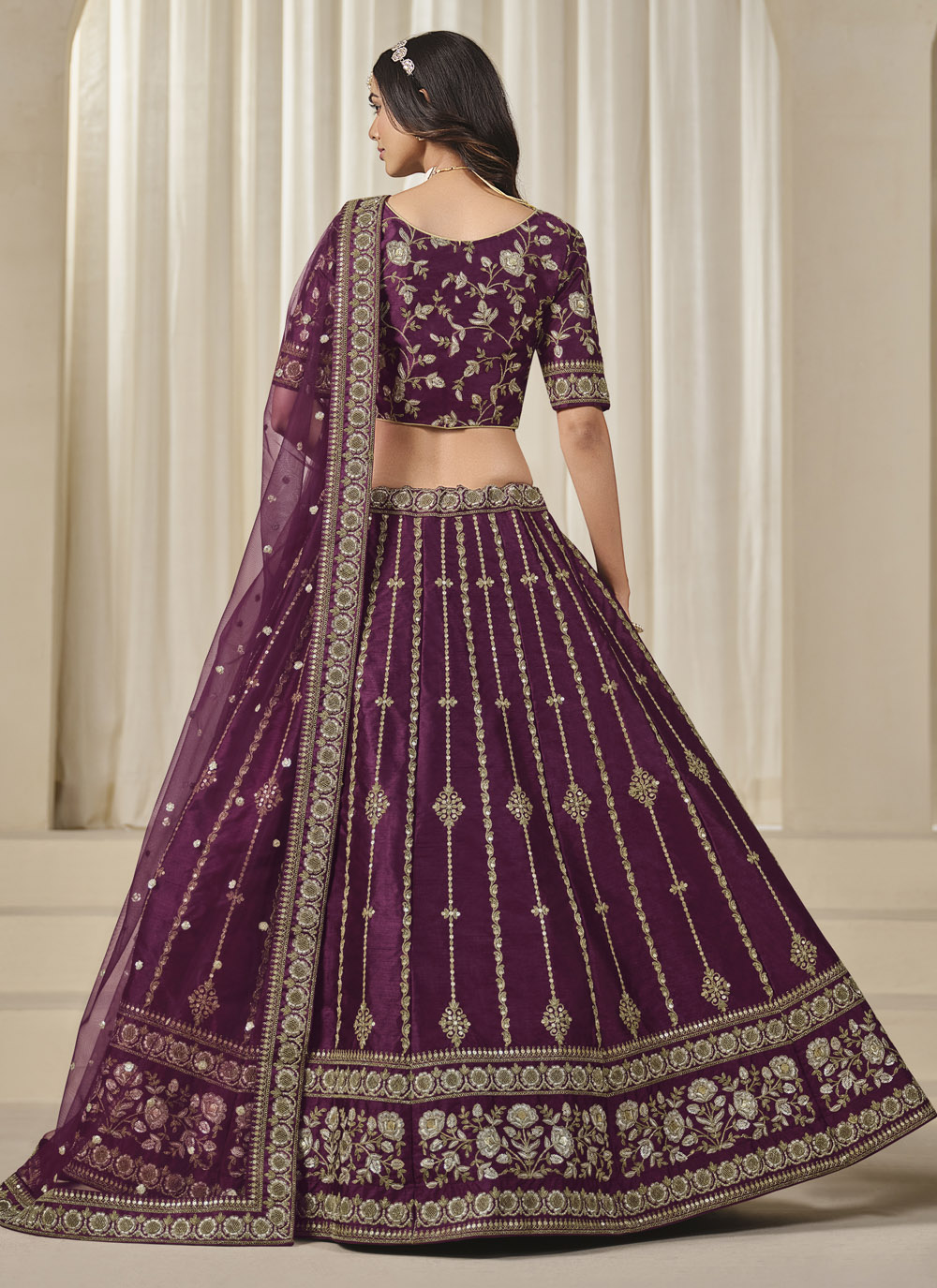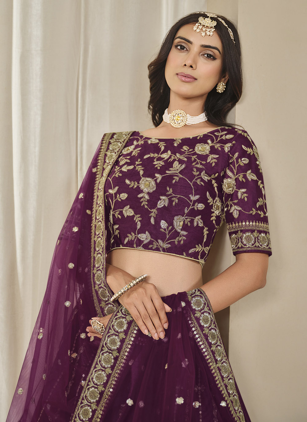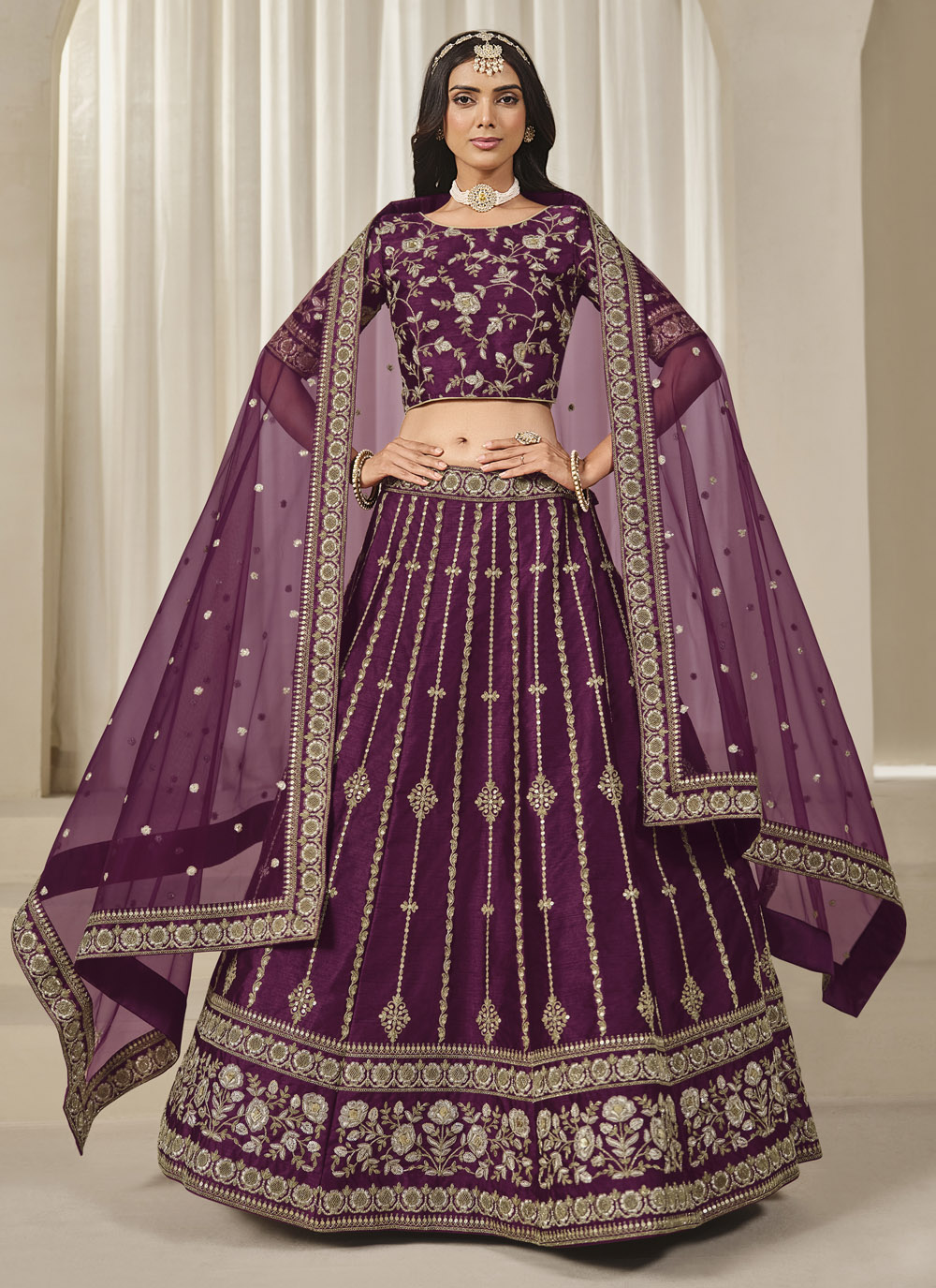 Elevate your ethnic look with this richly detailed purple lehenga choli. The art silk base glows with fine zari patterns and sequin embellishments. Perfect for making a grand entrance at weddings, sangeet nights or royal festivities. Comes with matching choli and dupatta.