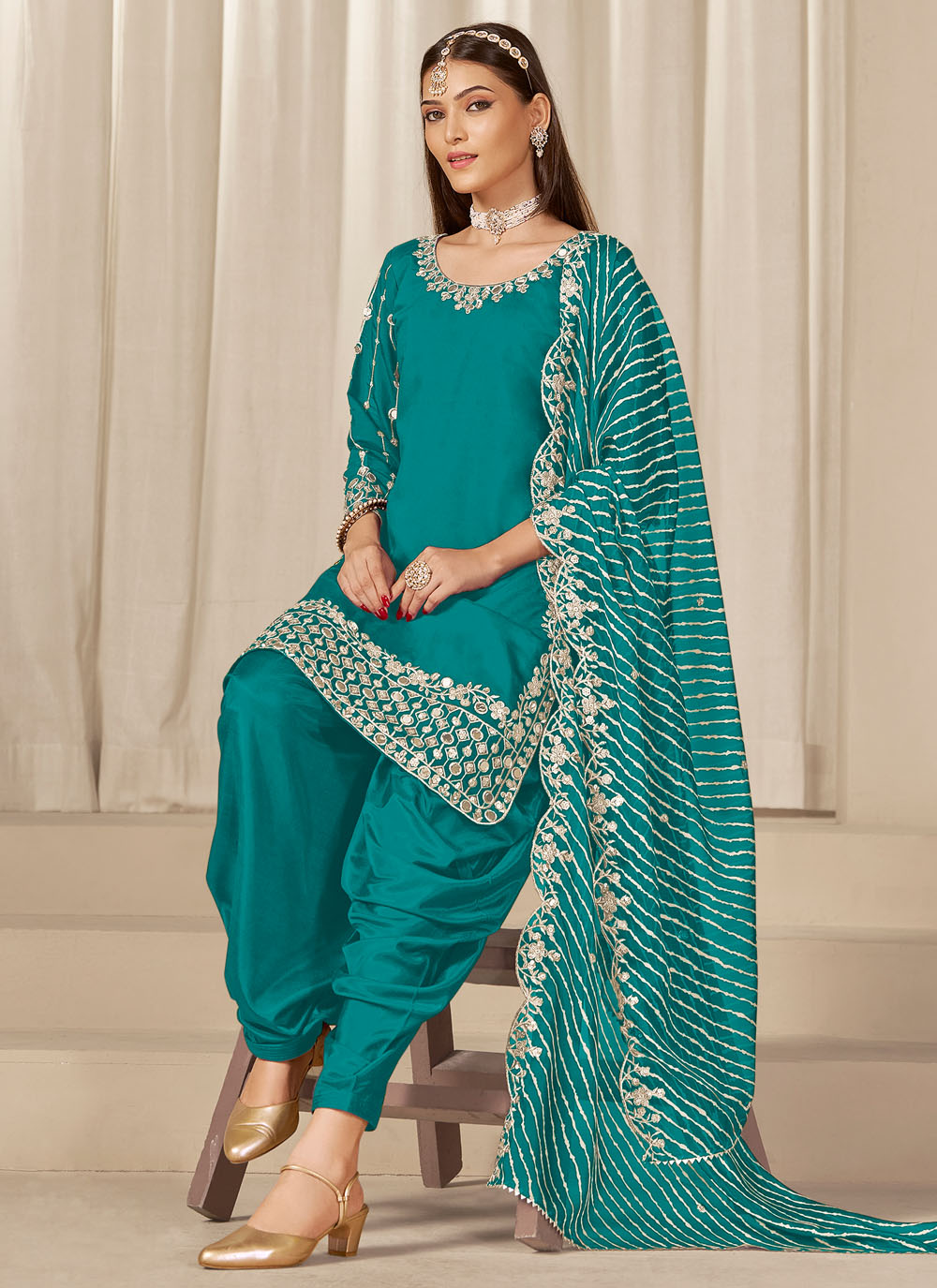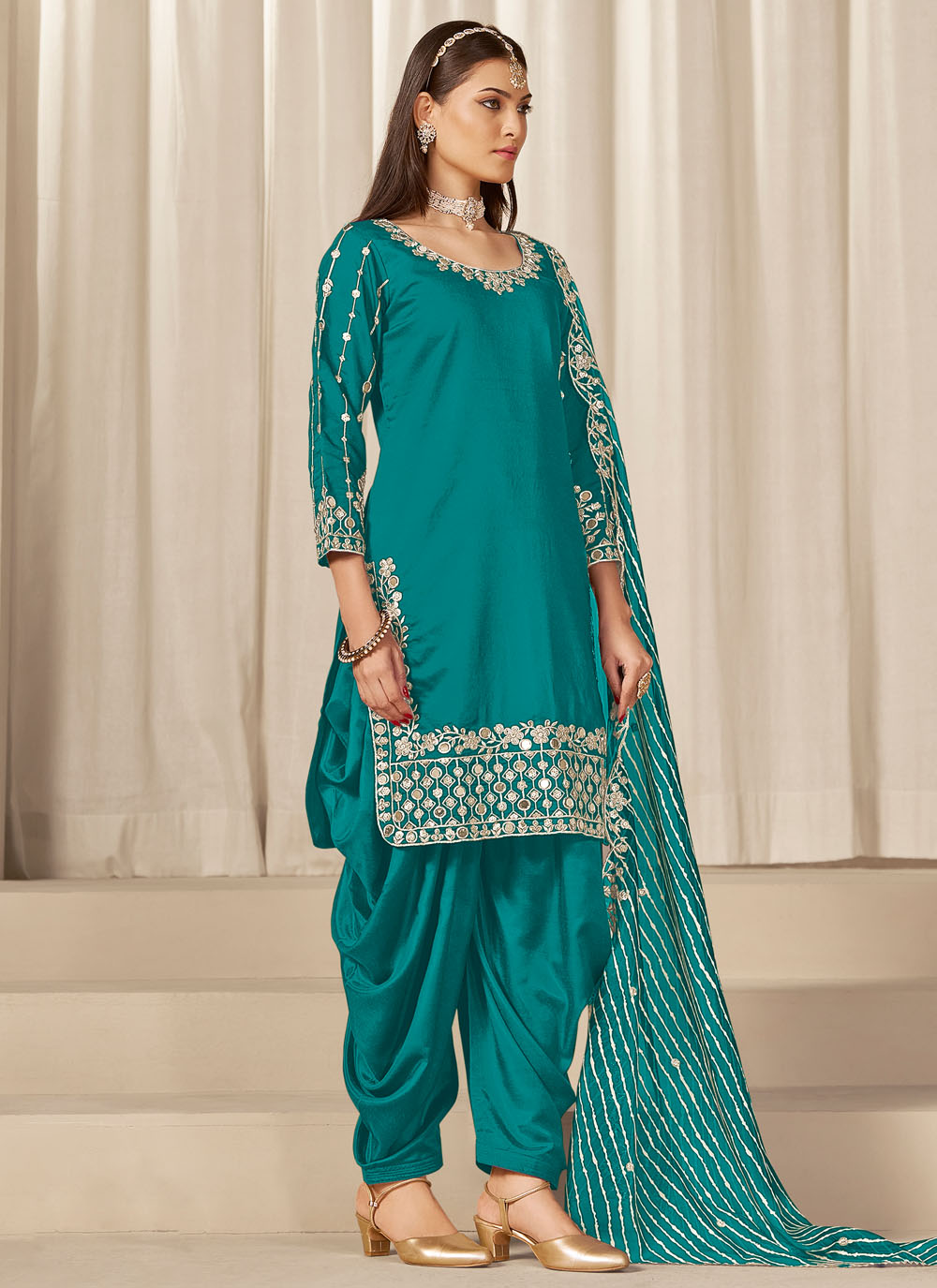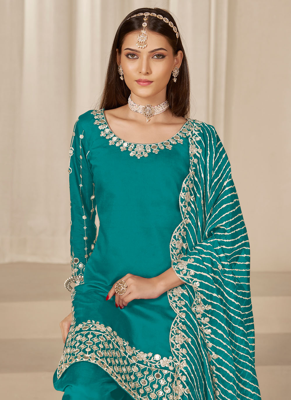 Redefine festive fashion with our Rama Green Embroidered Silk Salwar Kameez, adorned with dazzling mirror, zari, and sequin detailing. This trendy ensemble balances heritage artistry with contemporary style, making it a must-have for your ethnic wardrobe. Comes with matching bottom and dupatta.