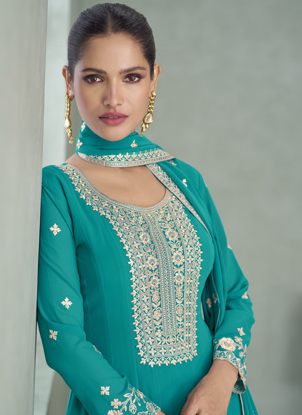 Add elegance to your festive look with this enchanting Rama green readymade gown in soft georgette. Adorned with shimmering sequins embroidery, it’s a graceful choice for weddings, receptions and traditional ceremonies. Comes with matching dupatta.