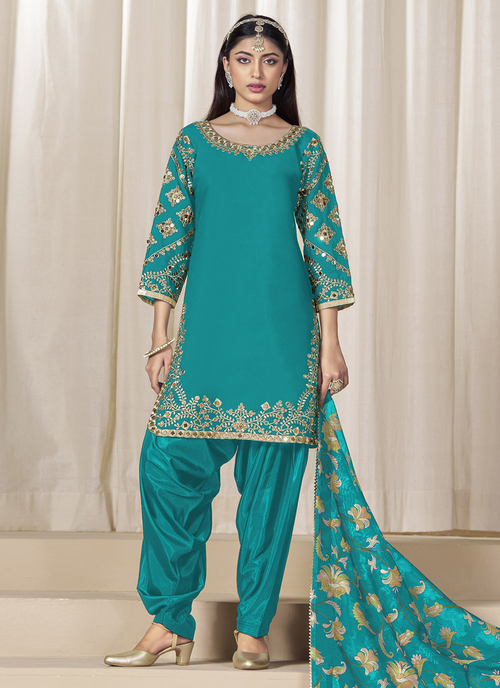 Step into sophisticated style with this rama silk salwar kameez highlighted by ornate zari patterns and delicate mirror accents. The lustrous fabric ensures a flattering silhouette, perfect for weddings, festivals and formal gatherings. Comes with matching bottom and dupatta.