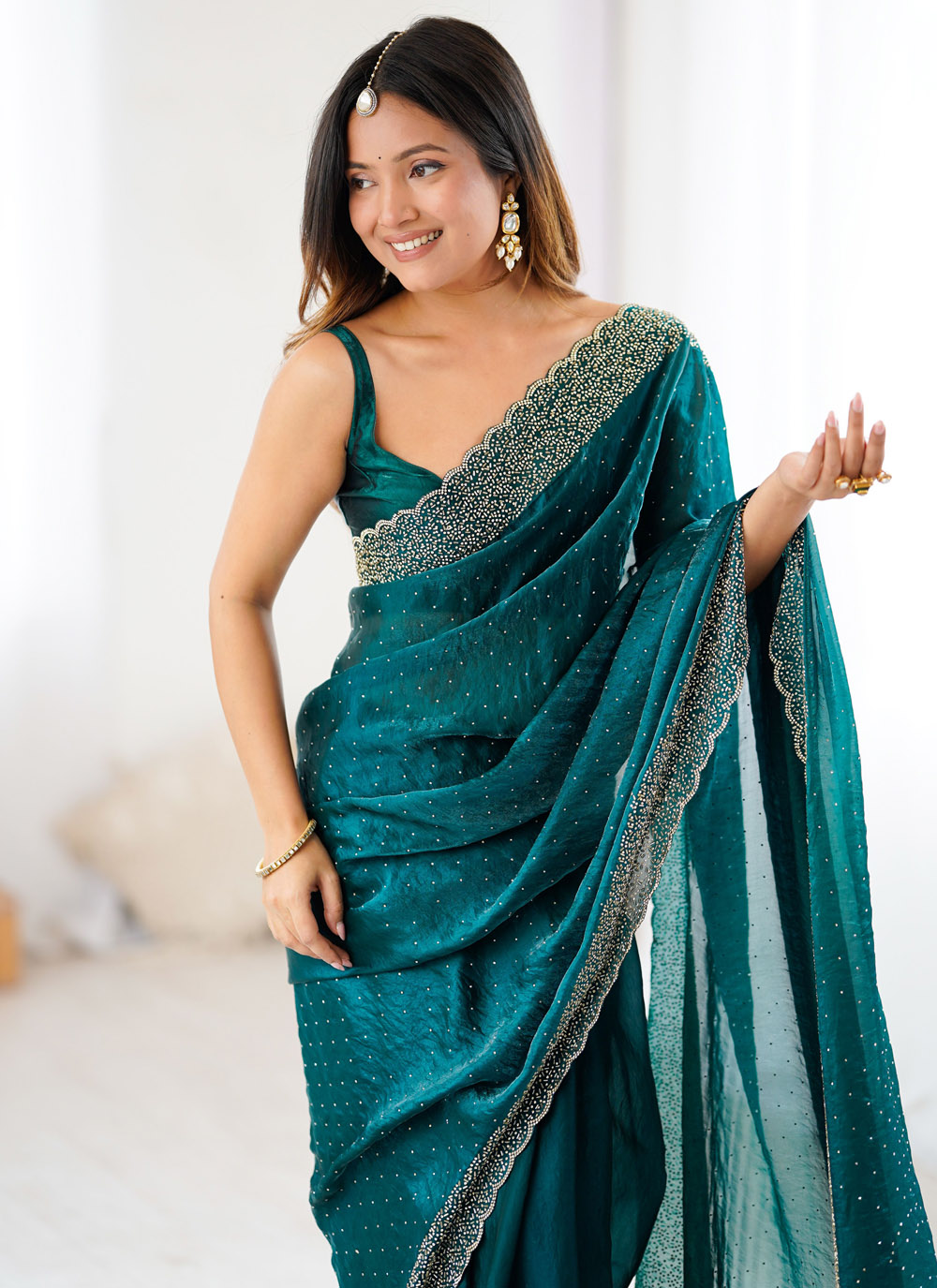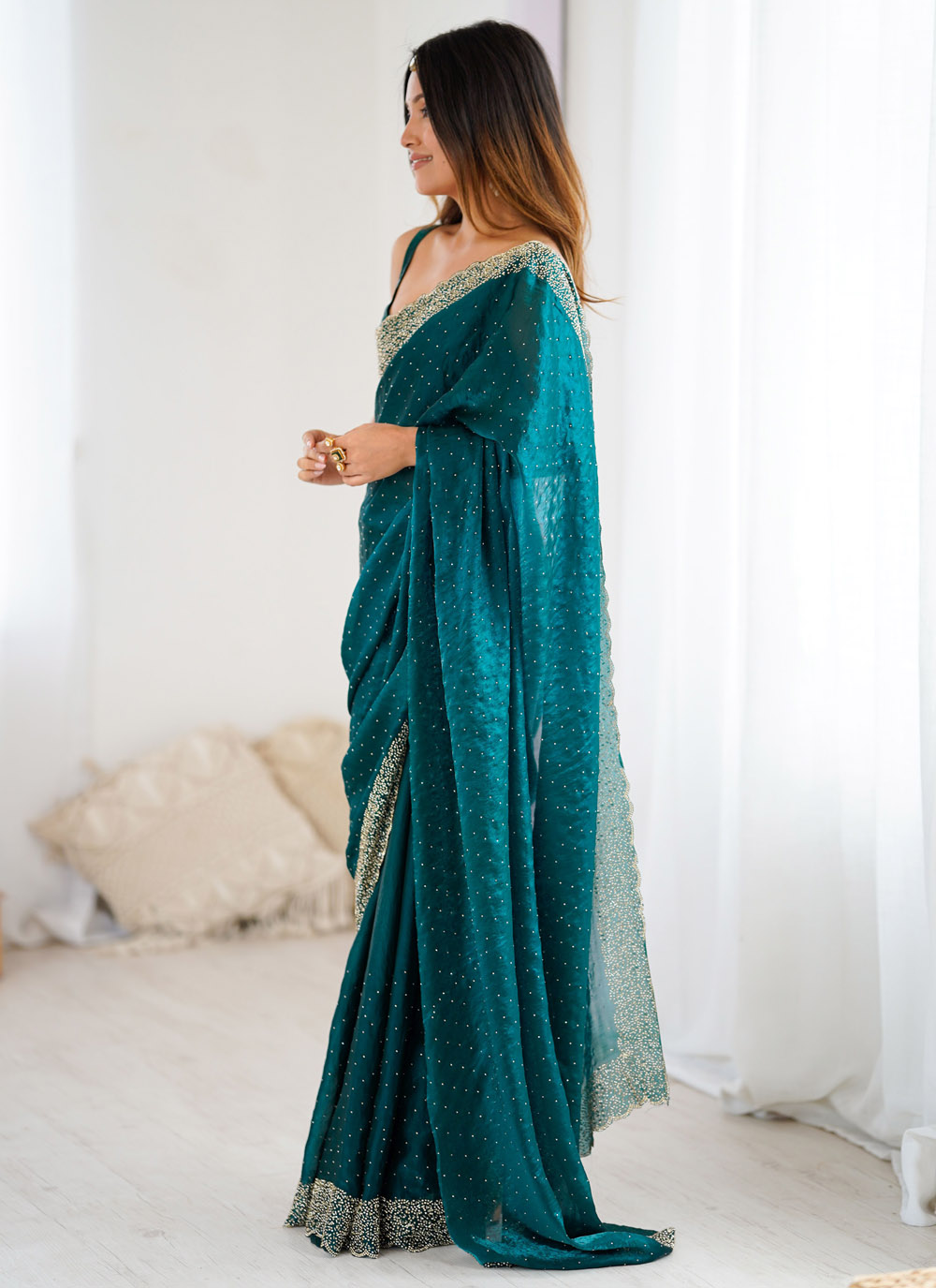 This Rama satin saree stands out with beautifully crafted zarkan handwork that lends a charming glow to its silky surface. The lightweight fabric glides effortlessly, ensuring comfort from start to finish. Comes with matching blouse.