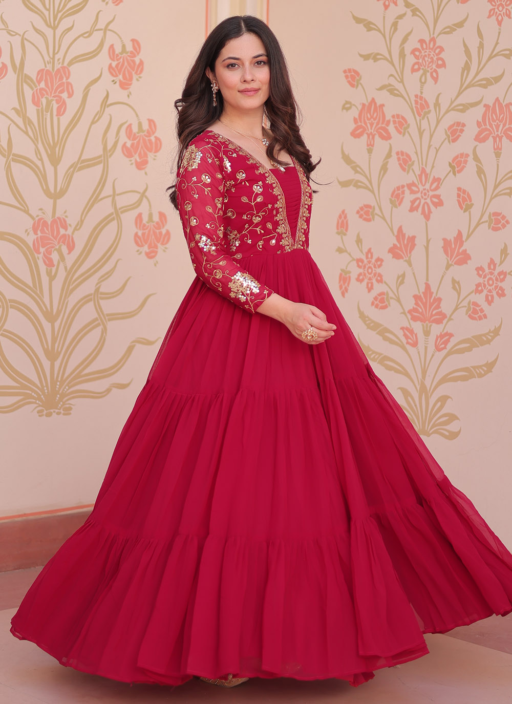 Dazzle effortlessly in this rani faux georgette gown, lavishly detailed with shimmering sequins and rich zari embroidery. The readymade silhouette drapes beautifully. making it a perfect ensemble for engagement parties, festive evenings and wedding celebrations.