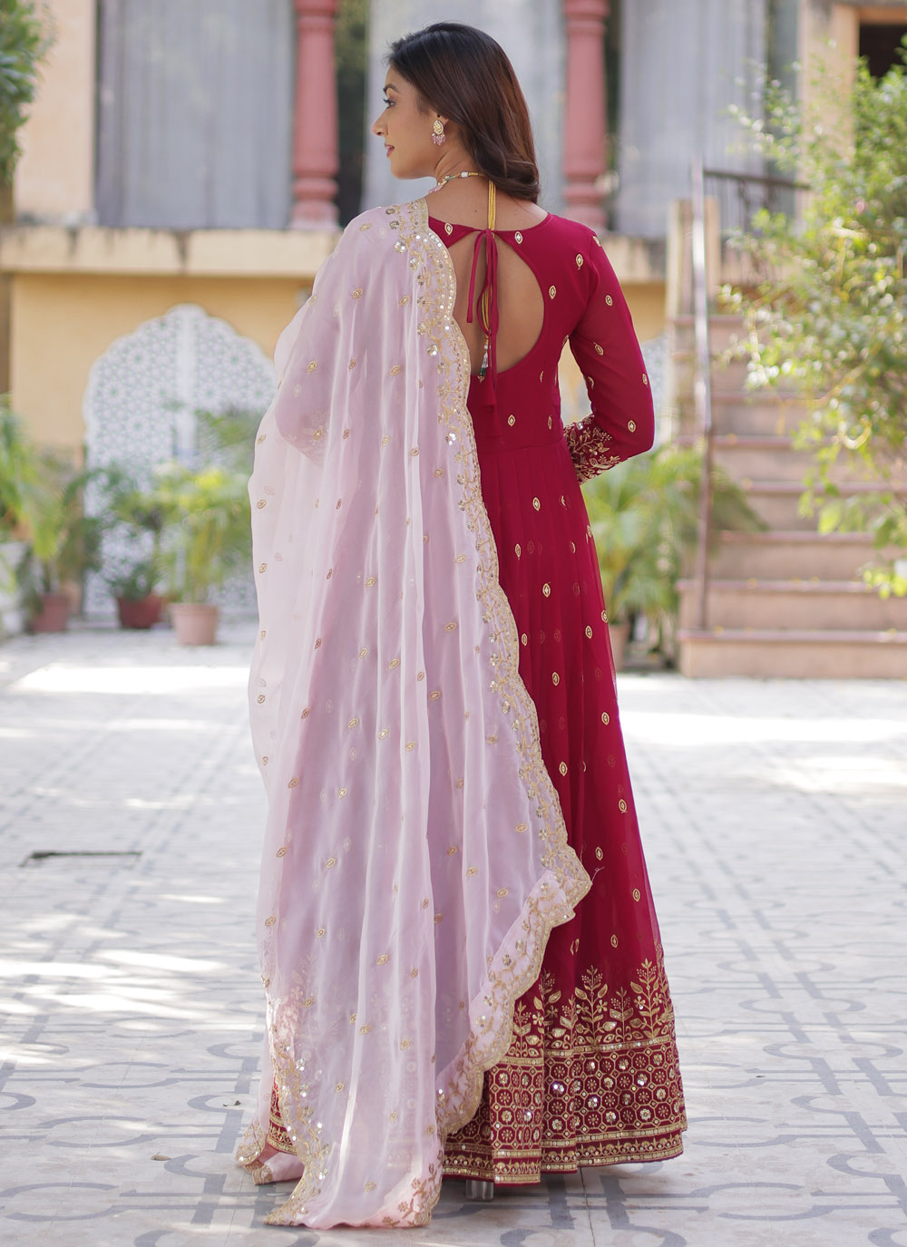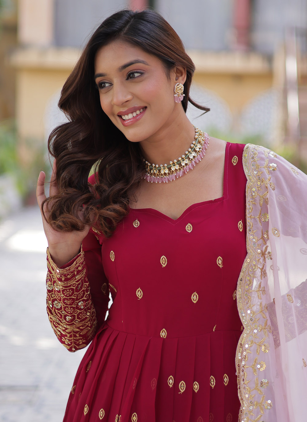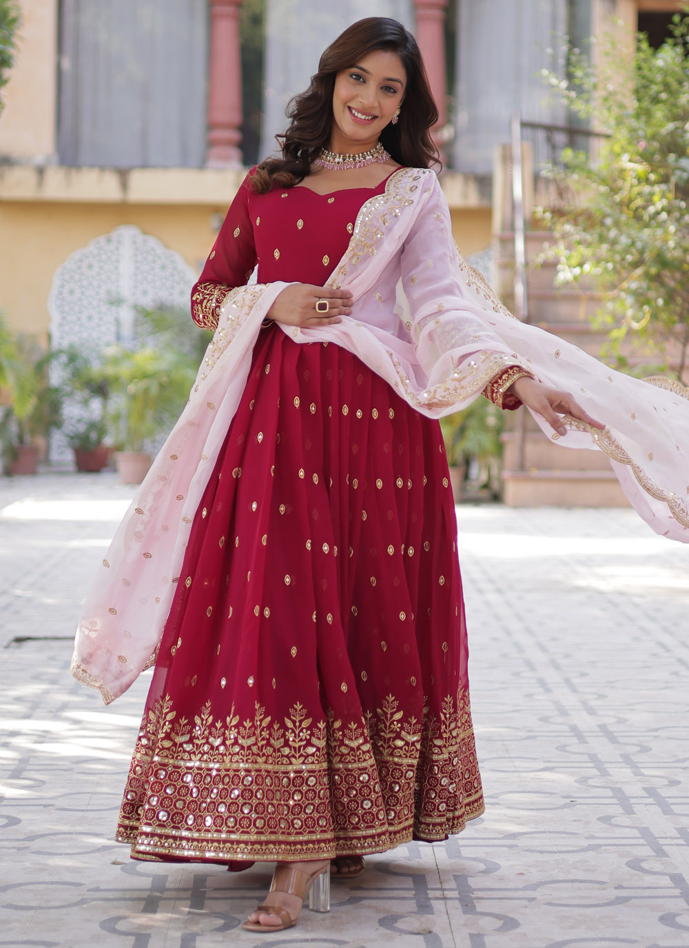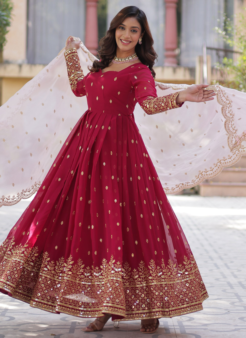 Make a statement in this trendy Rani faux georgette gown, featuring intricate zari and sequins embroidery. The soft, flowy fabric ensures comfort, while the dazzling embellishments add a royal touch, making it ideal for sangeets, parties, and grand occasions. Comes with matching dupatta.