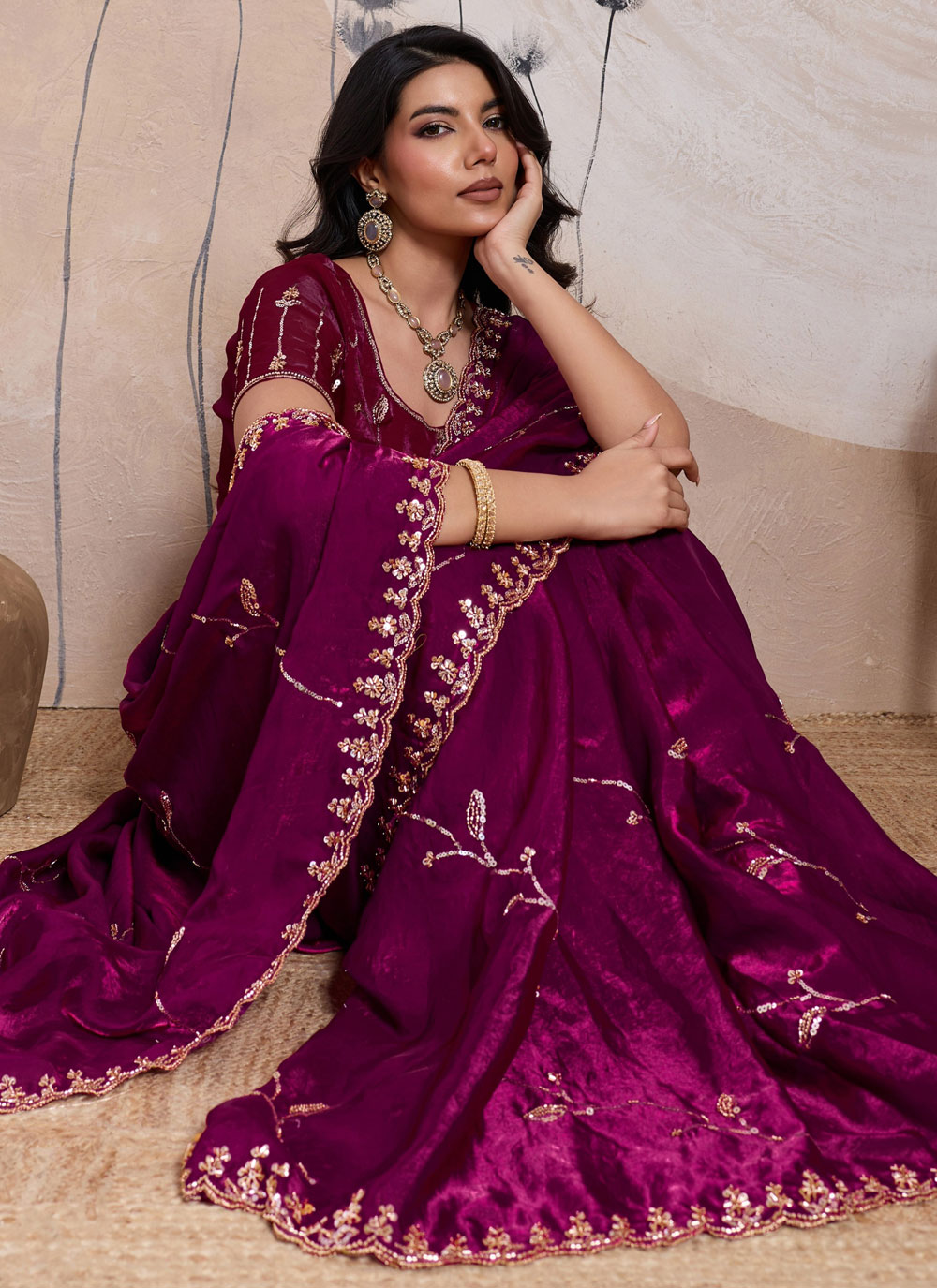 Crafted with attention to detail, this Rani Satin Velvet Designer Saree showcases fine embroidery with beads, sequins, zari, and cutdana work. The rich texture and traditional artistry make it an ideal choice for festive and wedding wear. Comes with matching blouse.