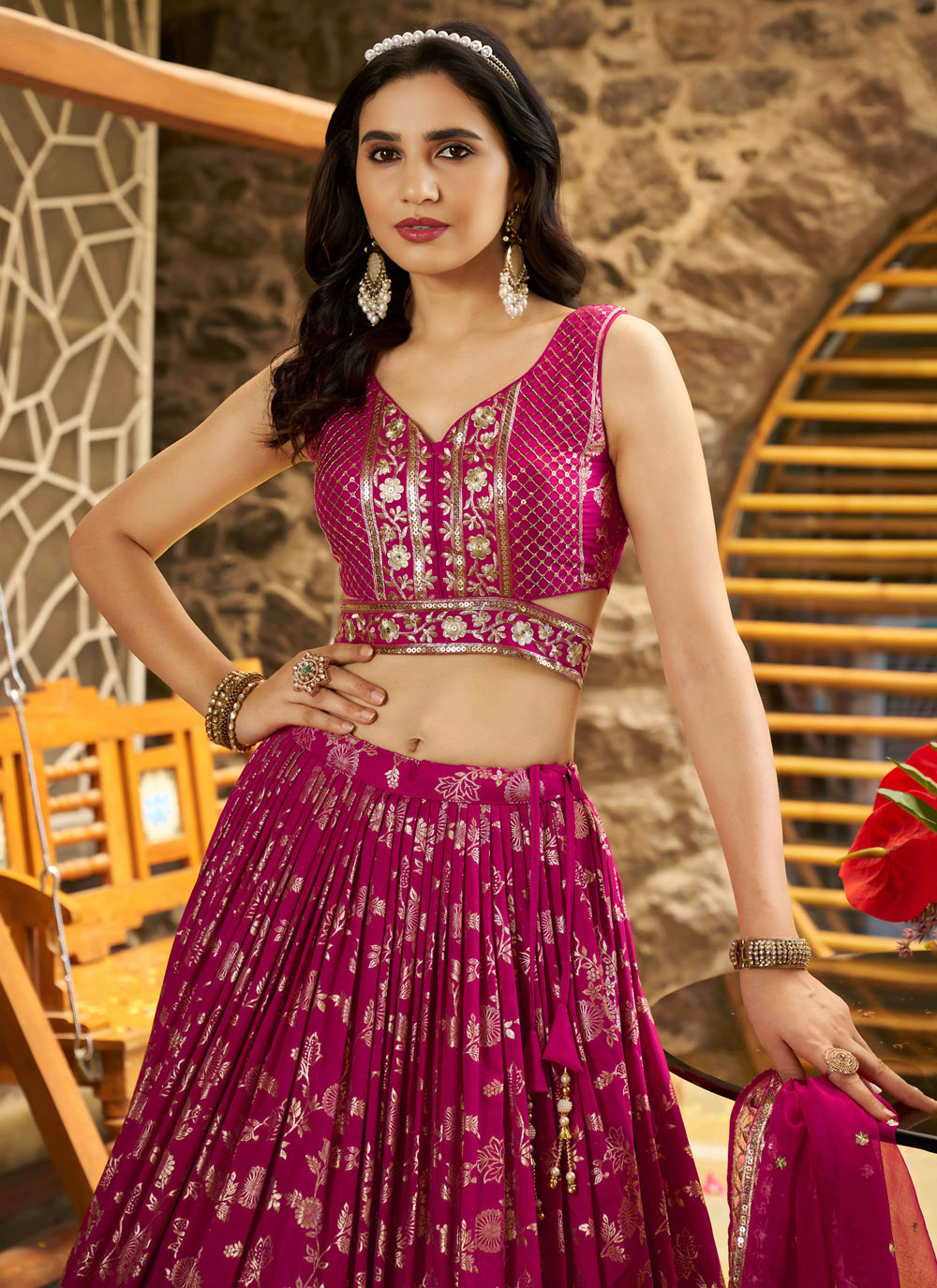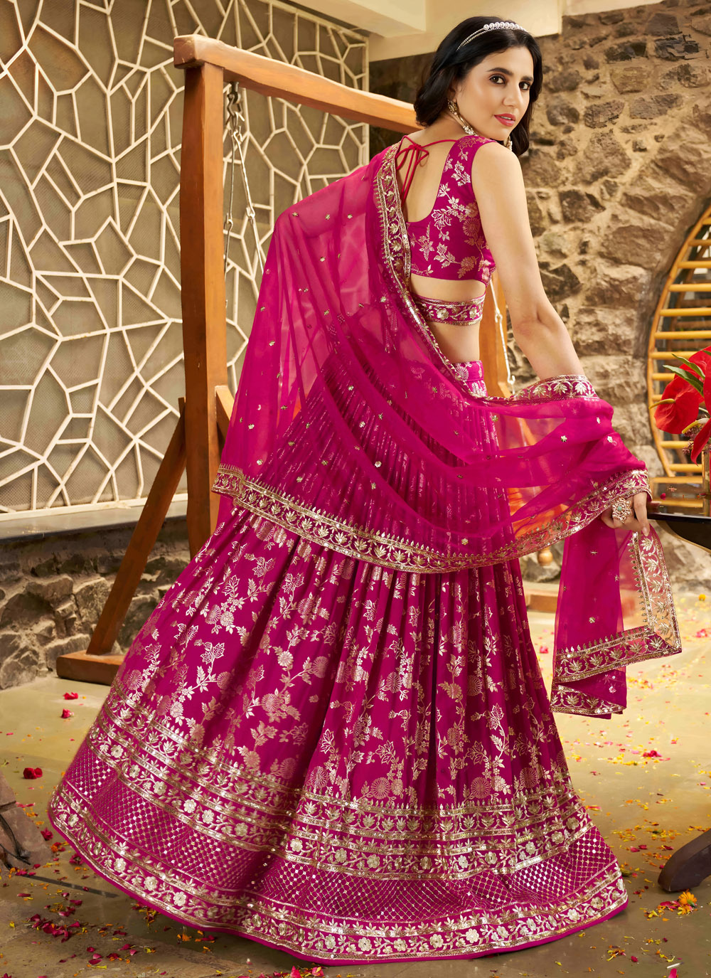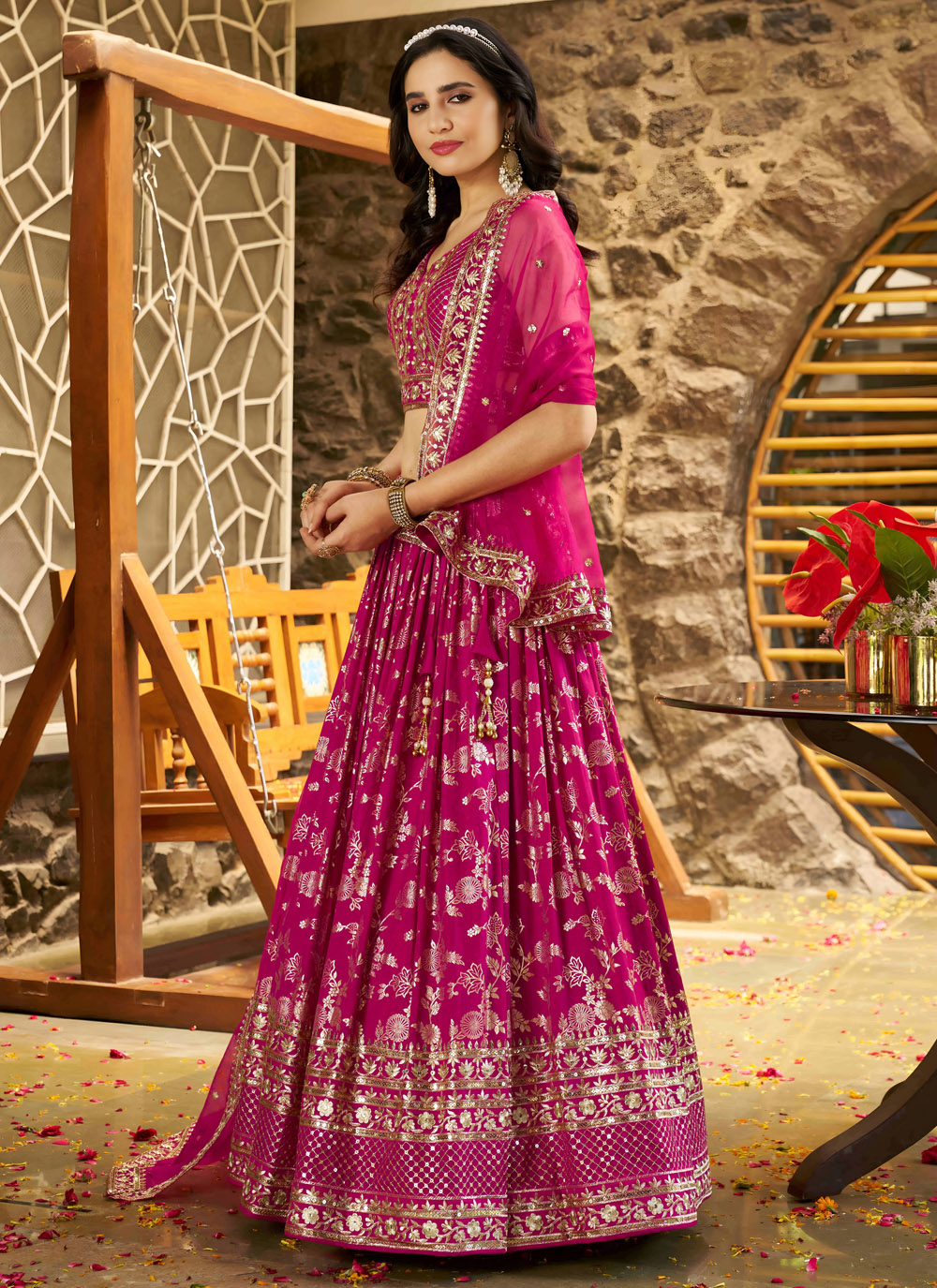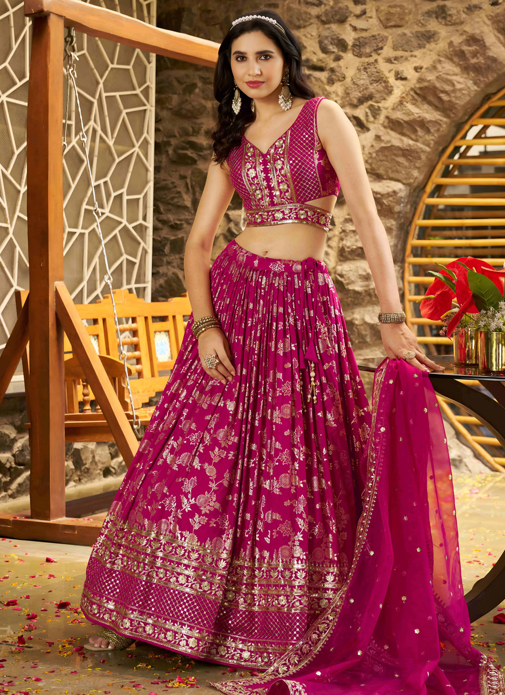This vibrant rani pink A-line lehenga choli crafted from pure Dola jacquard fabric is exquisitely adorned with shimmering sequins and rich zari embroidery. Perfect for engagements, receptions and grand festive occasions. Comes with matching choli and dupatta.