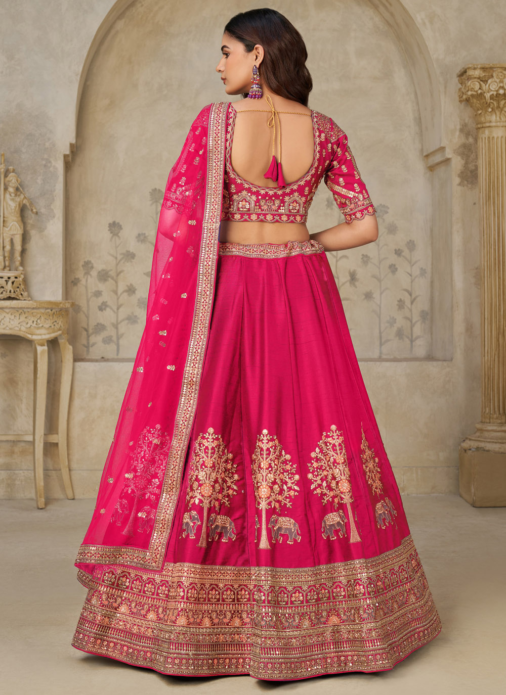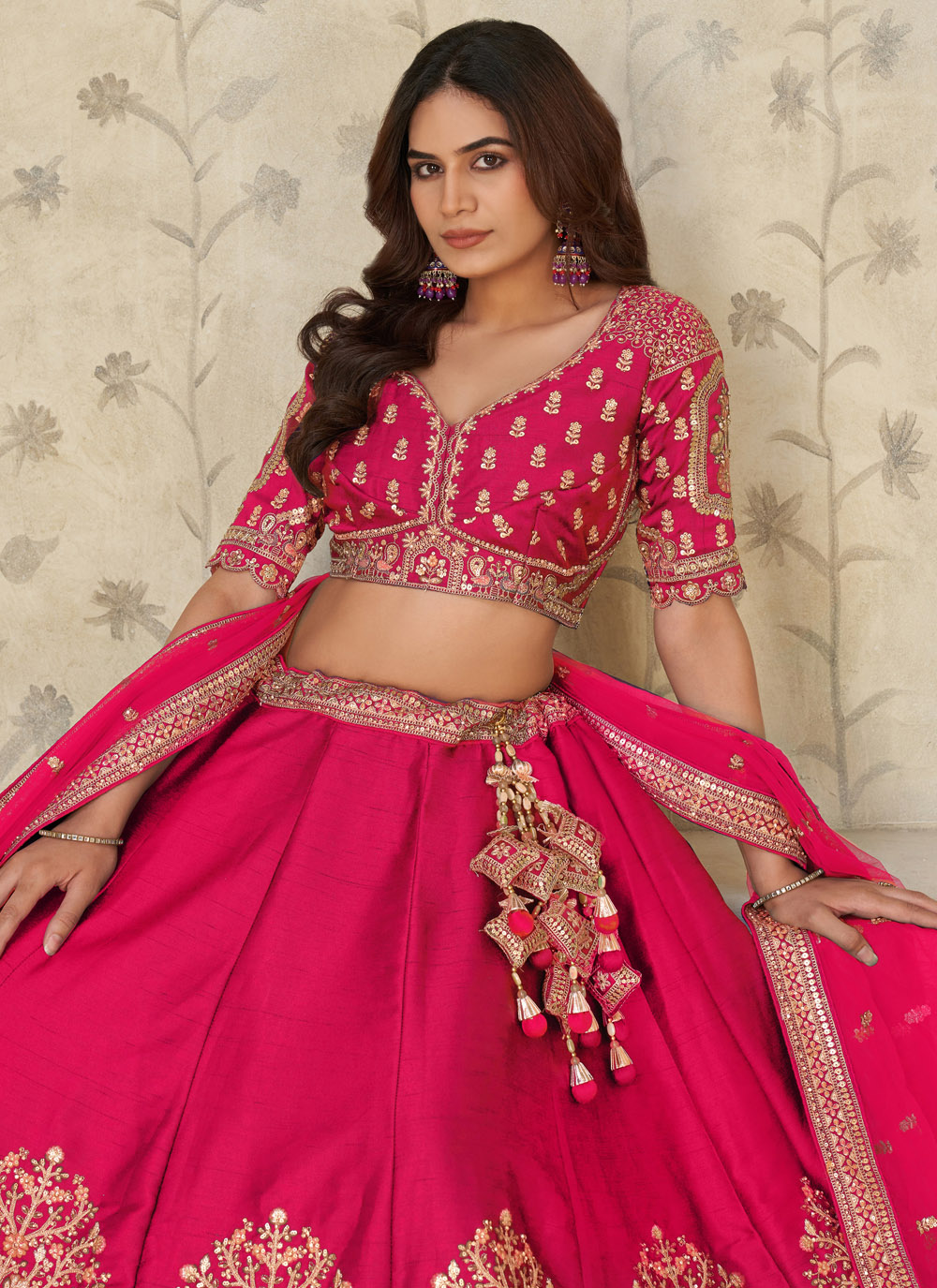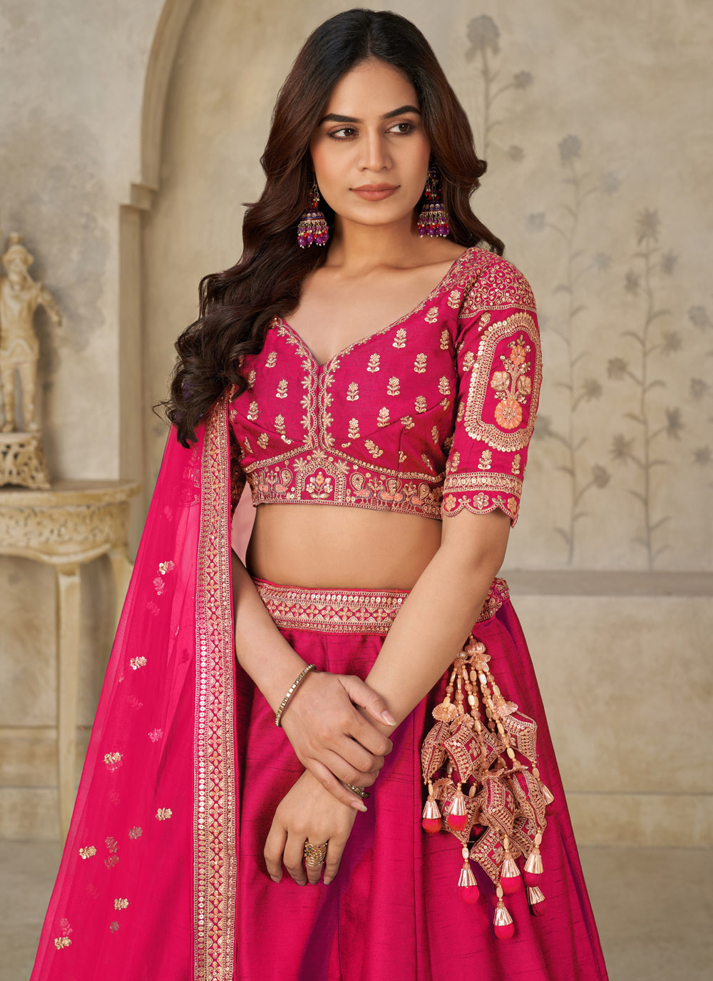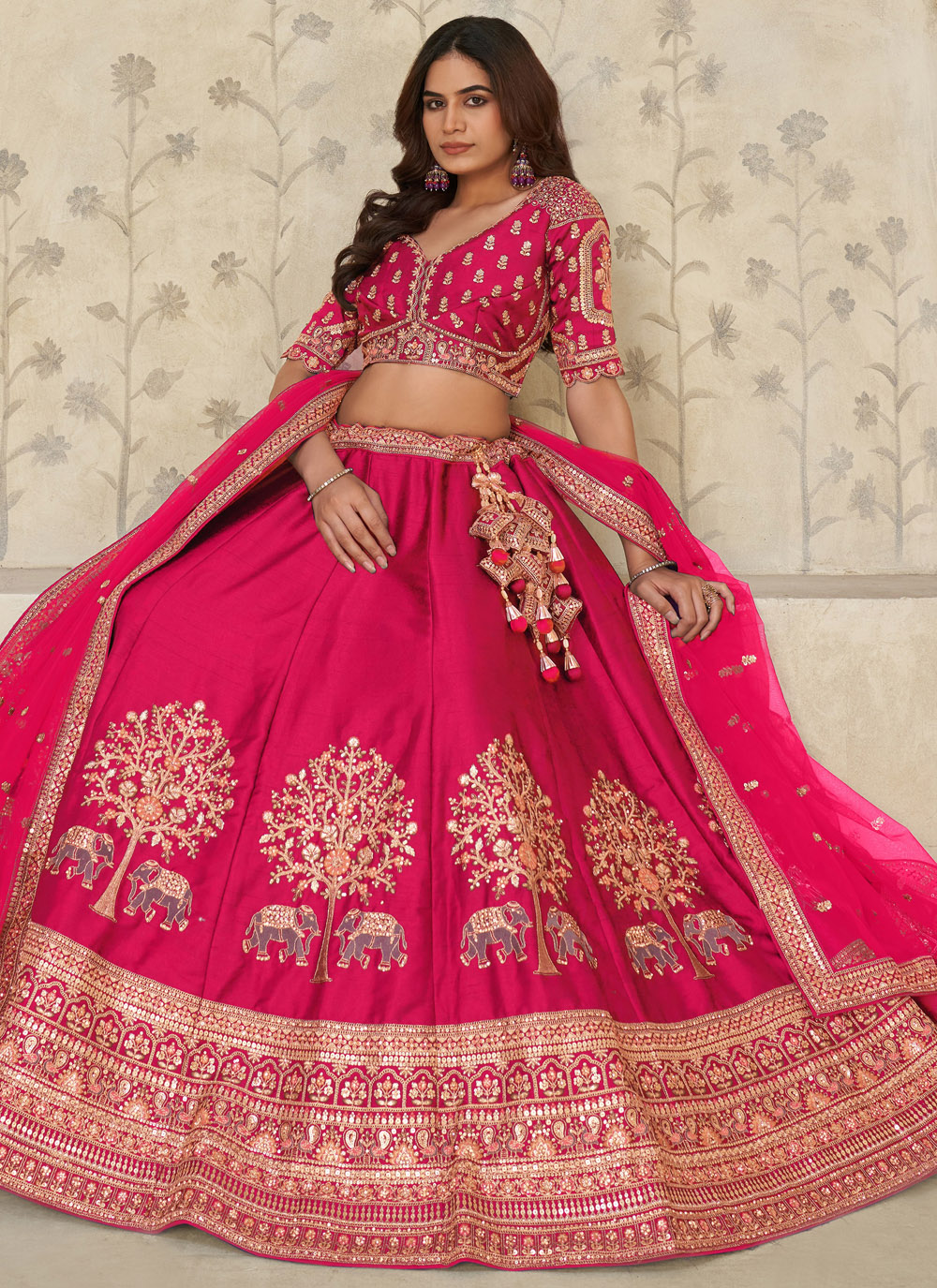 This rani silk lehenga choli blends traditional artistry with festive glamour. The sequins and stone accents enhance the zari embroidery, offering a rich and timeless wedding look that stands out beautifully. Comes with matching choli and dupatta.