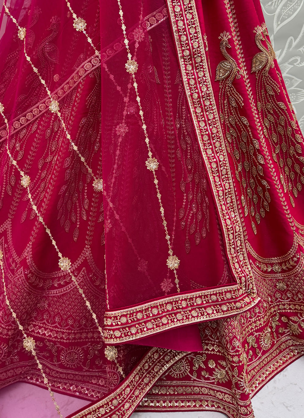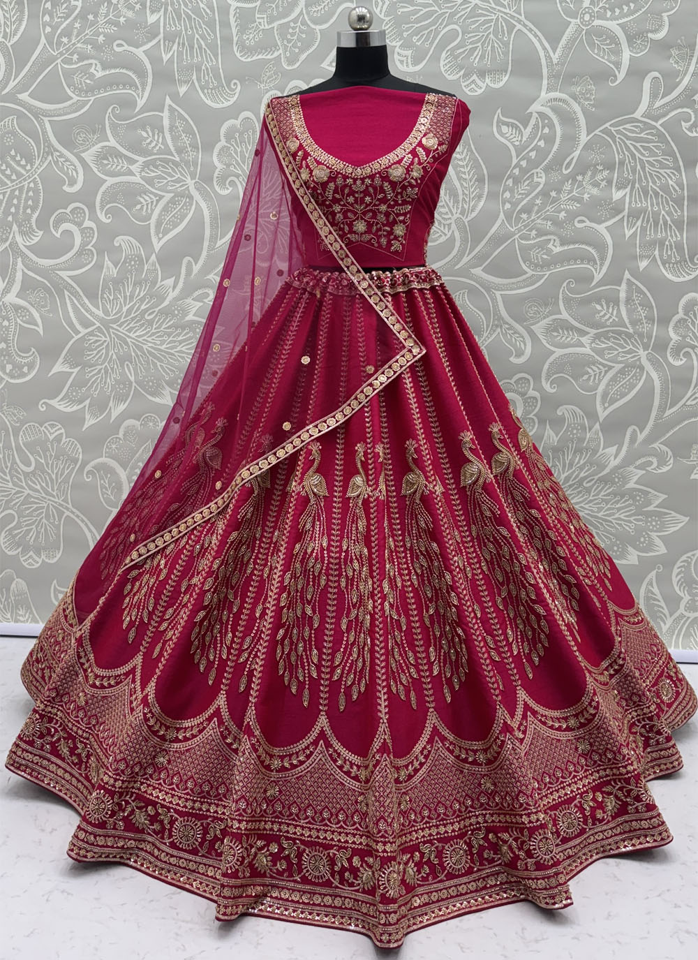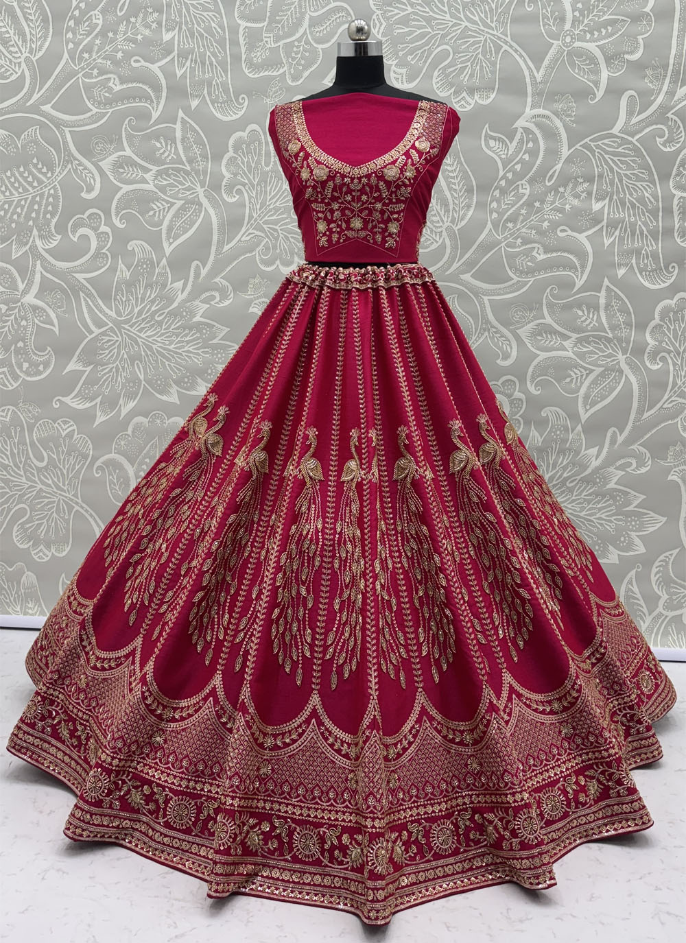 A graceful Rani Silk Lehenga Choli designed to reflect timeless wedding elegance. The outfit features intricate dori, sequins, thread, crystal, and zari embroidery that forms delicate patterns across the rich silk fabric. Comes with matching choli and dupatta.