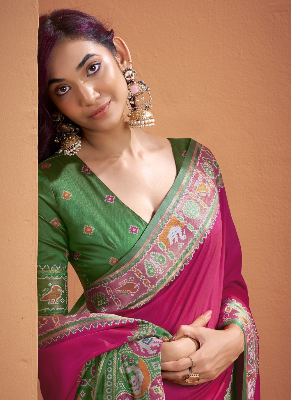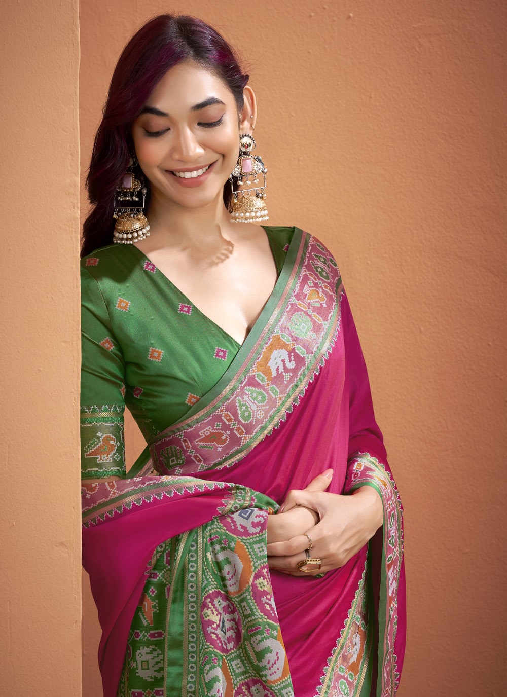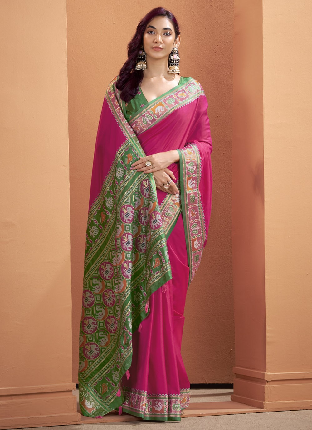 Make an unforgettable impression in this Rani Silk Saree, masterfully adorned with traditional Patola weaving work. The rich rani pink hue pairs beautifully with intricate motifs, creating a designer look that exudes regal charm. Comes with matching blouse.