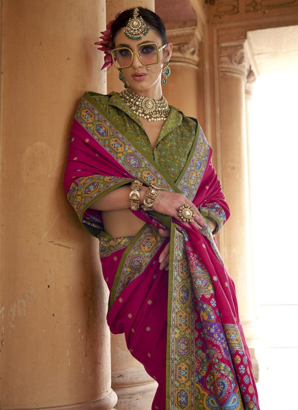 This classic silk saree in a vibrant Rani shade features exquisite printed motifs that celebrate cultural artistry. Ideal for festivals, pujas, and wedding ceremonies, it brings together traditional finesse and modern grace. Comes with matching blouse.