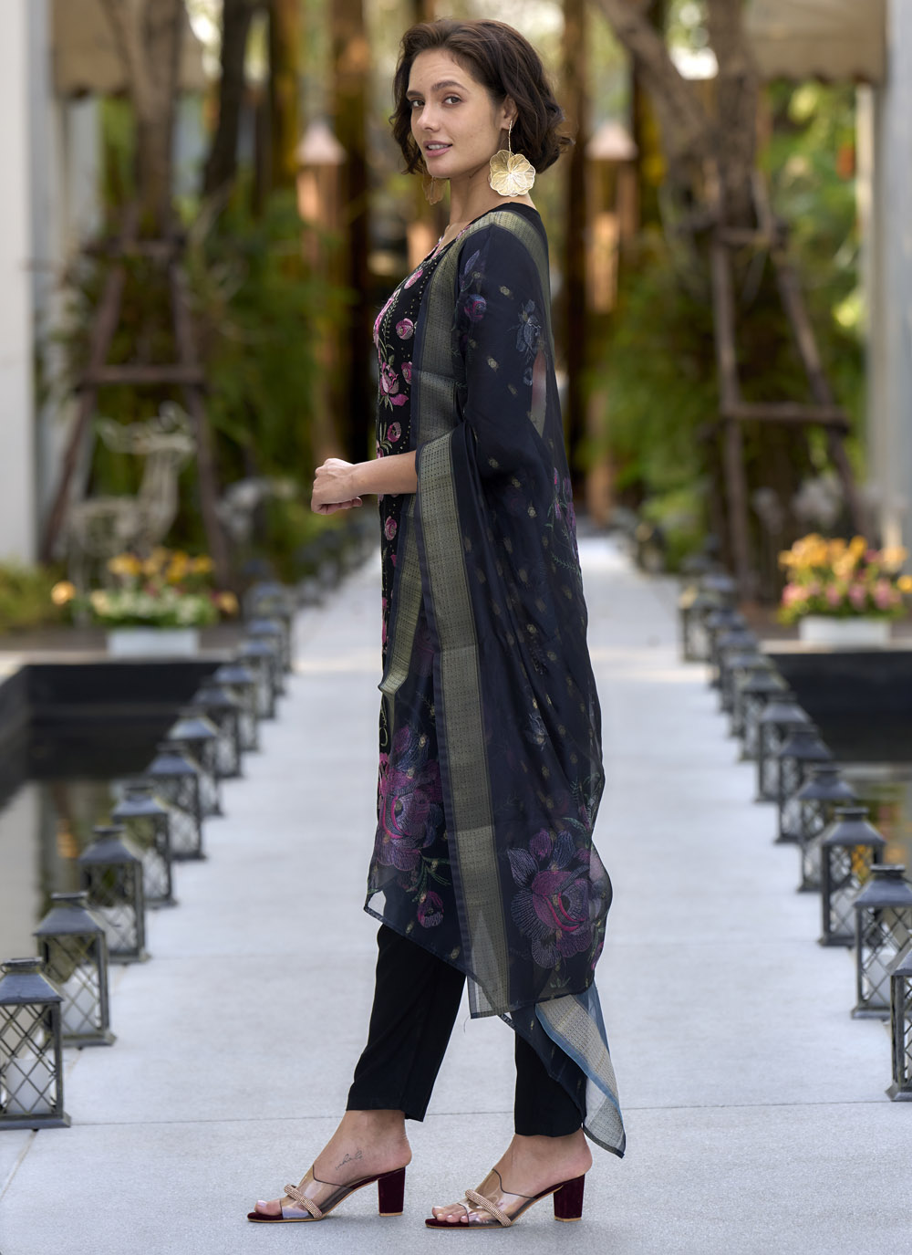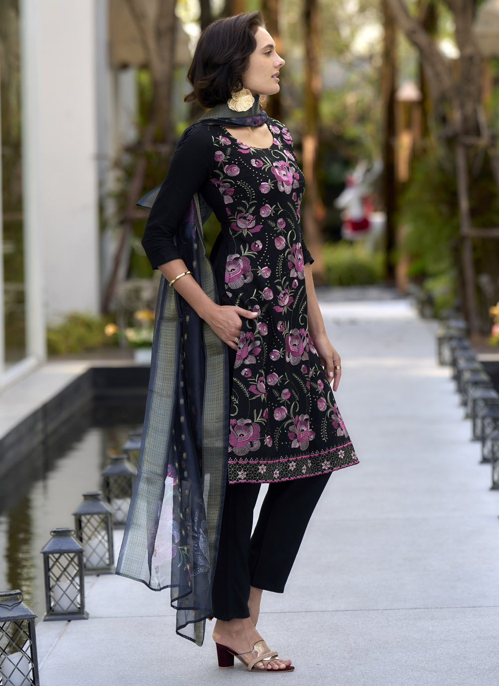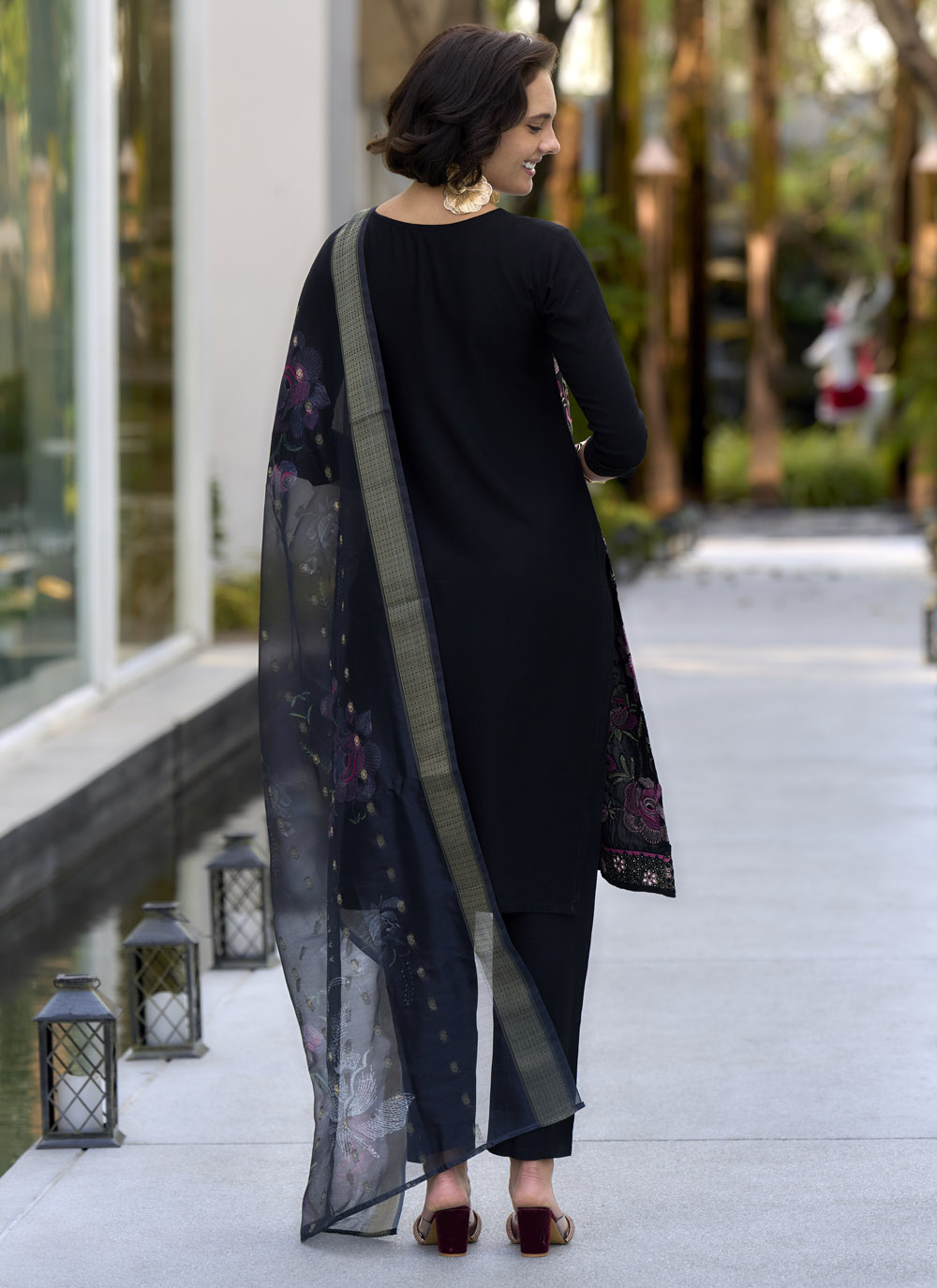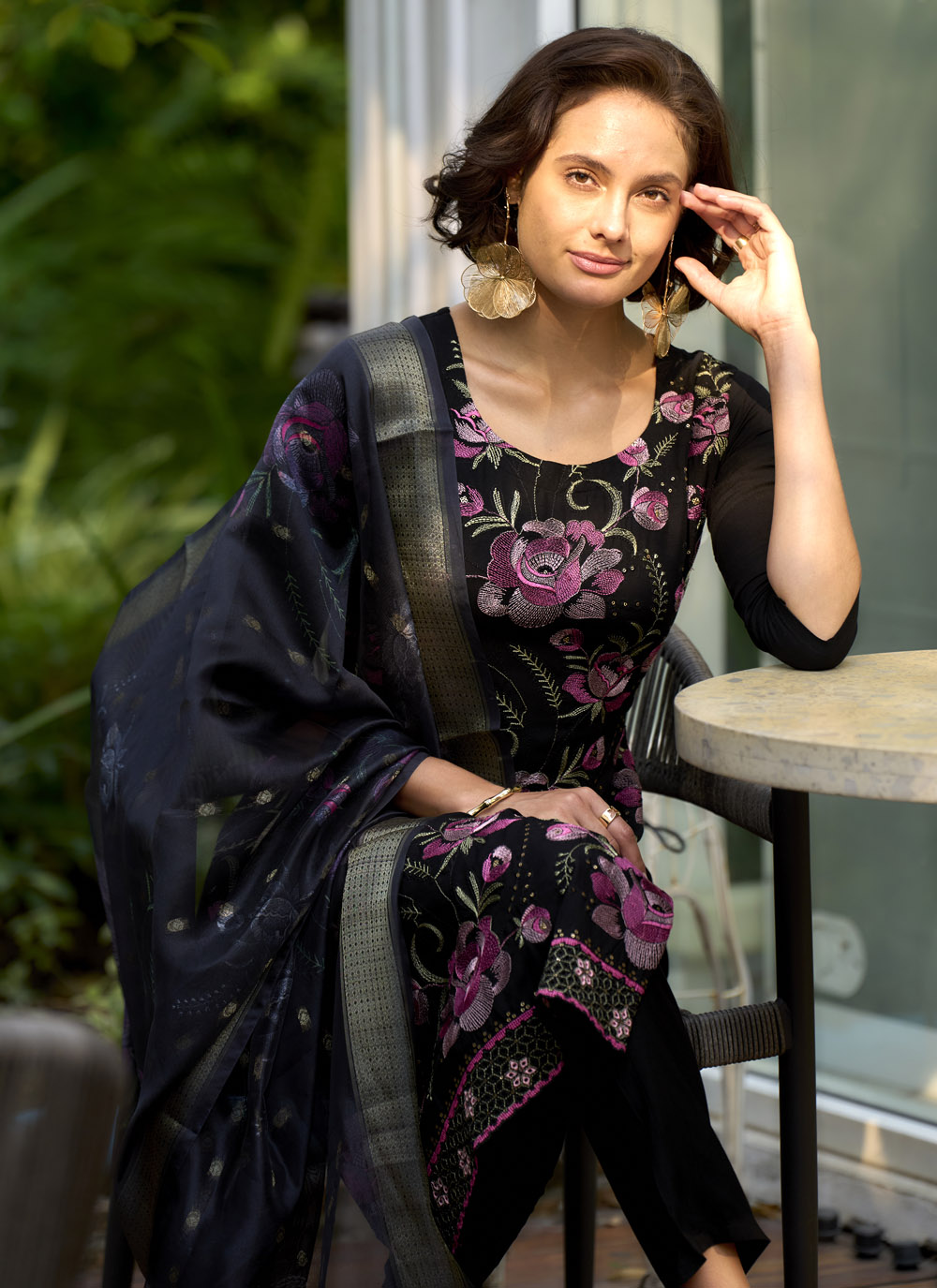 Step out in confidence with this black rayon salwar suit. Its delicate embroidery adds a touch of charm, while the readymade design ensures instant, effortless style for any occasion. Comes with matching bottom and dupatta.