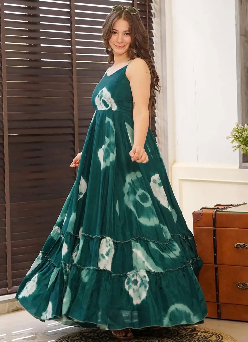 Make a statement with the Rayon Digital Print Long Readymade Gown in Teal. Featuring a unique digital print and made from soft rayon fabric, this gown offers a flattering, ready-to-wear fit, ideal for both casual and special occasions.