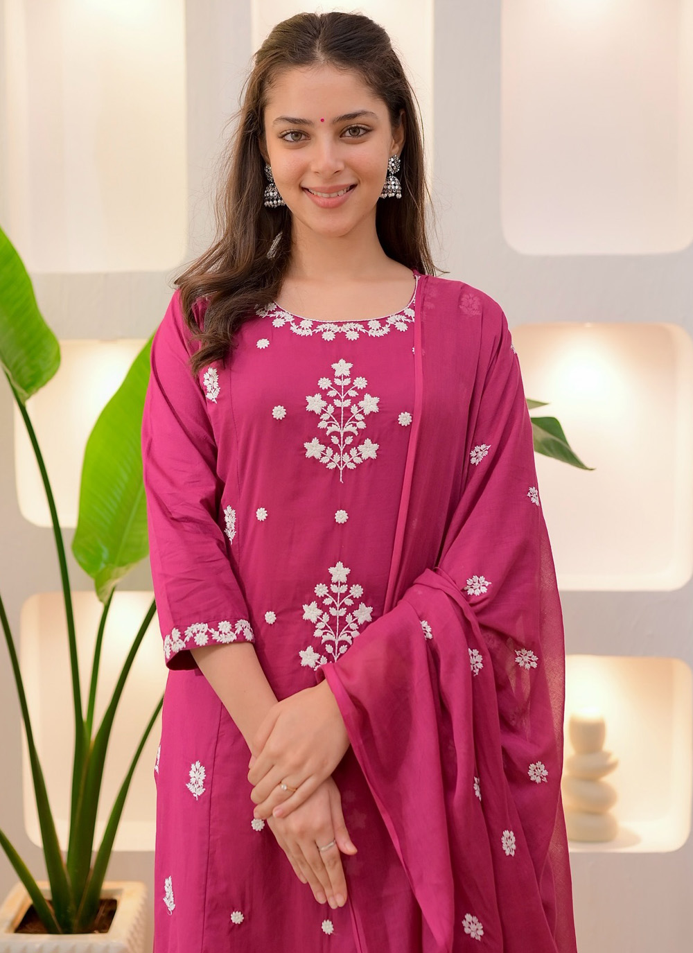 The kameez showcases thoughtful embroidery on a smooth pink rayon base, giving a blend of comfort and chic appeal. Its lightweight construction and trendy look make it suitable for warm weather and casual occasions. Comes with matching bottom and dupatta.