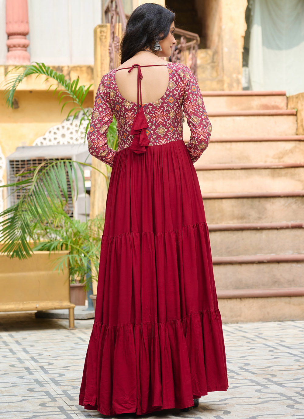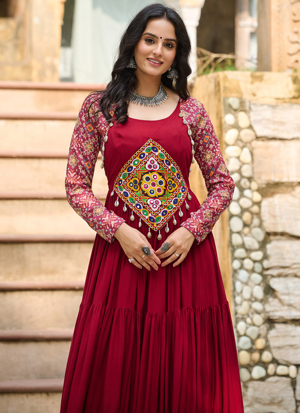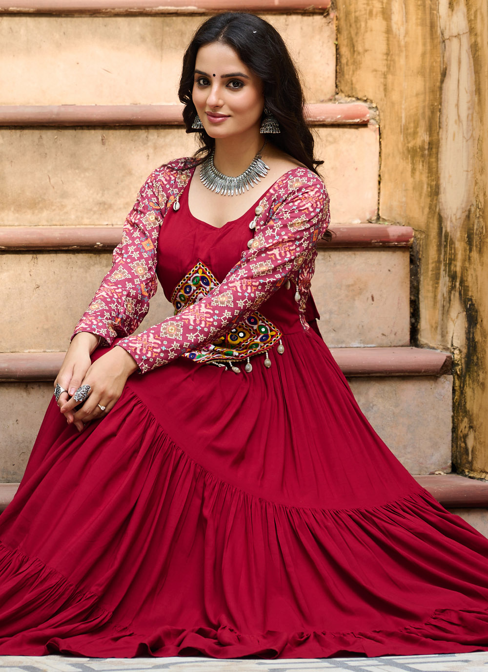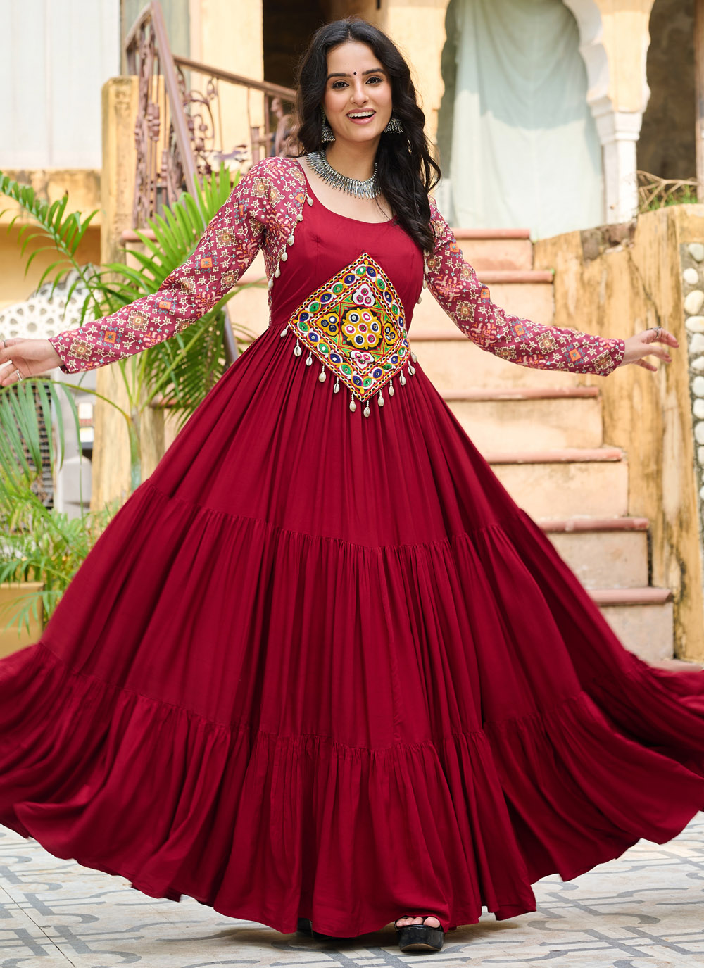 Celebrate the richness of Indian heritage with this Rayon Maroon Gown, adorned with intricate Gamthi work and folk-inspired prints. Designed for women who love ethnic charm with a modern twist. Perfect pick for festive days and Navratri nights.