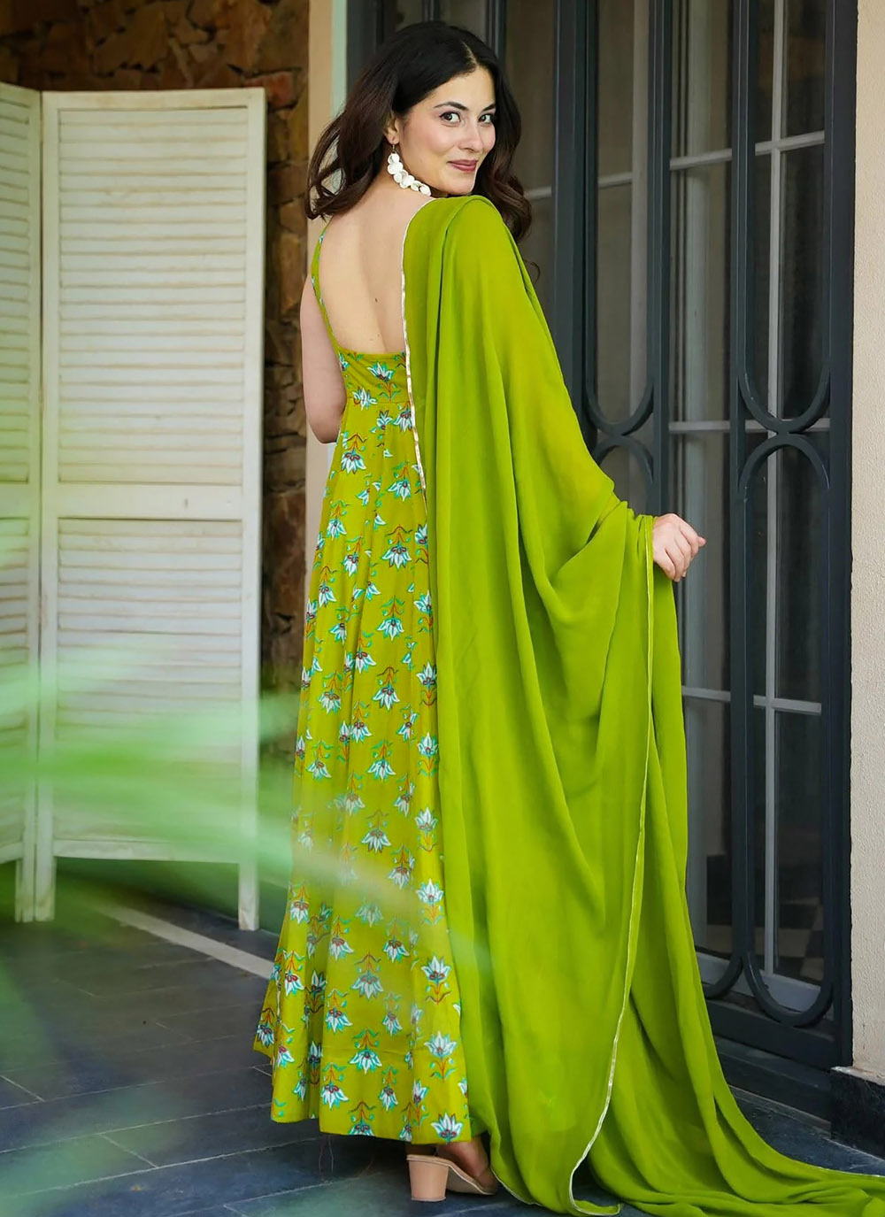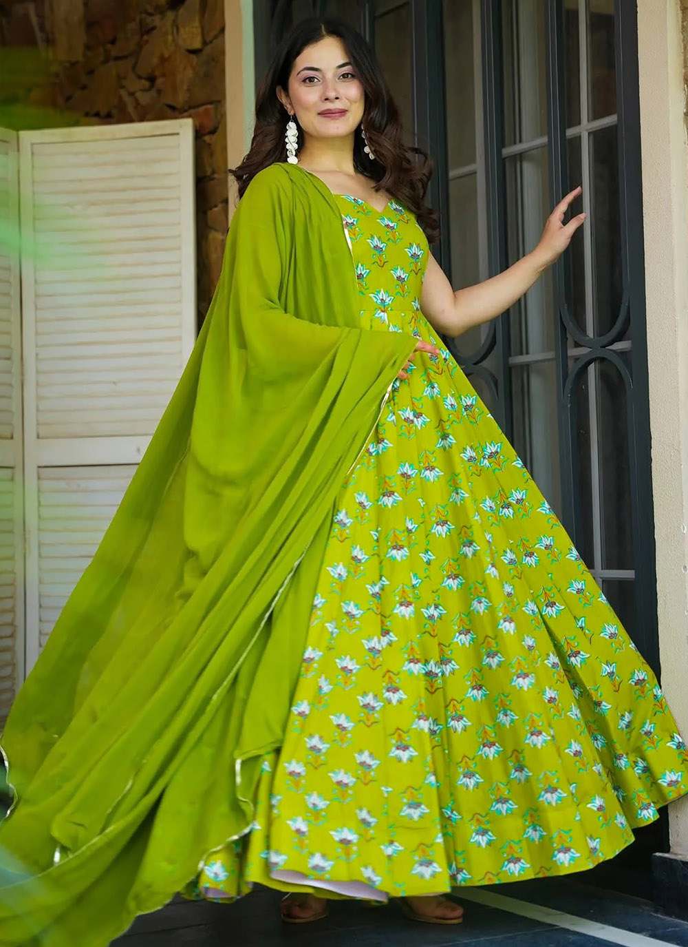 Designed to add grace to your wardrobe, this green digital print anarkali gown comes in a ready-to-wear pattern that suits all body shapes. The stylish digital motifs and matching dupatta provide a refined look. Comes with matching dupatta.