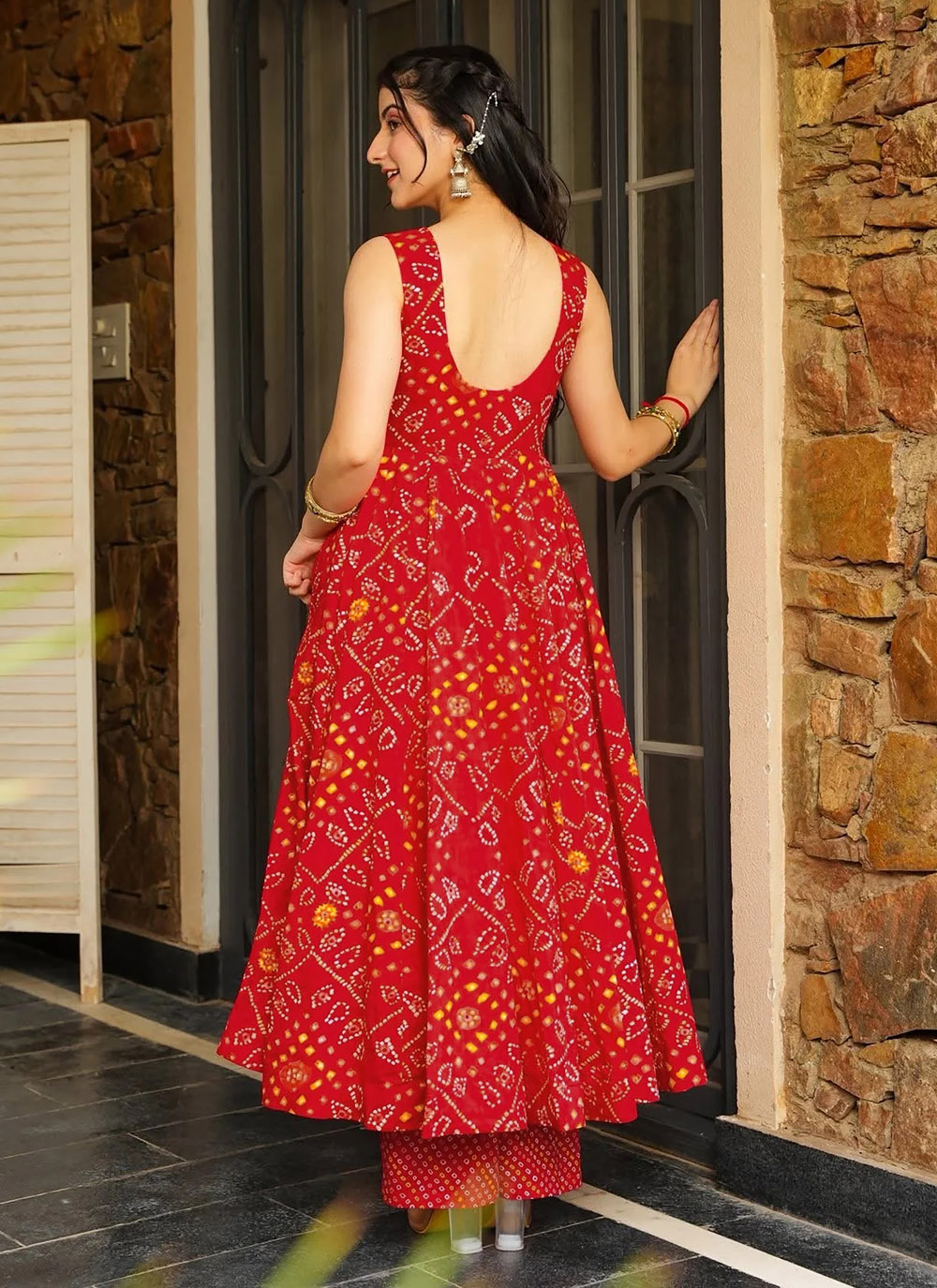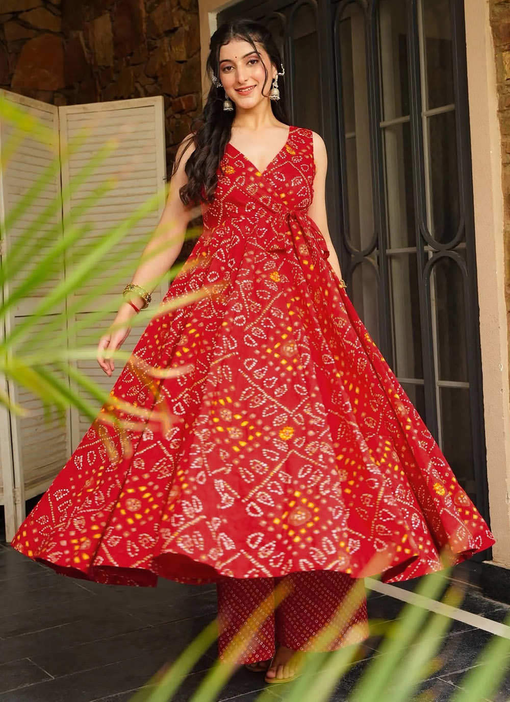 Elevate your ethnic wardrobe with this radiant Red Anarkali Palazzo Suit, beautifully adorned with digital prints. The flowing silhouette and matching palazzo pants create a graceful and stylish appeal for festive events or daytime celebrations. Comes with matching bottom and dupatta.
