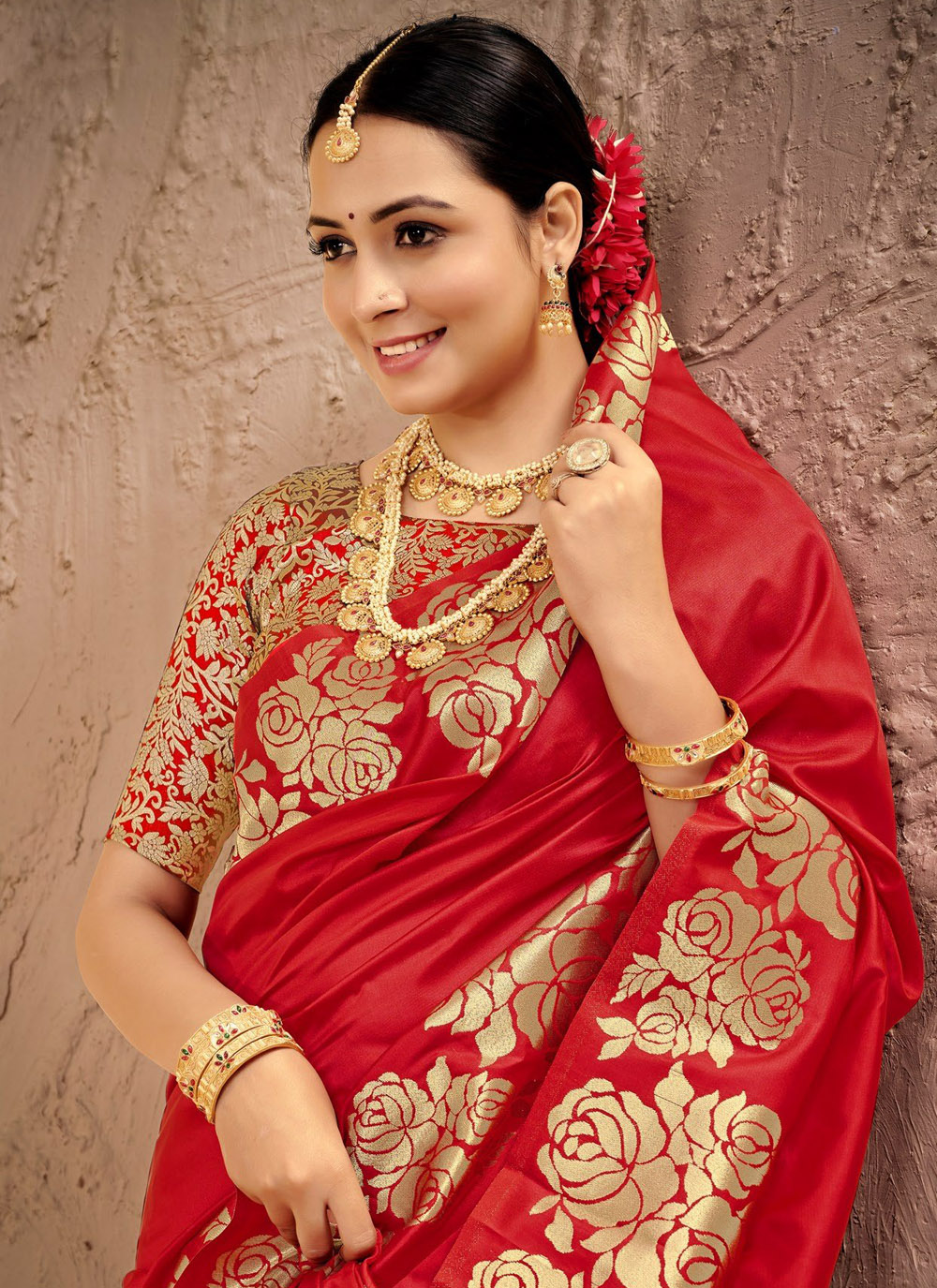 This red Banarasi silk saree is designed to capture the essence of Indian tradition. The intricate zari weaving creates a rich texture that elevates its classic look. The vibrant red shade symbolizes celebration and grace. Comes with matching blouse.