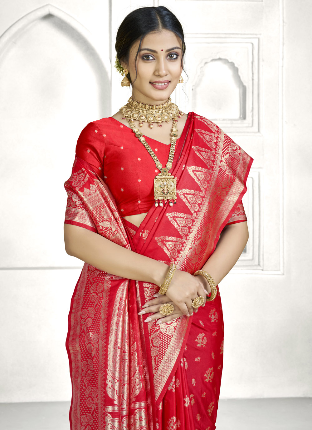 Crafted for regal elegance, this red Banarasi silk saree features intricate zari weaving that enhances its traditional charm. The vibrant red shade paired with classic motifs creates a striking festive look. Comes with matching blouse.