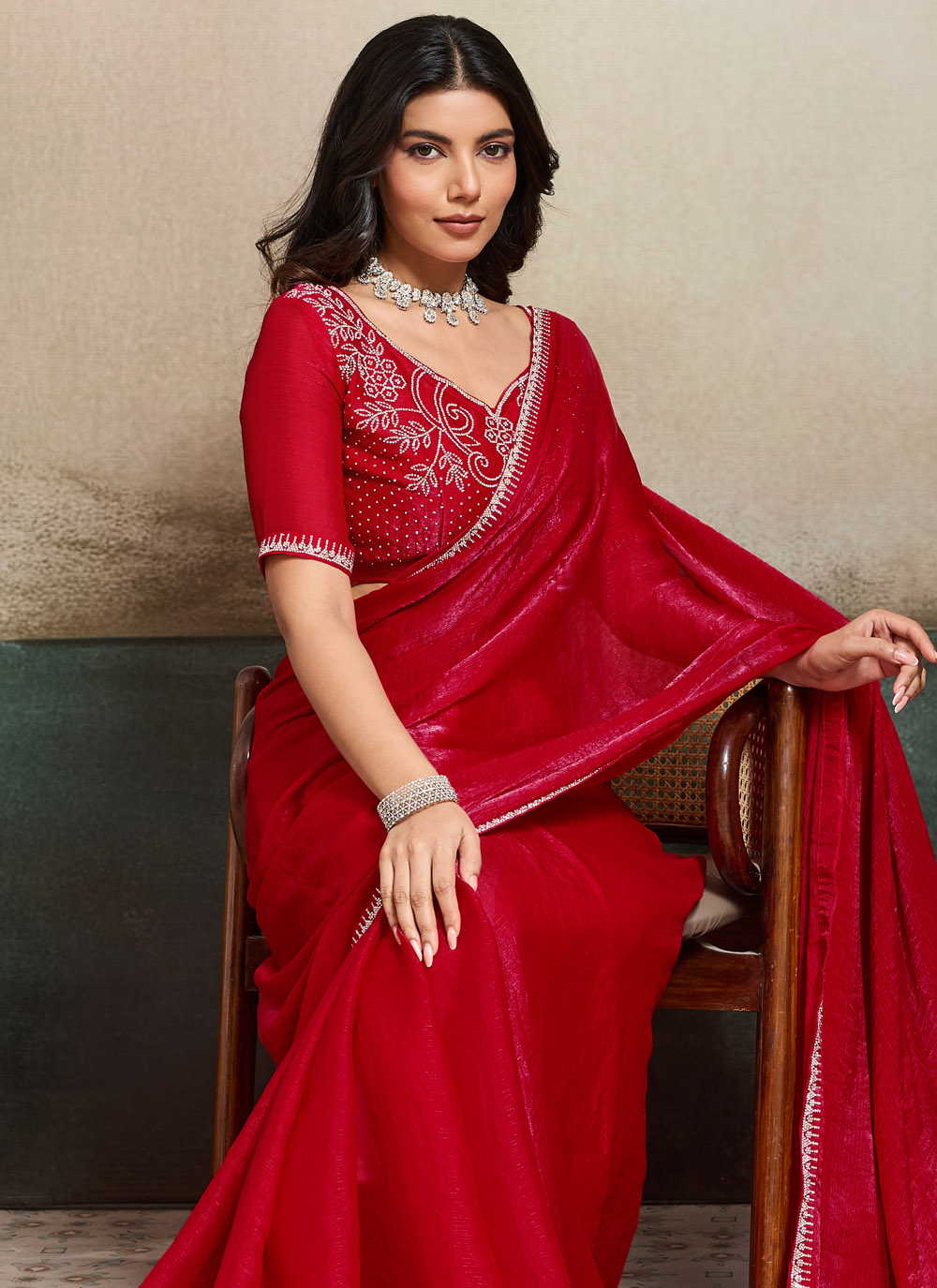Buy this elegant red chiffon saree that blends traditional charm with a trendy look. The stylish border work adds sophistication, while the soft chiffon fabric offers effortless grace. Comes with matching blouse.