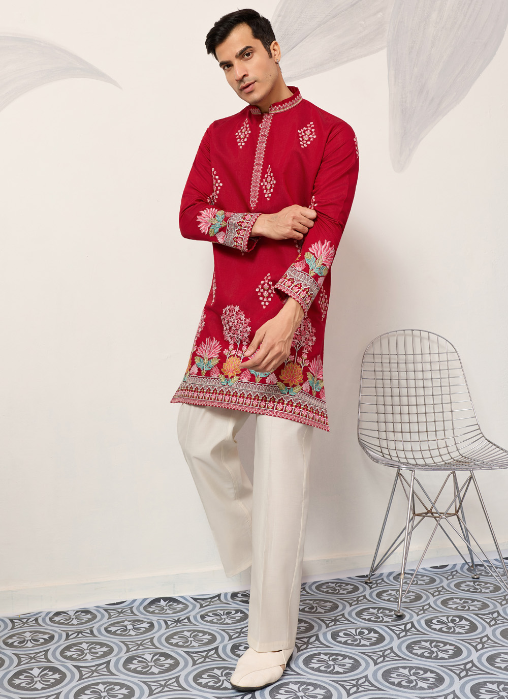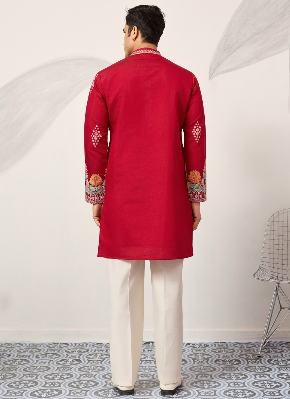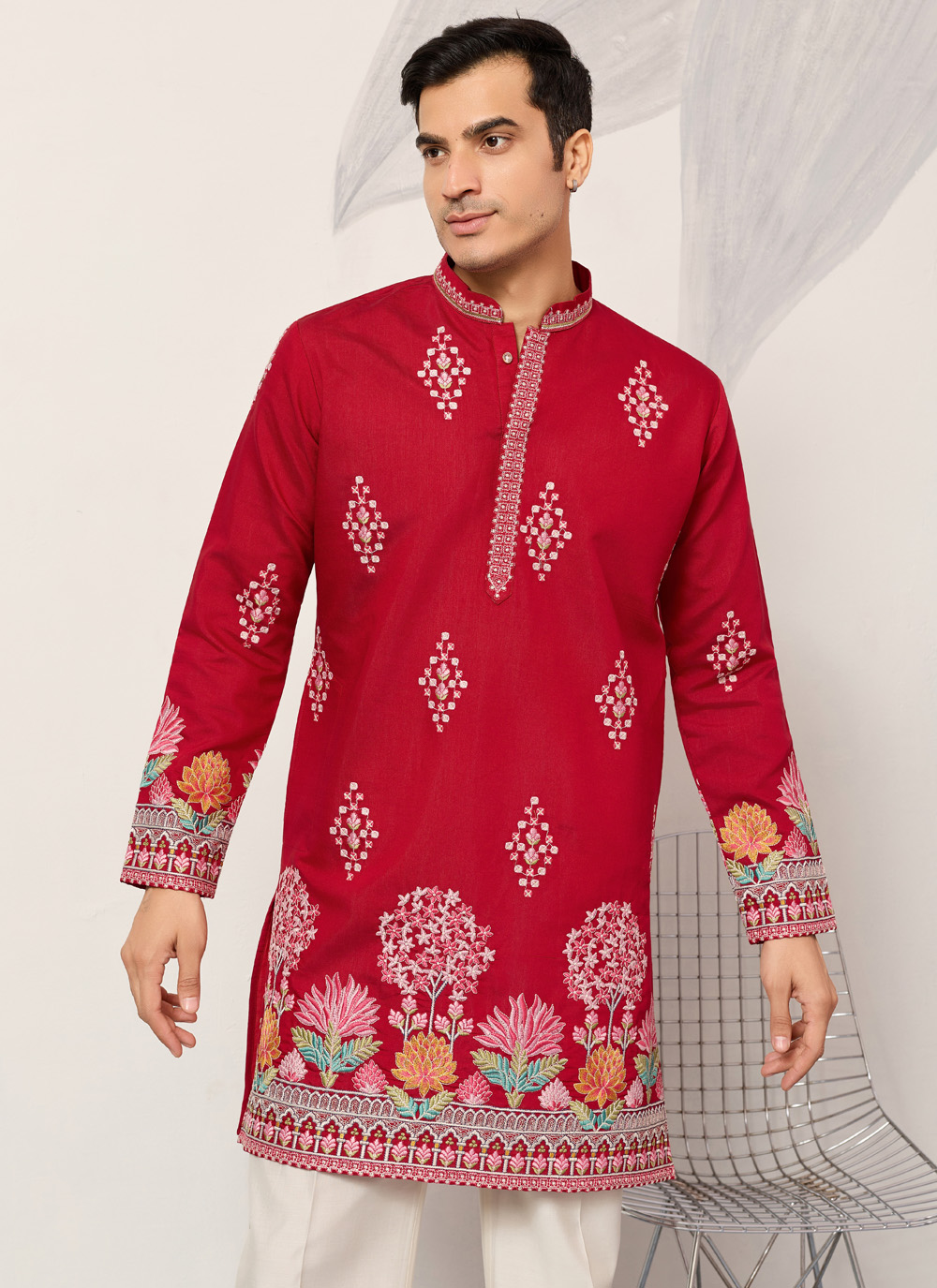 Shop this red embroidered viscose silk kurta for a timeless and graceful ceremonial outfit. The intricate embroidery paired with soft fabric creates a dignified ethnic look.