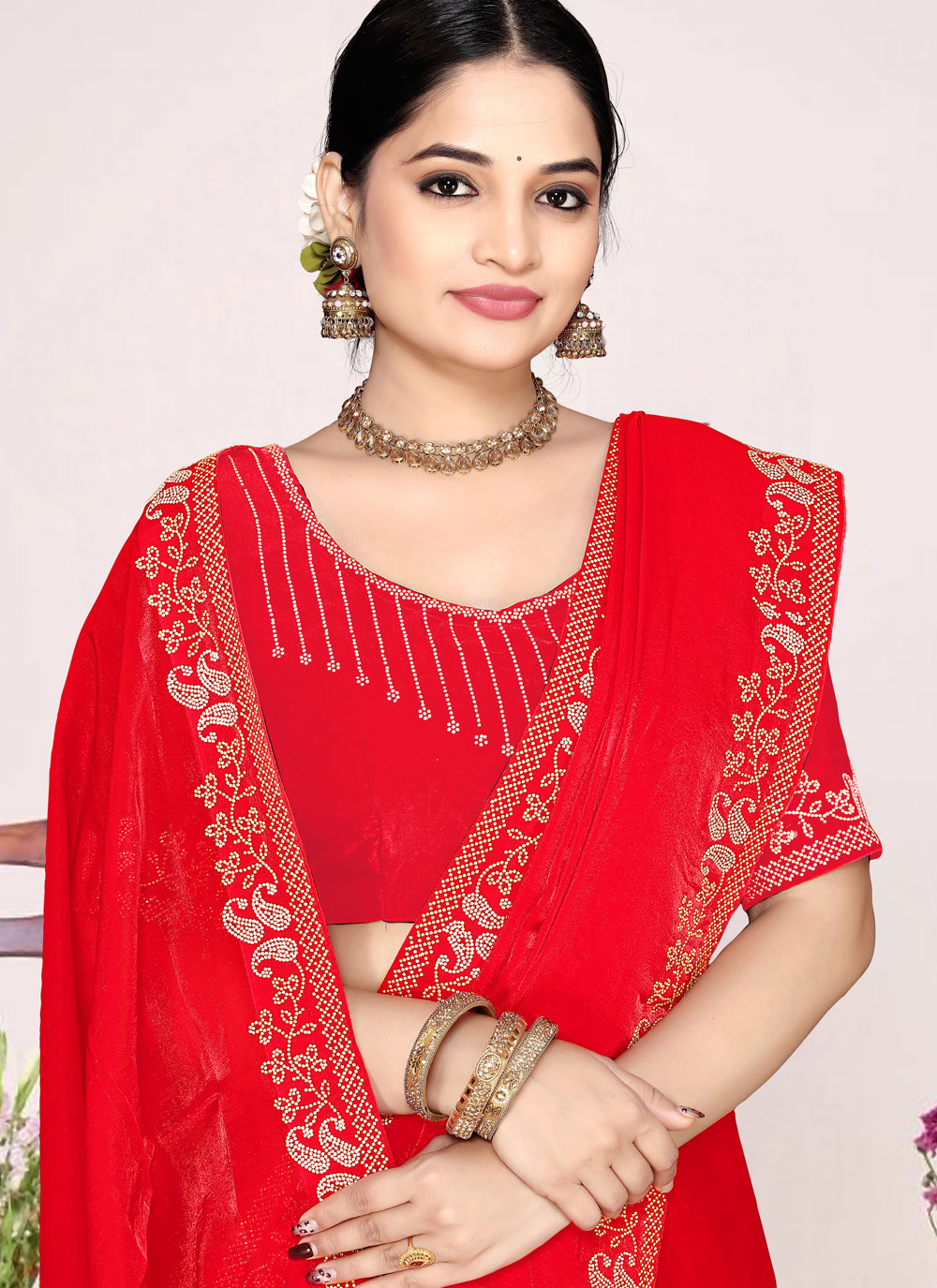 This Red Fandy Satin Silk Designer Saree combines traditional elegance with modern craftsmanship. The intricate zarkan detailing enhances the overall appearance, creating a gentle shimmer that complements the rich red tone. Comes with matching blouse.