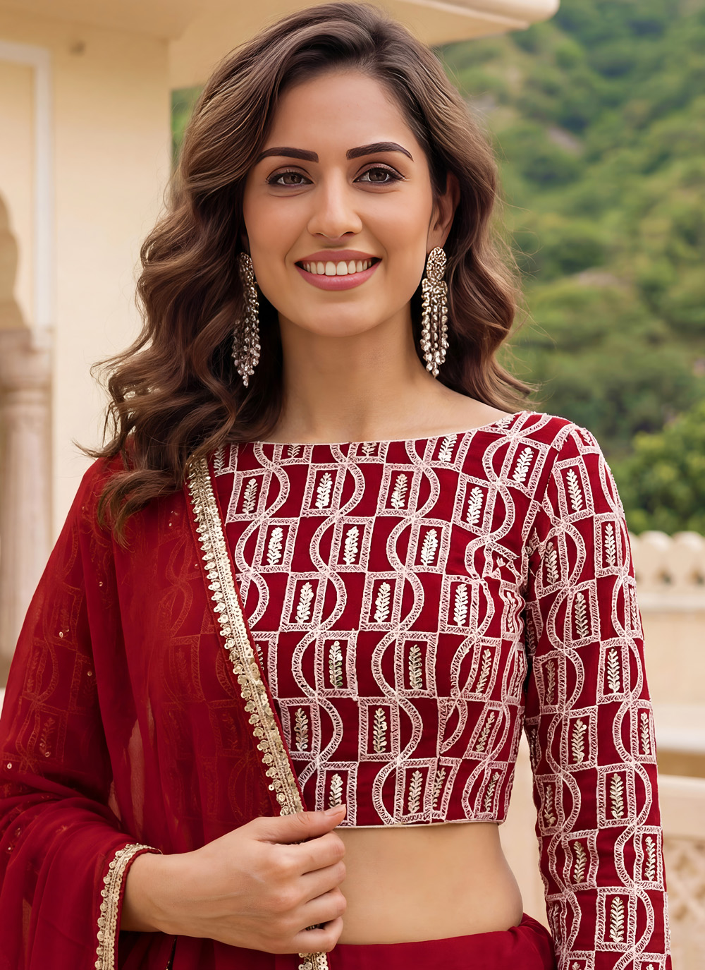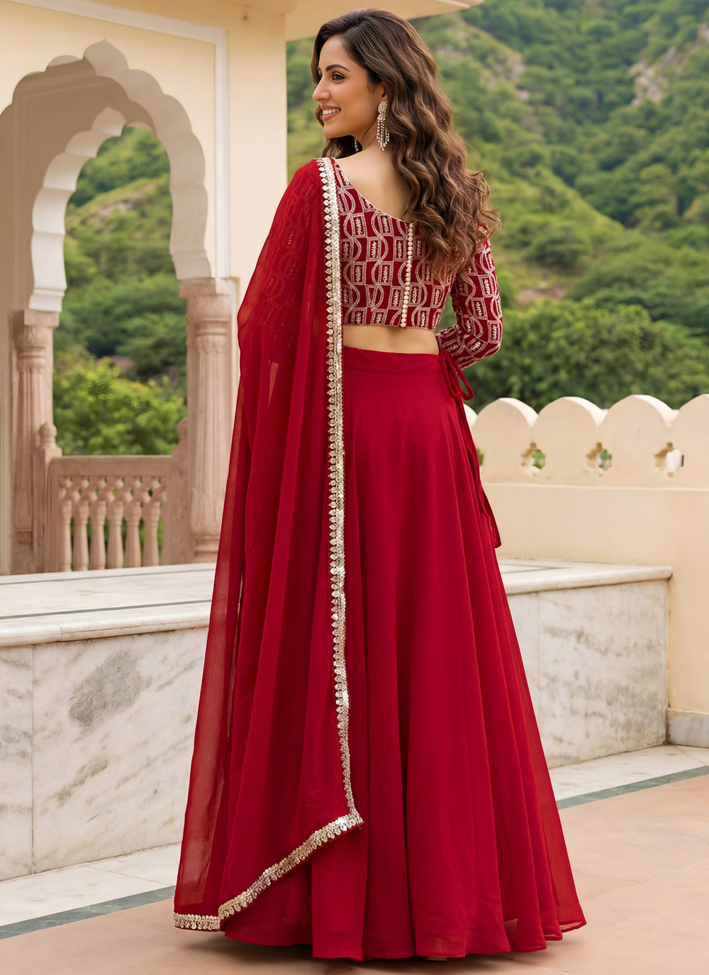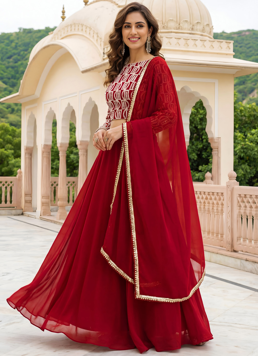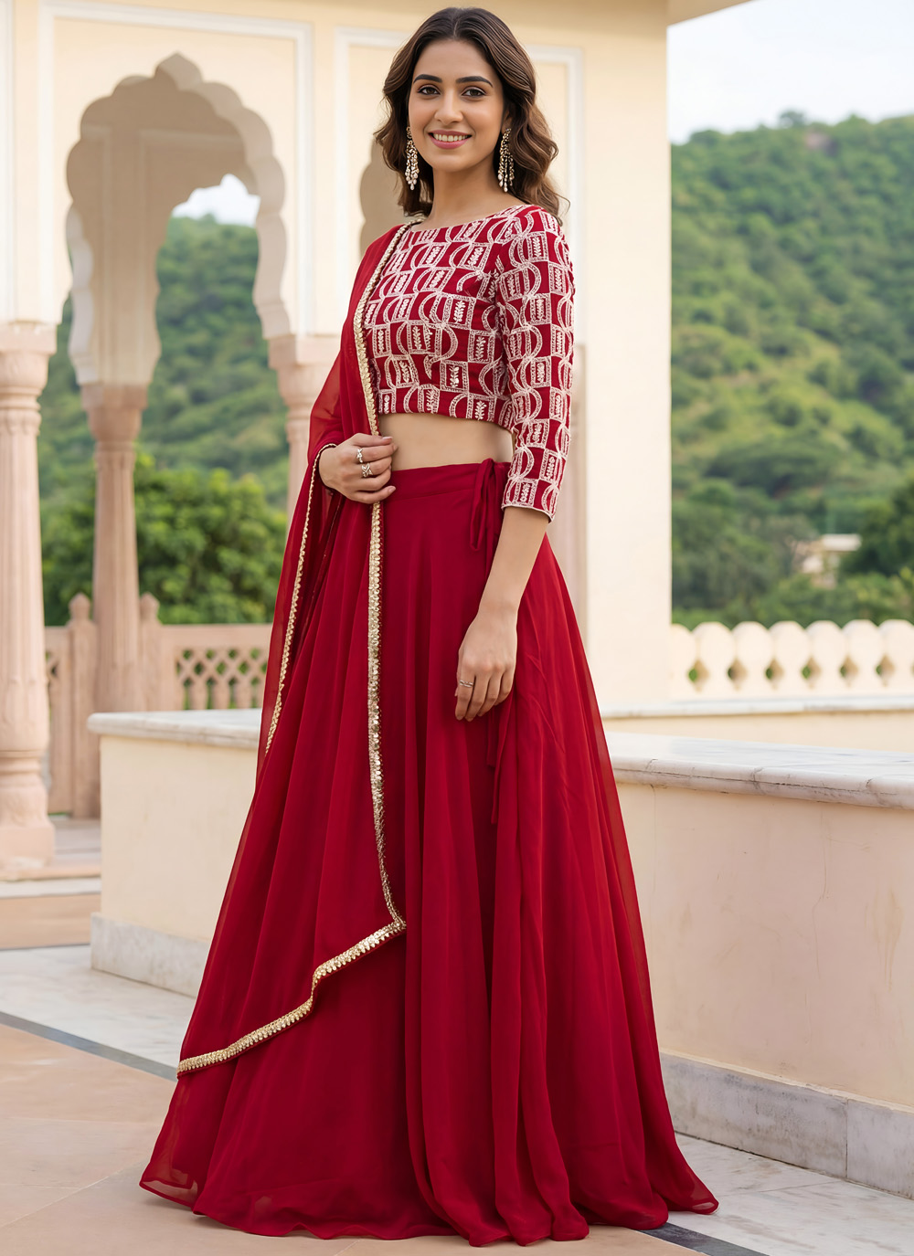 Add timeless glamour to your celebration wardrobe with this Red georgette embroidered lehenga choli. Designed with detailed thread, zari, and sequins work, it reflects rich ethnic artistry. Ideal for receptions, festive functions and special occasions Comes with matching choli and dupatta.