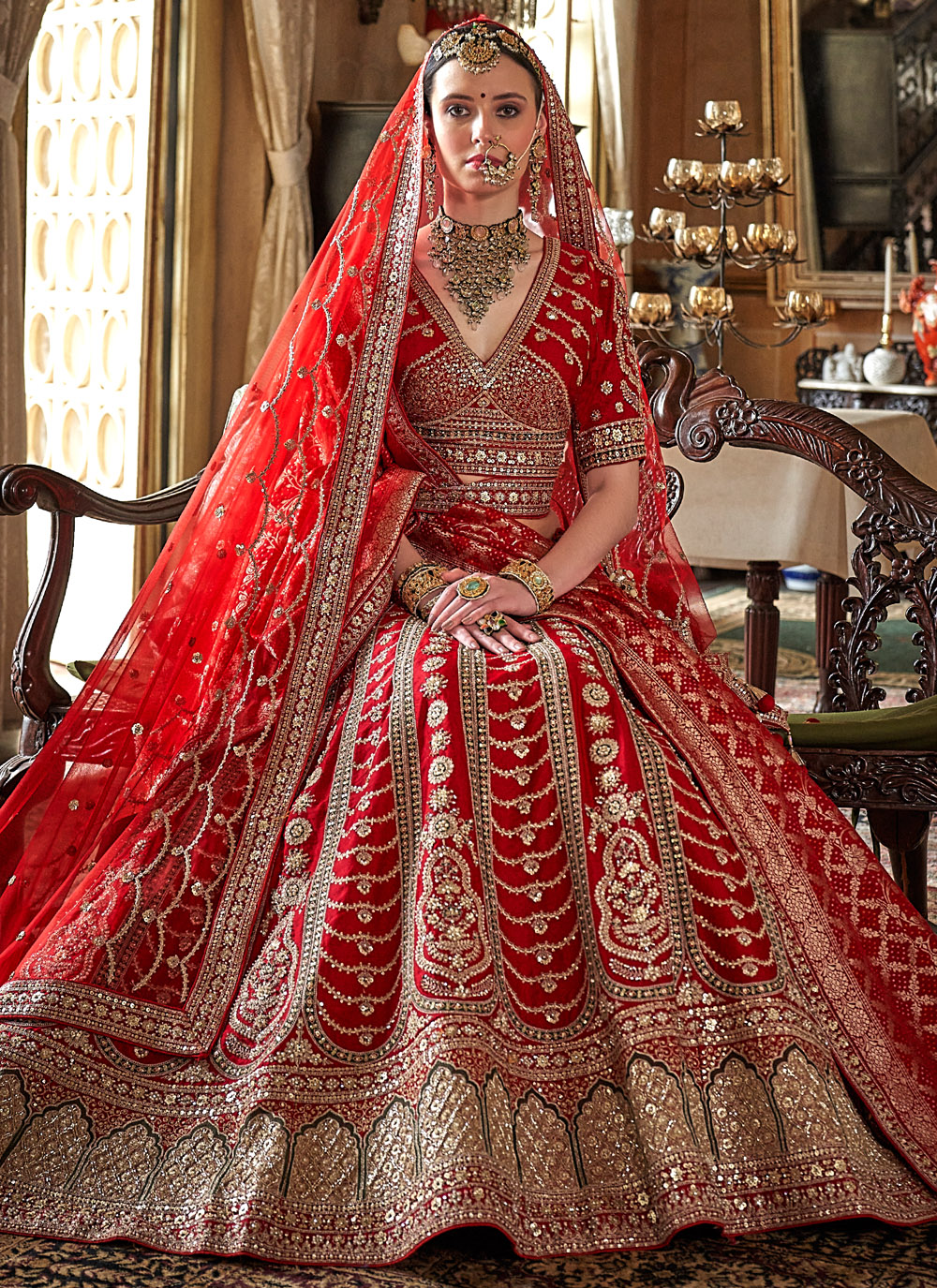 This red bridal silk lehenga choli, featuring exquisite embroidery with pearls, sequins, stones, and zari threadwork. The A-line silhouette provides a flattering fit, while the rich silk fabric enhances its royal appeal, perfect for wedding ceremonies and receptions. Comes with matching choli and dupatta.
