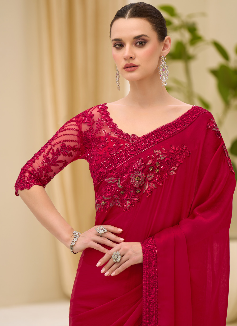 This elegant red saree crafted in satin chiffon offers a graceful drape and timeless charm. The beautifully embroidered border enhances its traditional appeal, making it a perfect choice for weddings, festive gatherings, and cultural celebrations. Comes with matching blouse.