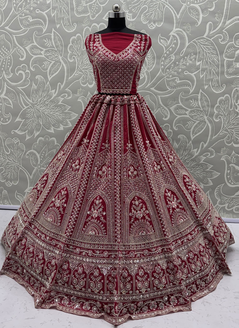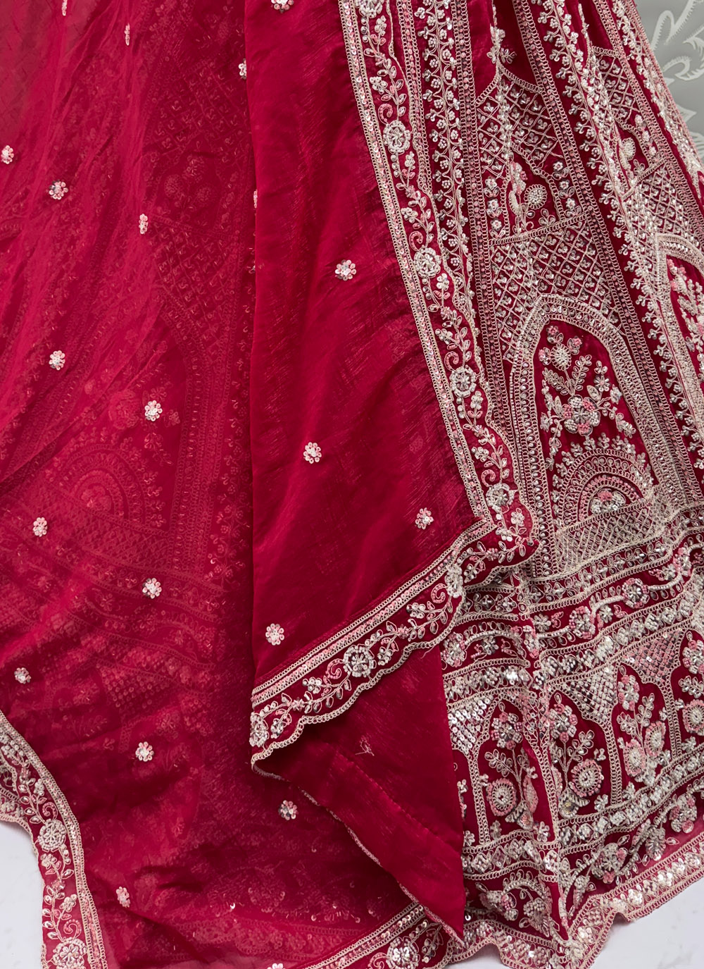 Make every wedding moment memorable with this Red Dori Sequins Embroidered Satin Lehenga Choli. The rich satin base paired with detailed craftsmanship gives a graceful and festive appearance. Perfect for bridal wear and wedding ceremonies. Comes with matching choli and dupatta.