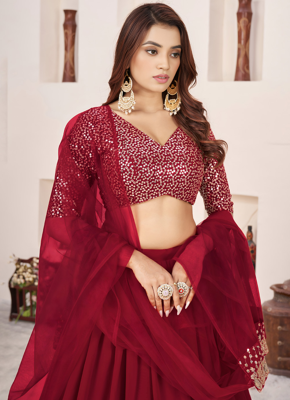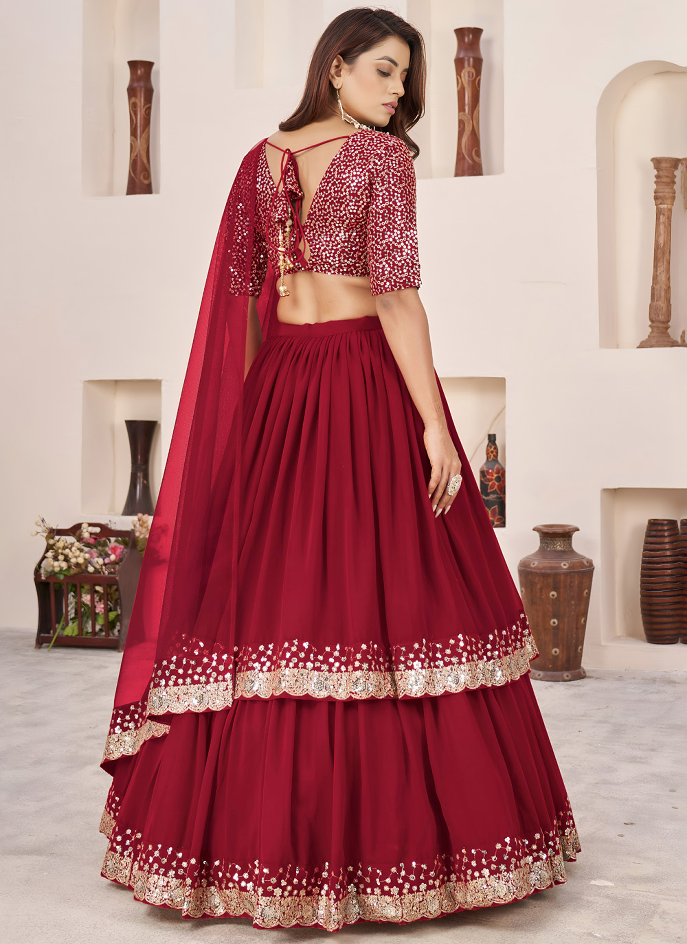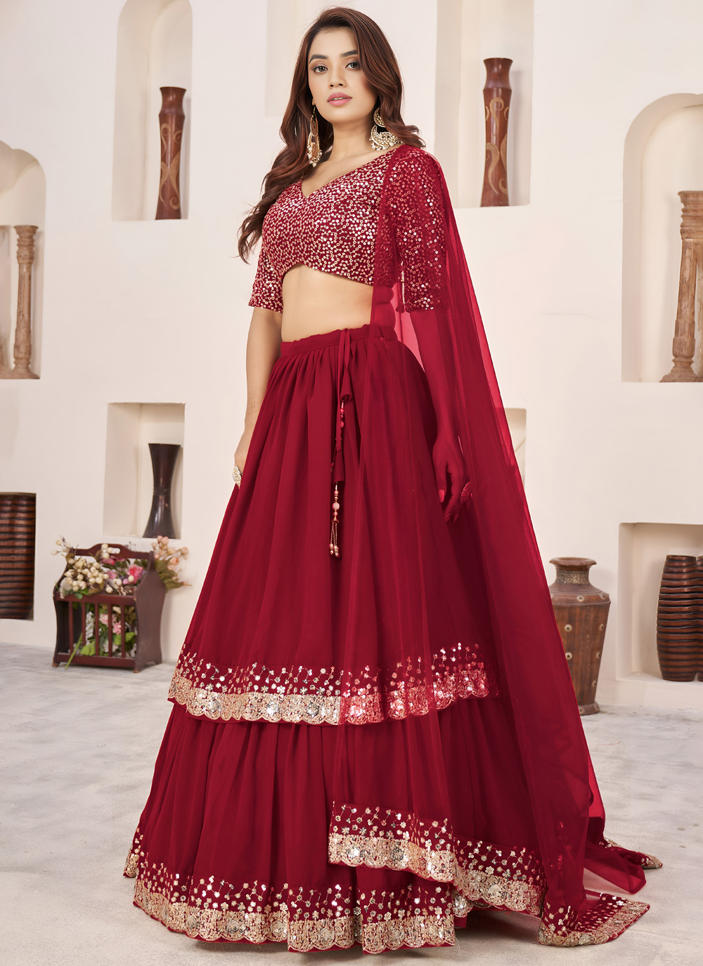 This red georgette lehenga choli is crafted for ceremonial elegance. The lightweight georgette fabric is beautifully enhanced with rich zari and shimmering sequins embroidery, creating a timeless look for traditional celebrations. Comes with matching choli and dupatta.