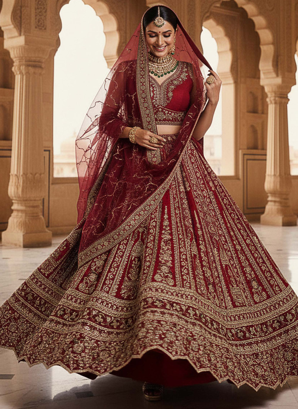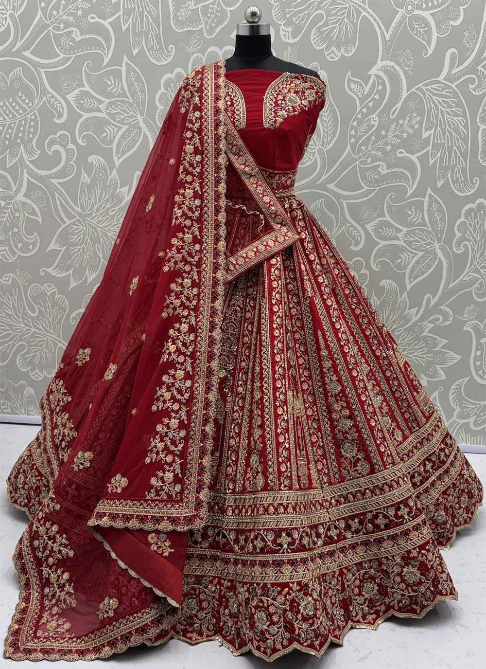 Shine on your wedding day with this red silk lehenga choli, intricately adorned with fancy embroidery, dori work, multi-thread zari, sequins, and diamond studs. Its rich silk fabric ensures a stylish drape, making it perfect for brides seeking a grand and opulent look. Comes with matching choli and dupatta.