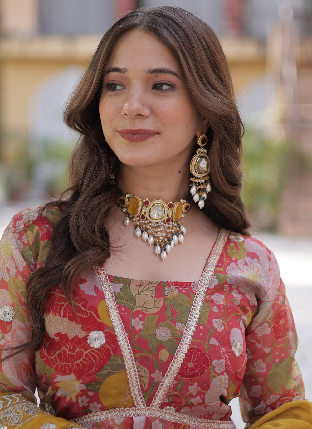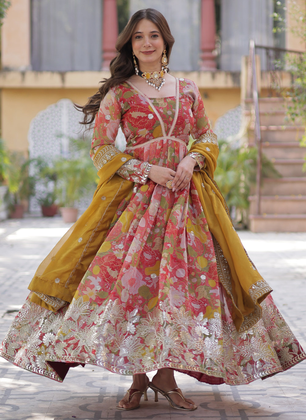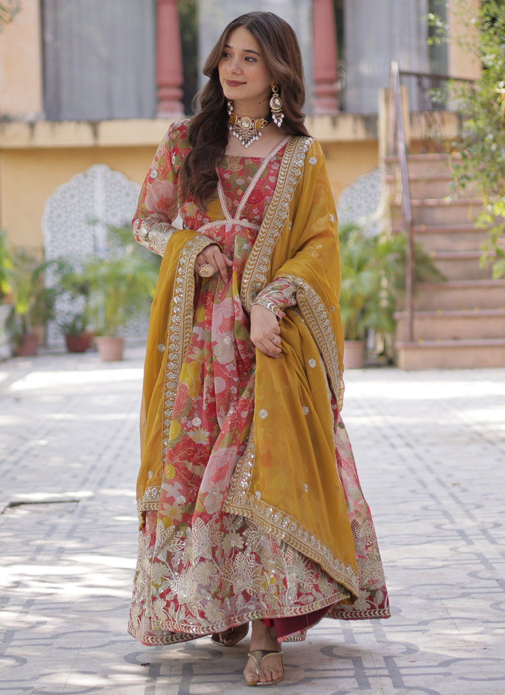 Make a statement in this Red Silk Trendy Gown adorned with digital prints, sequins, and zari embroidery. The rich red tone and shimmering embellishments combine tradition and glam, perfect for receptions, sangeet, or festive nights. Comes with matching dupatta.