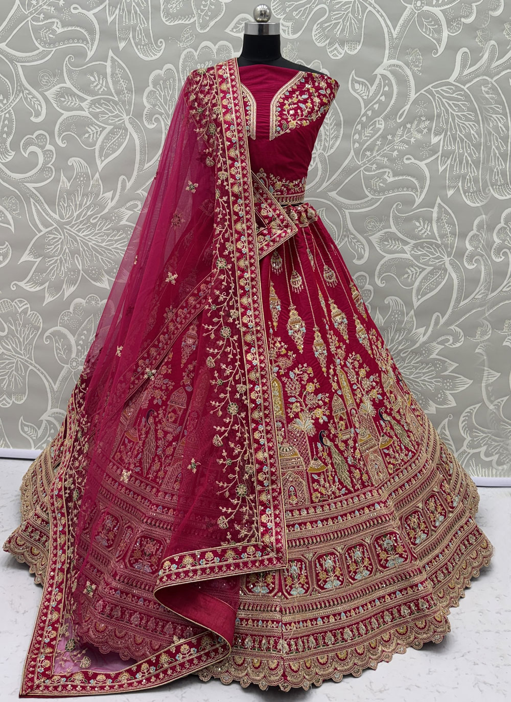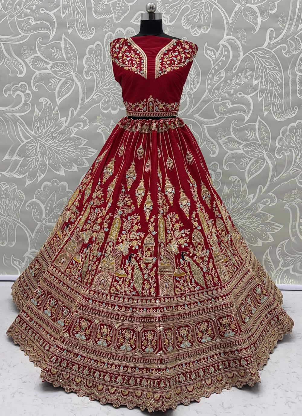 This Red Silk Dori Multi Thread Zari Embroidered Diamond Work Lehenga Choli. The premium silk base offers a refined texture, while the elaborate embroidery combining dori patterns, multi-thread artistry, and zari highlights adds depth and brilliance to the attire. Comes with matching choli and dupatta.