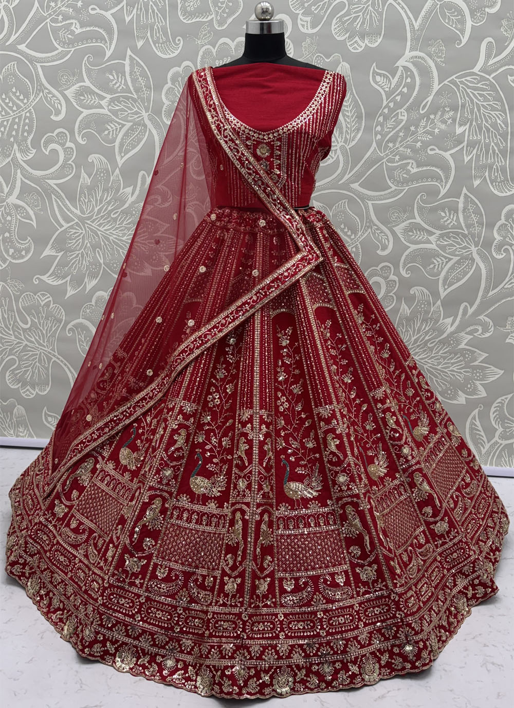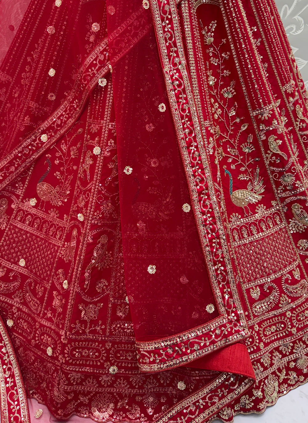 Crafted for special wedding moments, this red embroidered lehenga choli blends classic tradition with modern sophistication. The fine thread and sequins work combined with detailed dori embroidery creates a rich and eye-catching design. Comes with matching choli and dupatta.