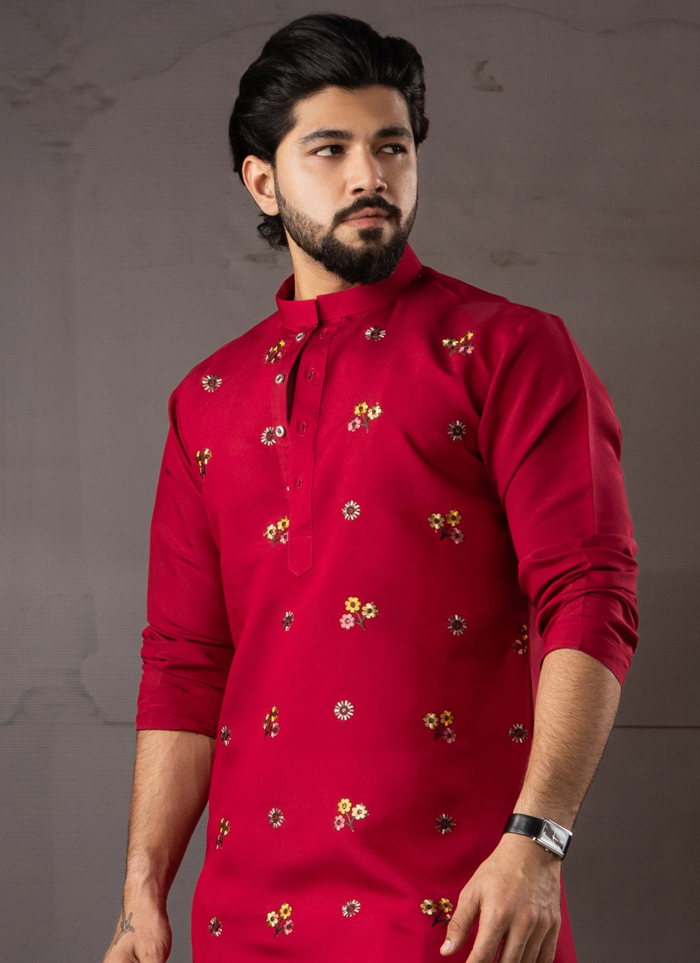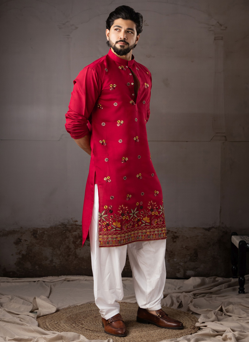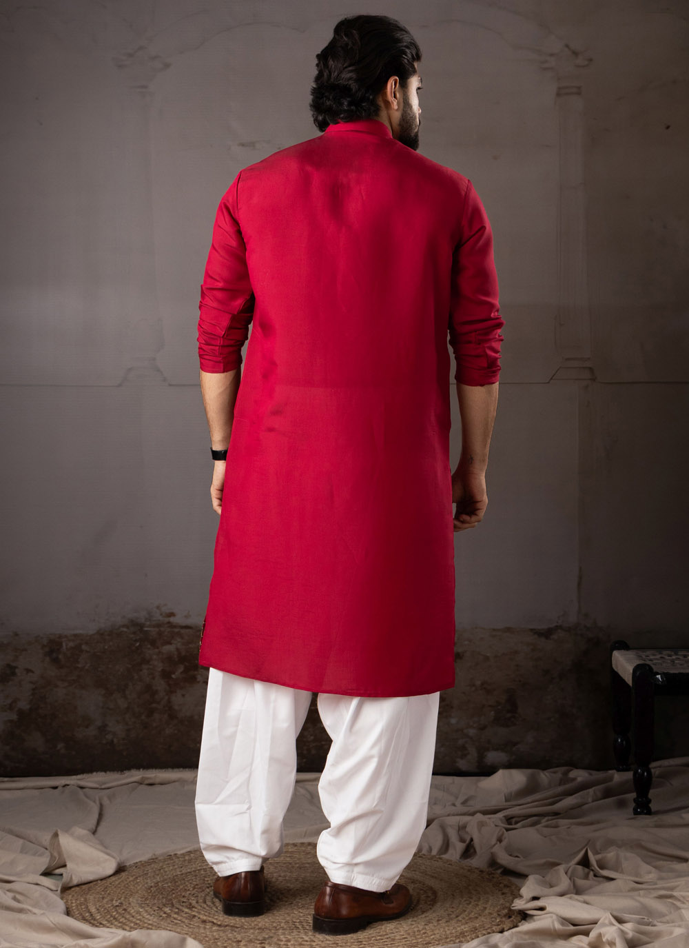 Upgrade your festive wardrobe with this beautifully crafted red silk kurta pyjama featuring elegant embroidered patterns. The vibrant red color symbolizes celebration and cultural richness.