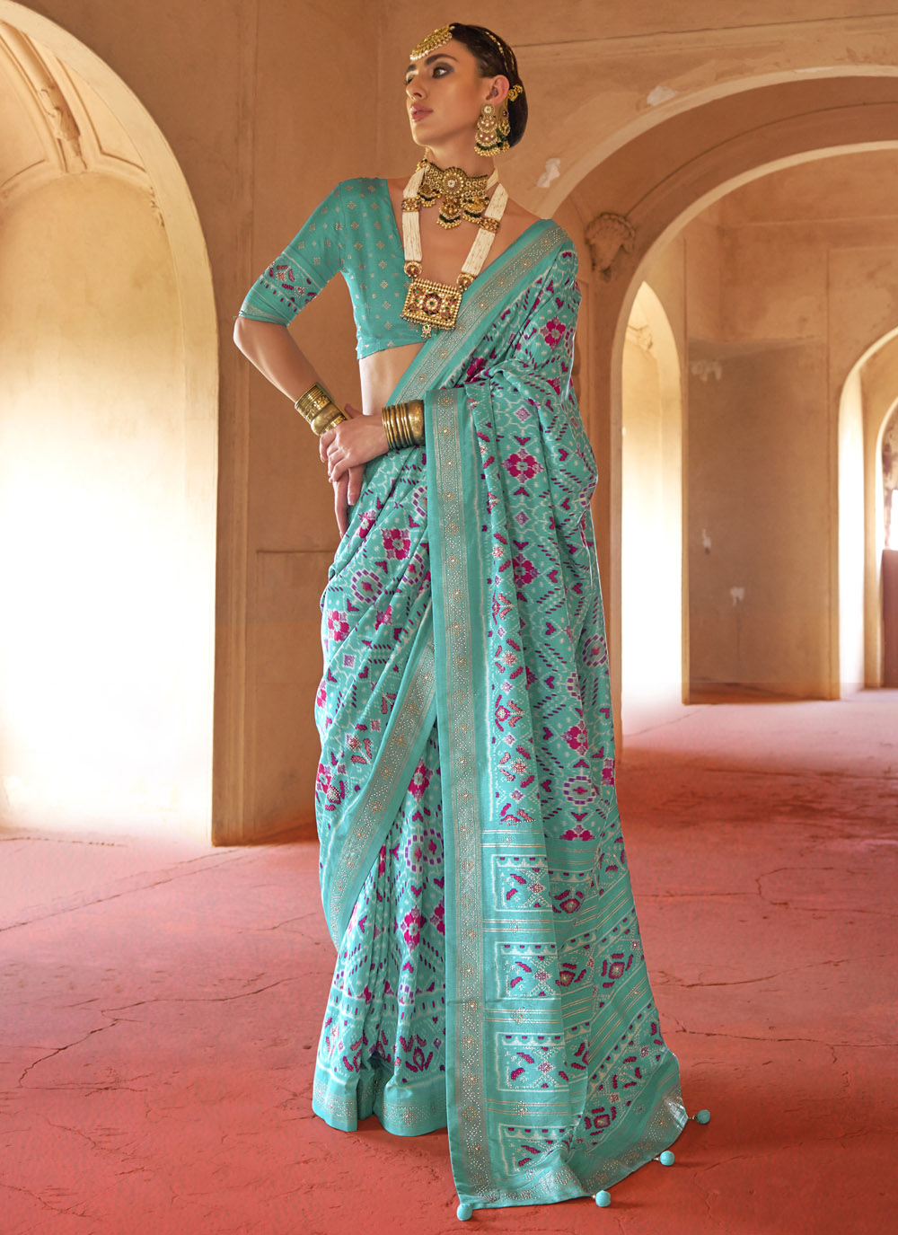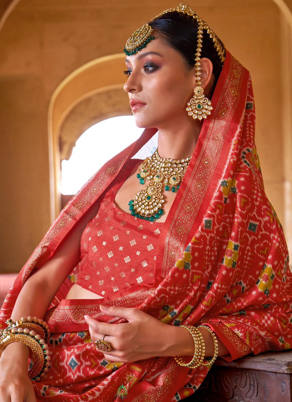 This Red Silk Saree with Patola prints is a graceful fusion of festive charm and ethnic heritage. Its vibrant color palette and intricate detailing make it an ideal choice for ceremonial occasions. Comes with matching blouse.