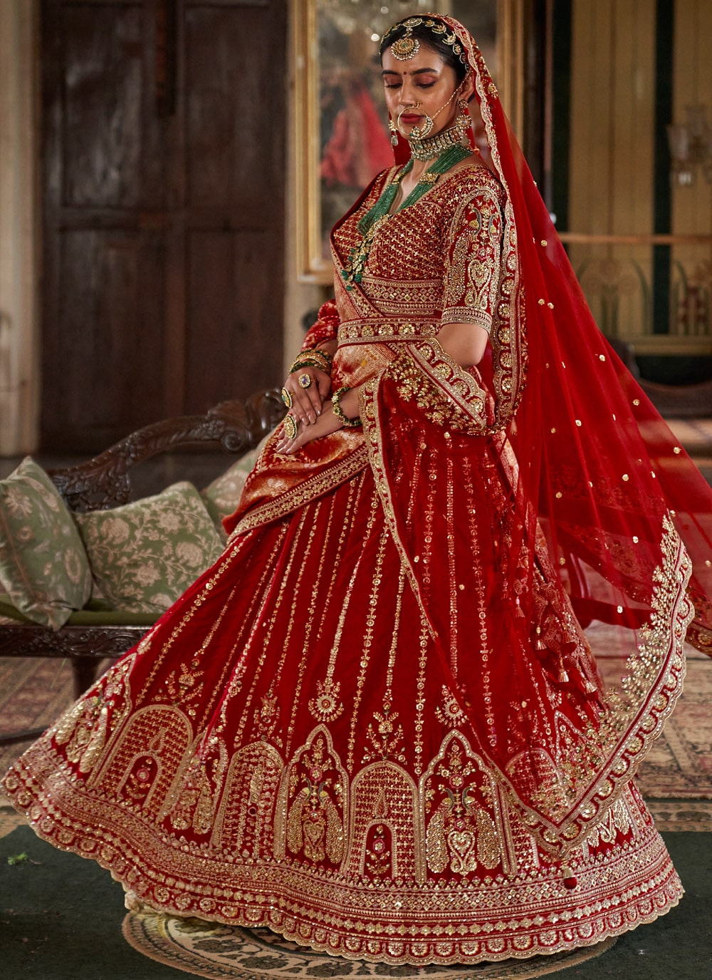 This red lehenga choli is adorned with sequins, pearls and stone embellishments. Thread embroidery adds richness to the outfit. An ideal choice for weddings, receptions or festive functions. Comes with matching choli and dupatta.