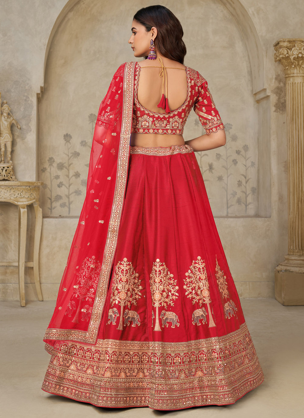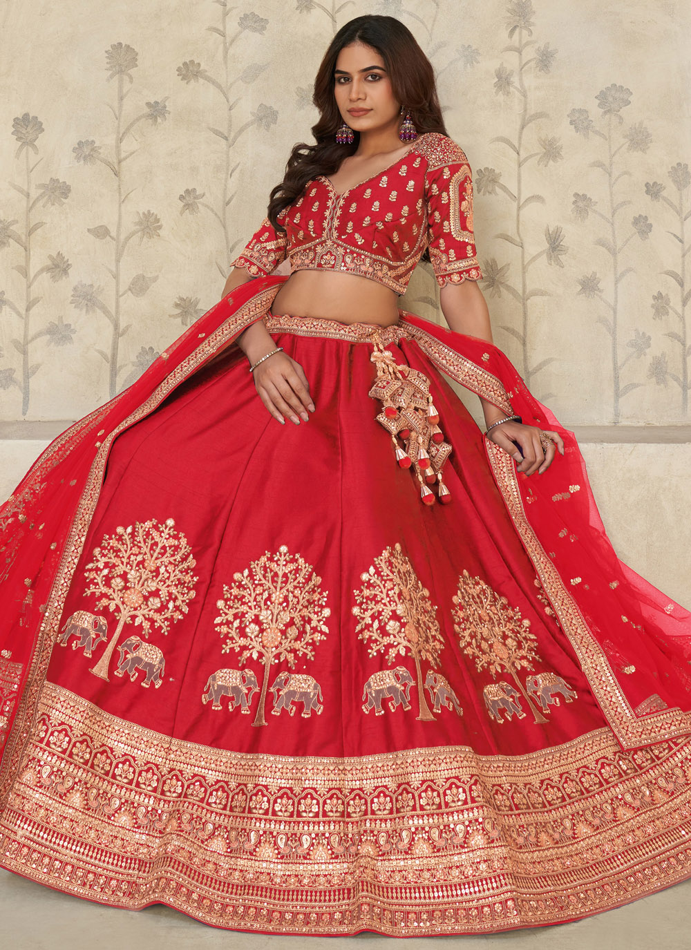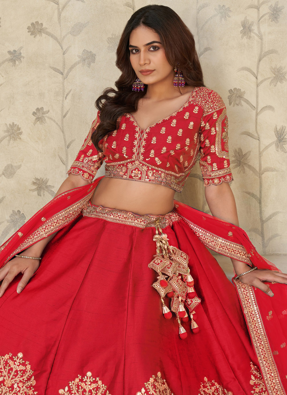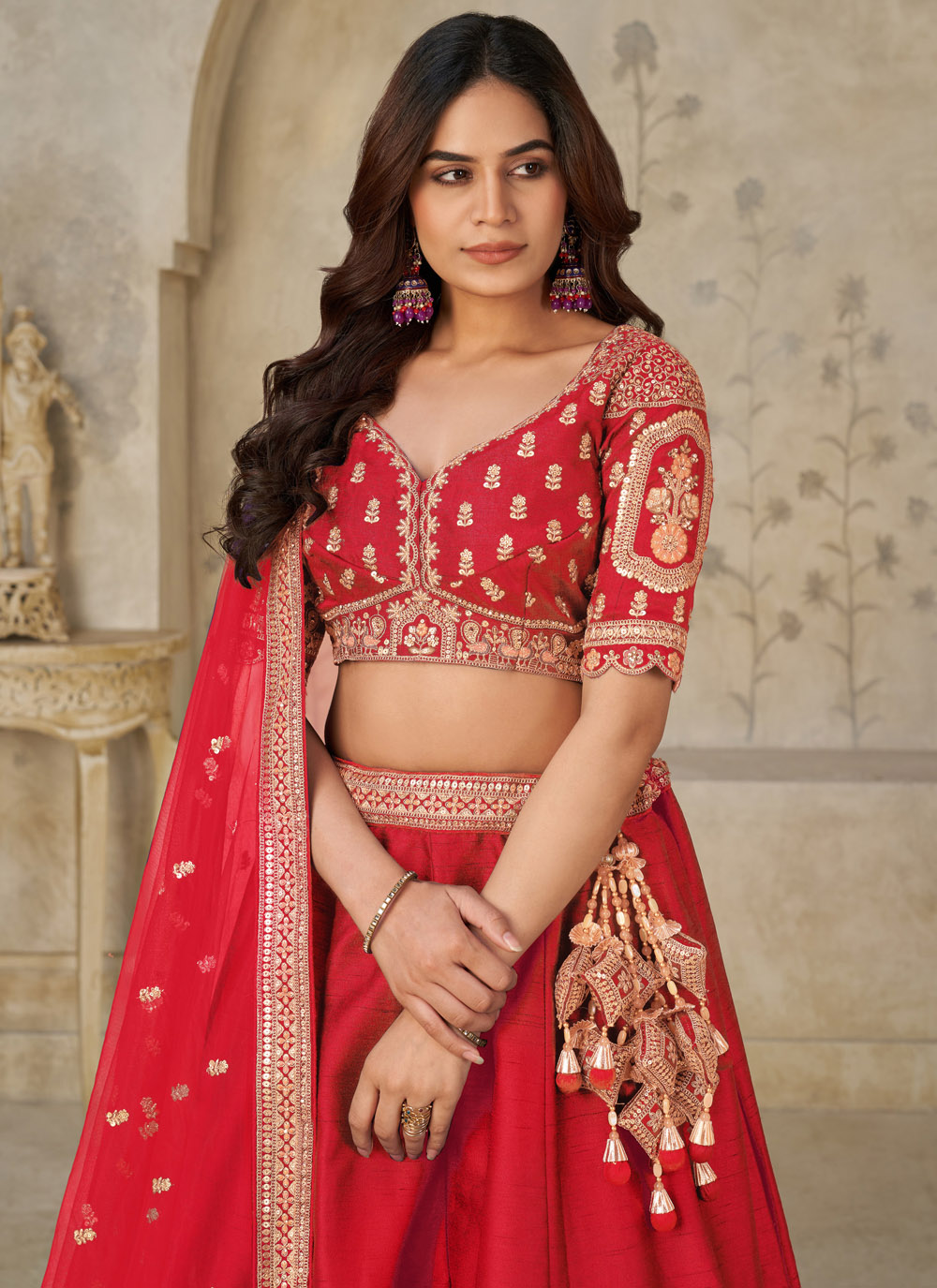 This engagement-ready red silk lehenga choli blends traditional craftsmanship with modern glamour. The vibrant red shade symbolizes celebration, while the intricate embroidery adds depth and royal charm. Comes with matching choli and dupatta.