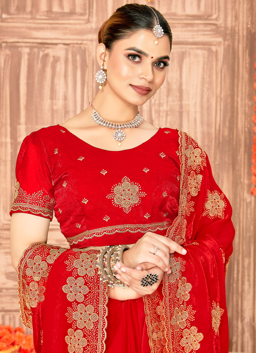 This designer saree in classic red silk is adorned with delicate zari motifs enhanced with Swarovski accents for a glow. The elegant detailing and soft drape make it a perfect outfit for special gatherings and festive nights. Comes with matching blouse.
