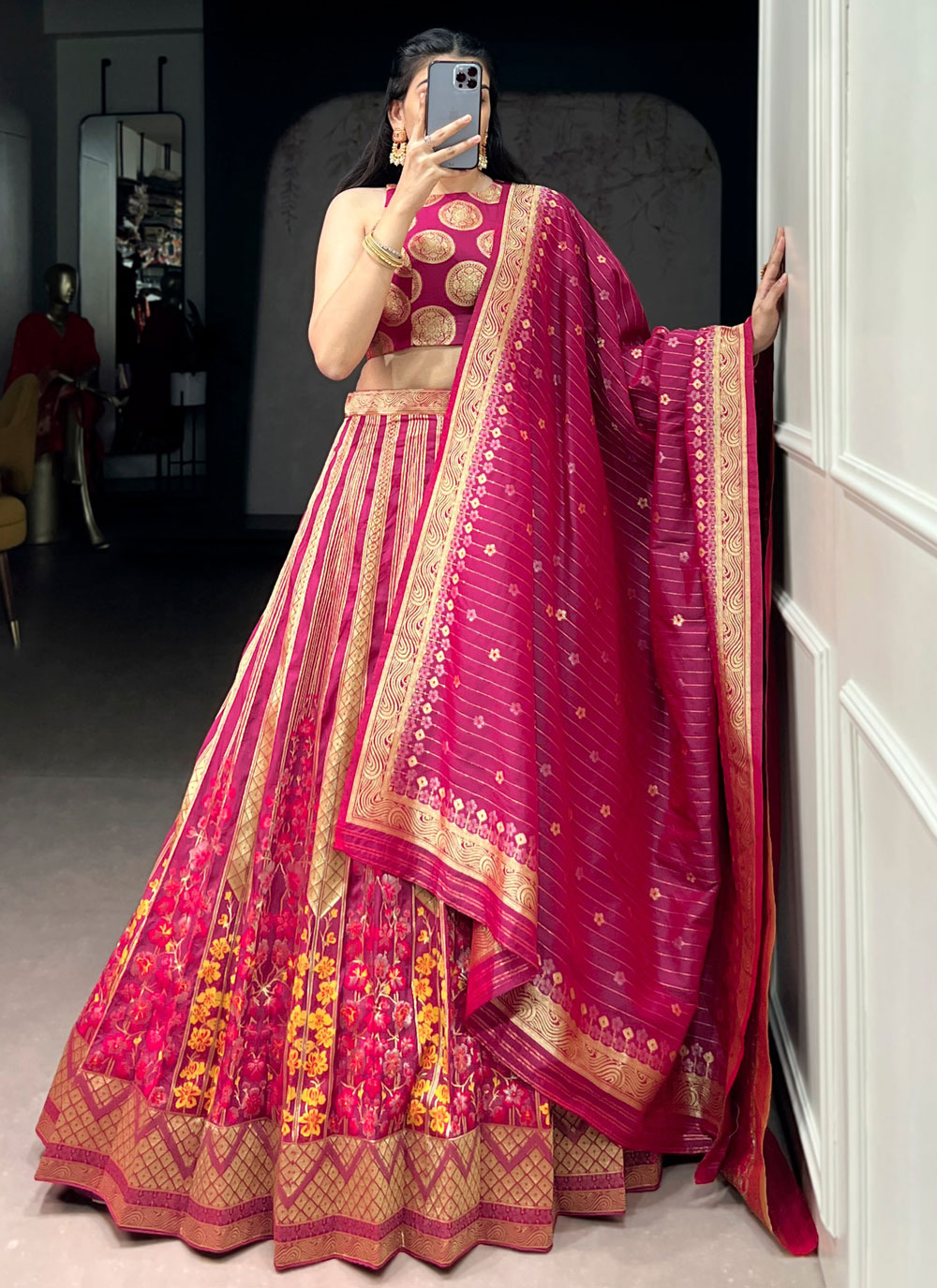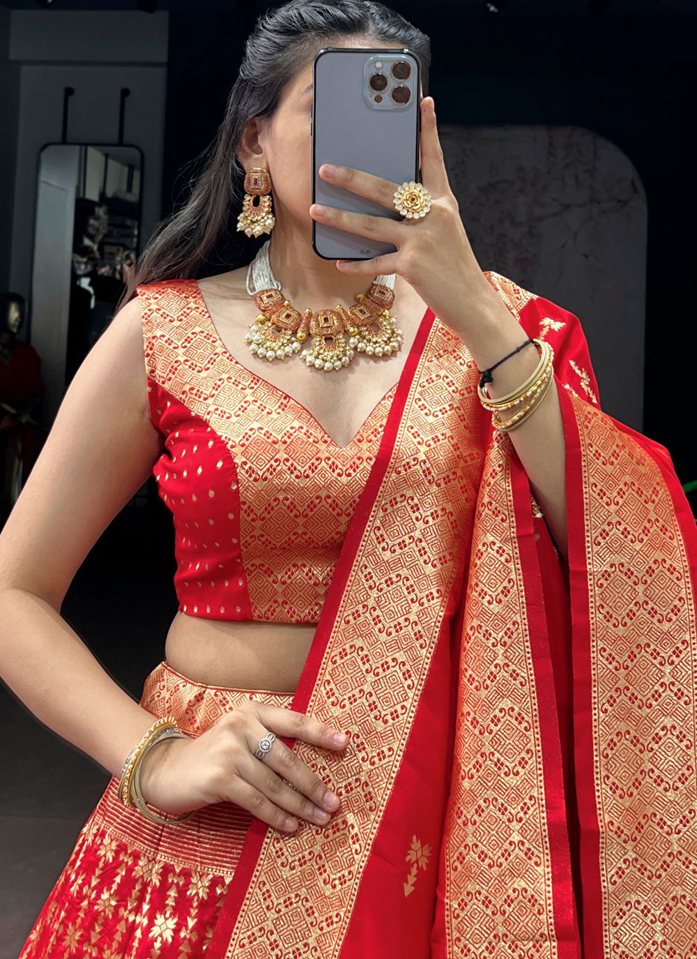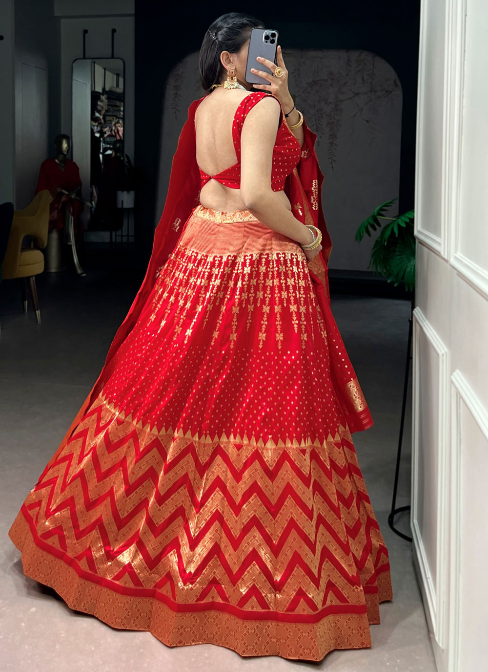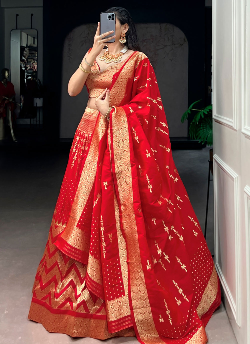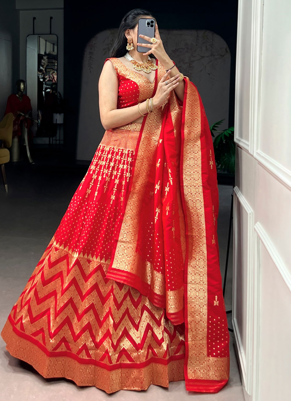 The Red Silk Zari Weaving Work Trendy Lehenga Choli combines timeless craftsmanship with contemporary design. The detailed zari woven patterns highlight artistic elegance, while the rich silk fabric adds depth and shine. Comes with matching choli and dupatta.