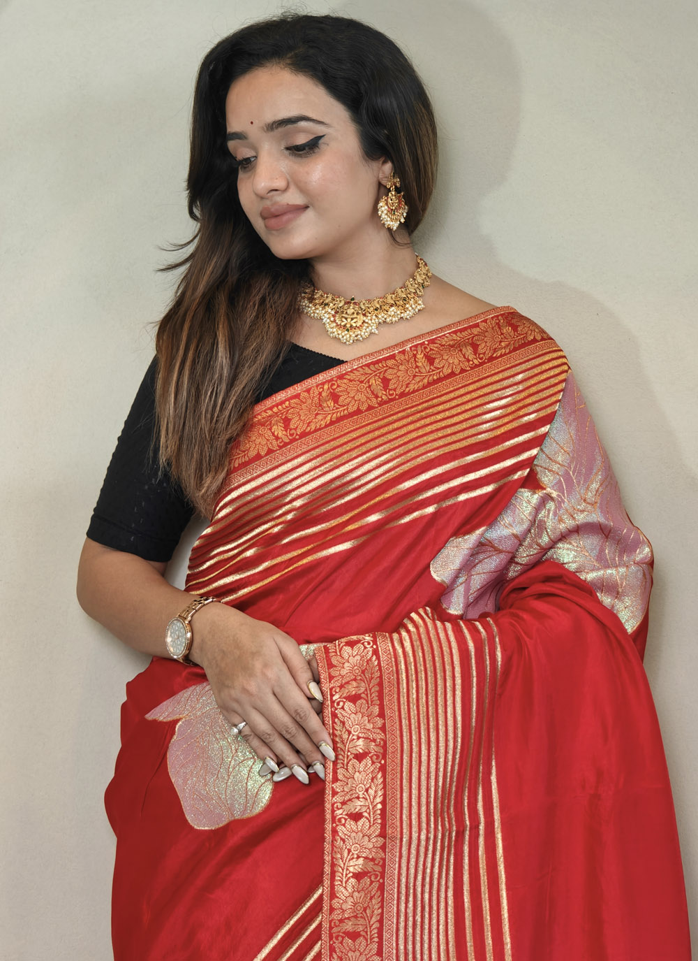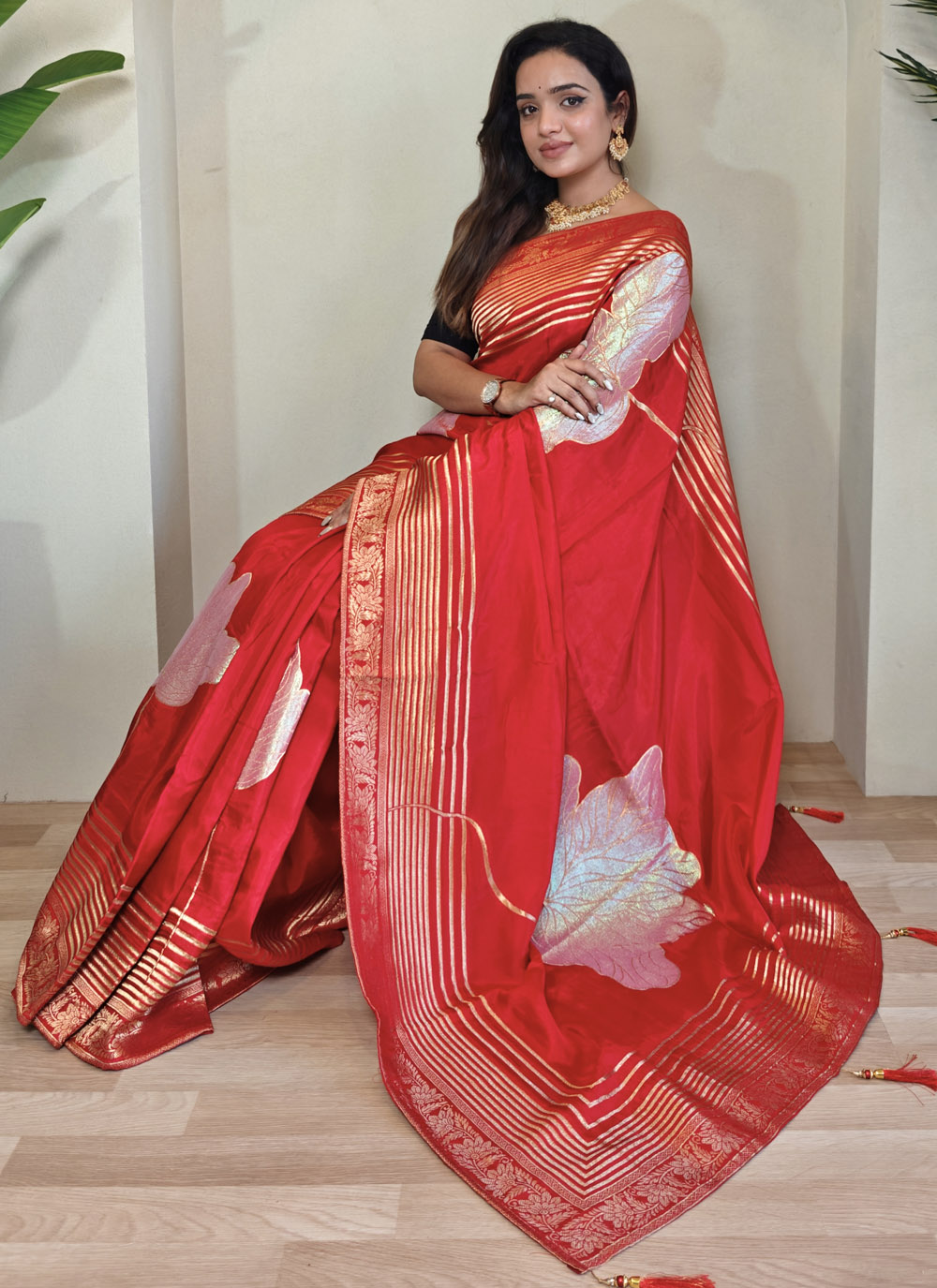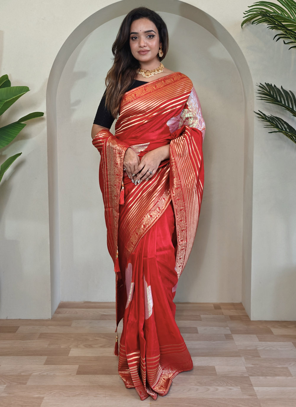 This traditional red saree is crafted in high-quality silk and embellished with stunning gold zari weaving. The lightweight silk ensures all-day comfort without compromising on the richness of design, perfect for temple visits, pujas, and family functions. Comes with matching blouse.