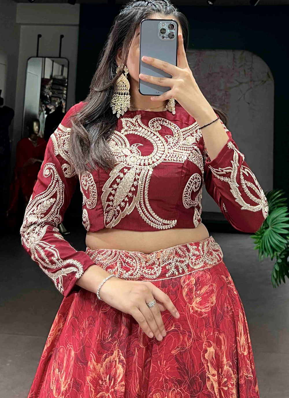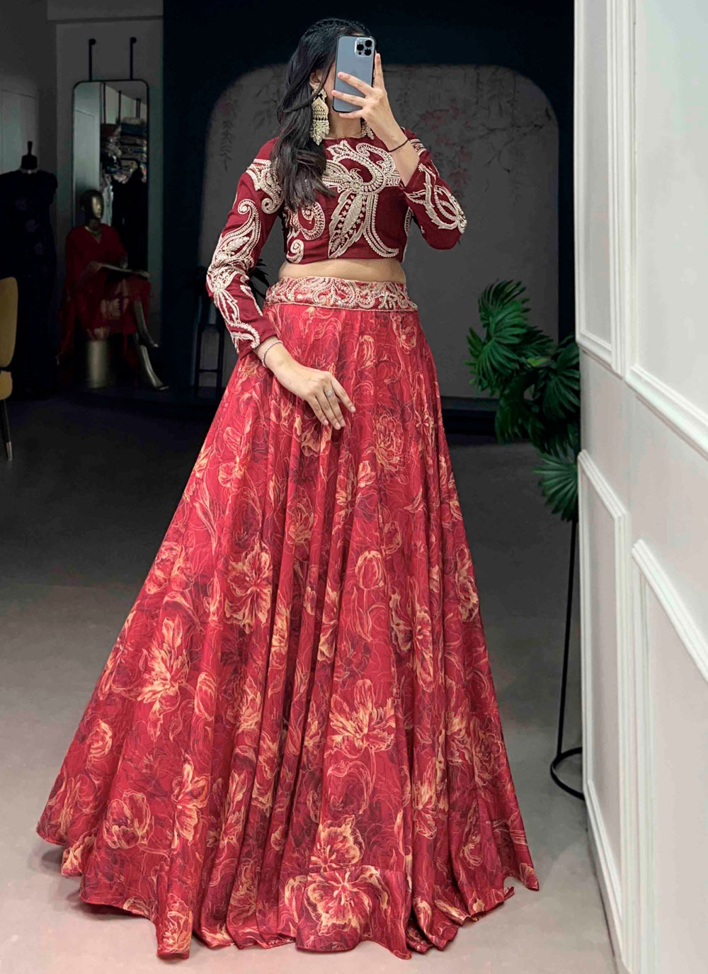 Red Tussar Silk Embroidered and Printed Trendy Lehenga Choli presents a sophisticated ethnic style with a modern touch. The vibrant red shade, detailed embroidery, and elegant prints come together to create a fashionable yet traditional ensemble. Comes with matching choli.