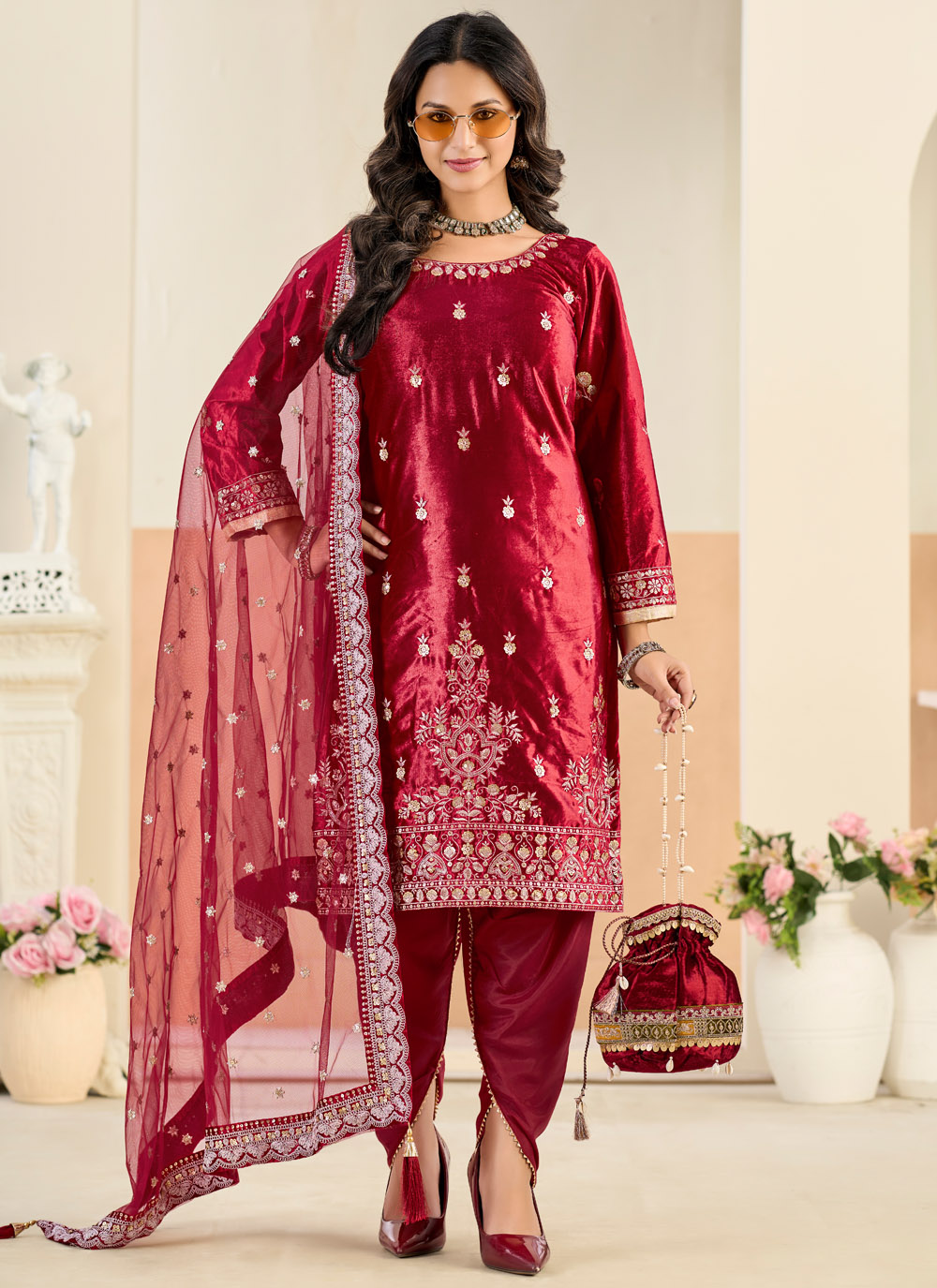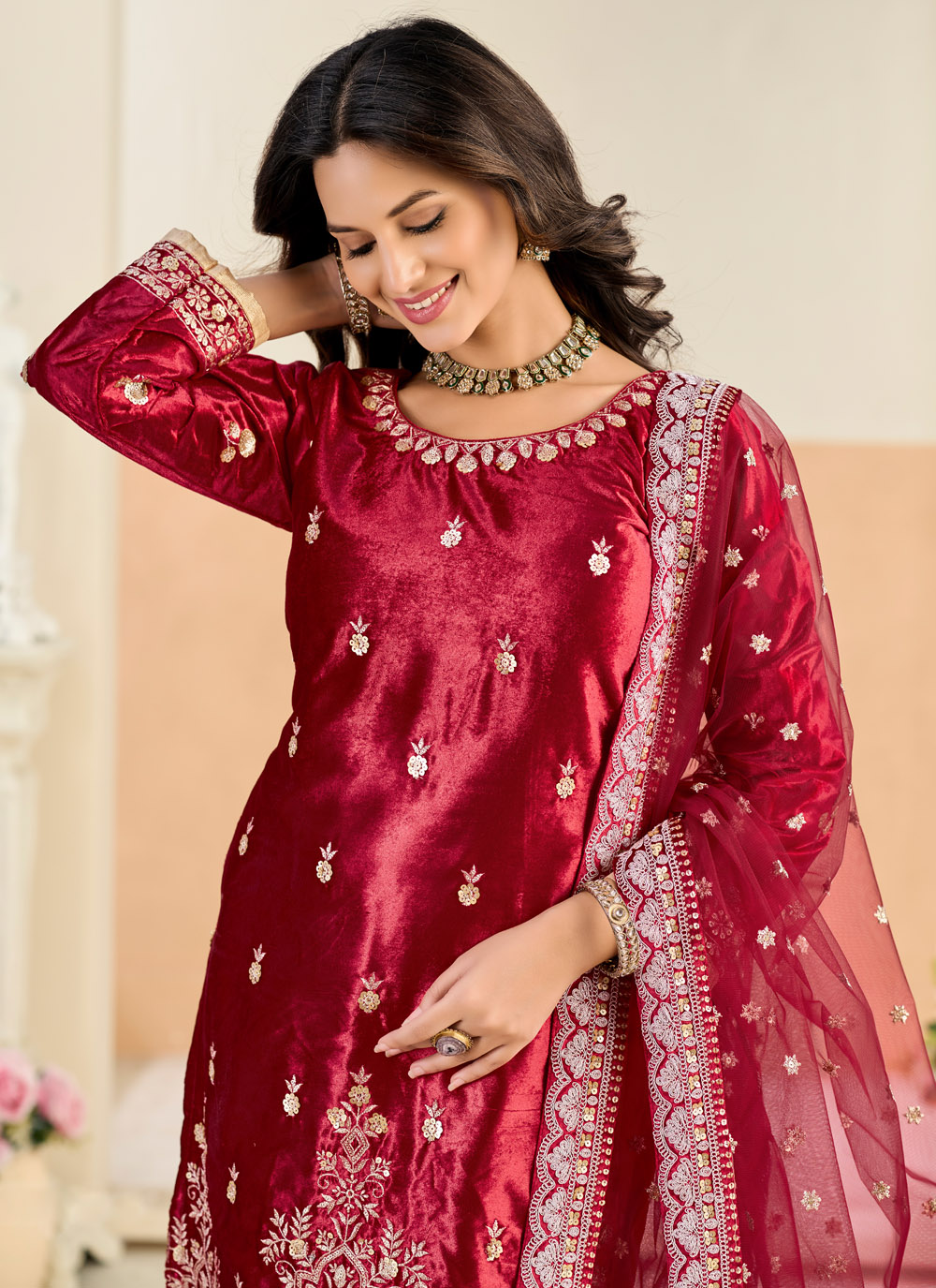 Add timeless elegance to your ethnic collection with this Designer Red Velvet Embroidered Patiala Salwar Suit. The shimmering sequins work beautifully complements the plush velvet fabric, creating a festive and glamorous outfit. Comes with matching bottom and dupatta.