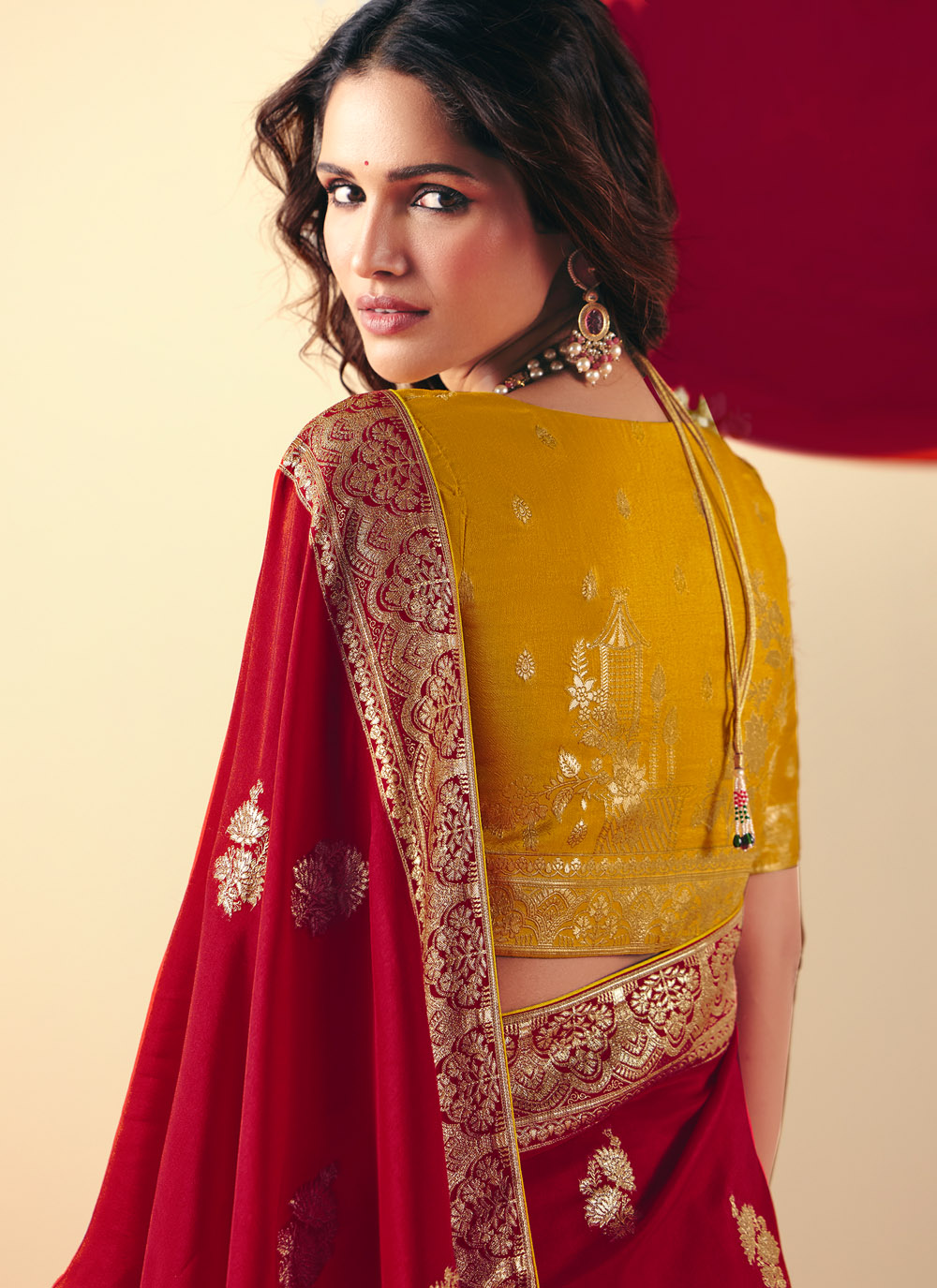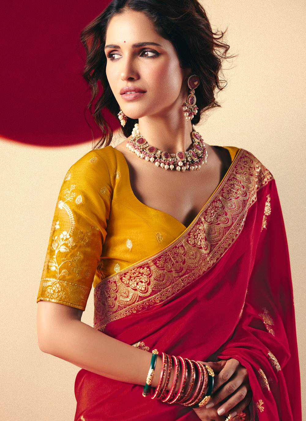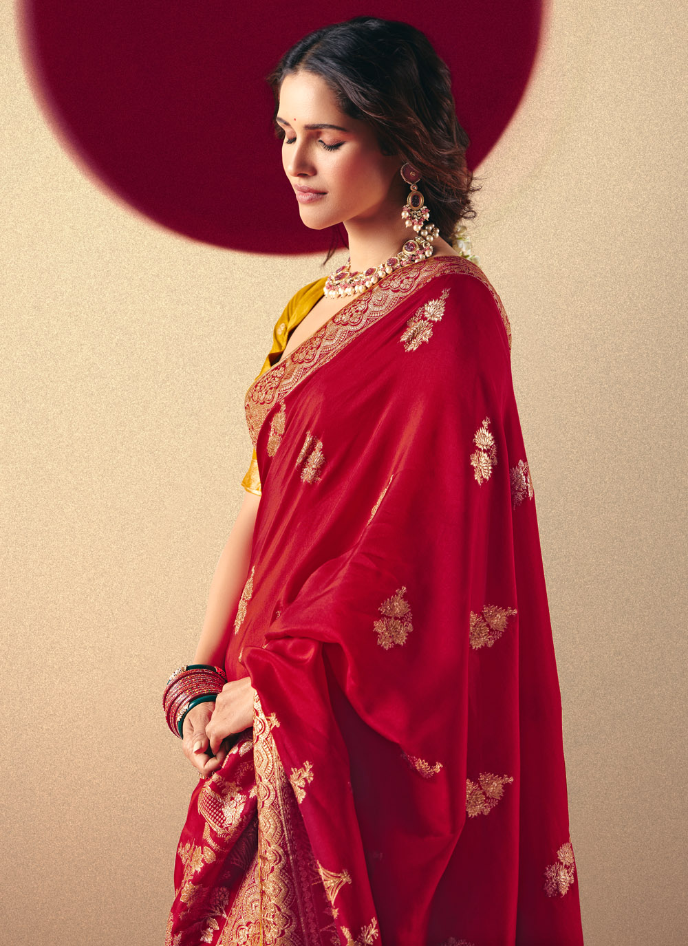 Drape yourself in elegance with this Red Viscose Designer Saree, highlighted with intricate zari weaving work. Perfect for weddings, this saree reflects rich tradition and contemporary charm in every detail. Comes with matching blouse.