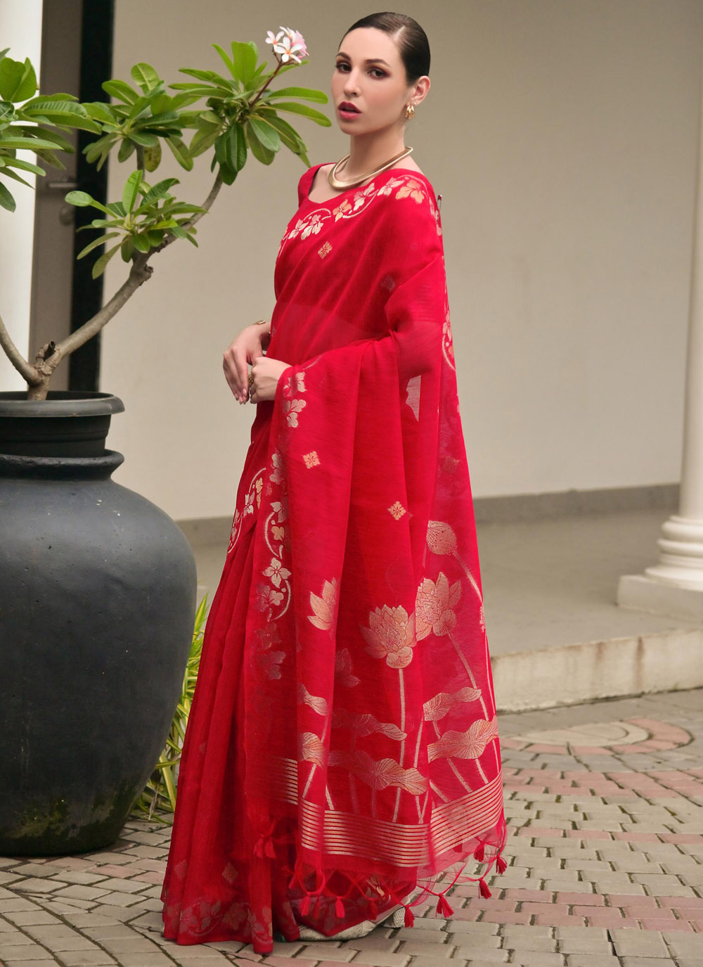 Experience refined elegance with this Zari Weaving Red Linen Silk Saree, created to bring out timeless beauty. The smooth finish and detailed craftsmanship offer a luxurious look, while the classic red shade enhances its festive charm. Comes with matching blouse.