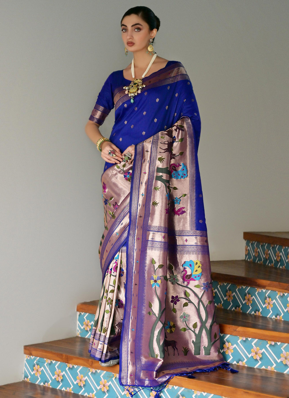 This classic royal blue Banarasi silk saree showcases fine zari weaving that adds depth and richness to its design. Its timeless appeal and elegant color make it a must-have for grand ethnic occasions. Comes with matching blouse.