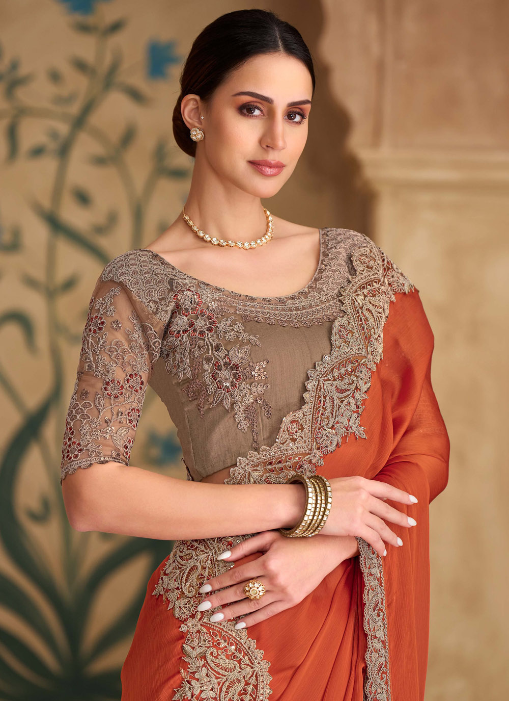 Elevate your traditional style with this Classic Chiffon Satin Saree featuring Rust Embroidered Border. The earthy rust tone adds richness to the saree, while the elegant embroidery gives it a premium finish. Comes with matching blouse.