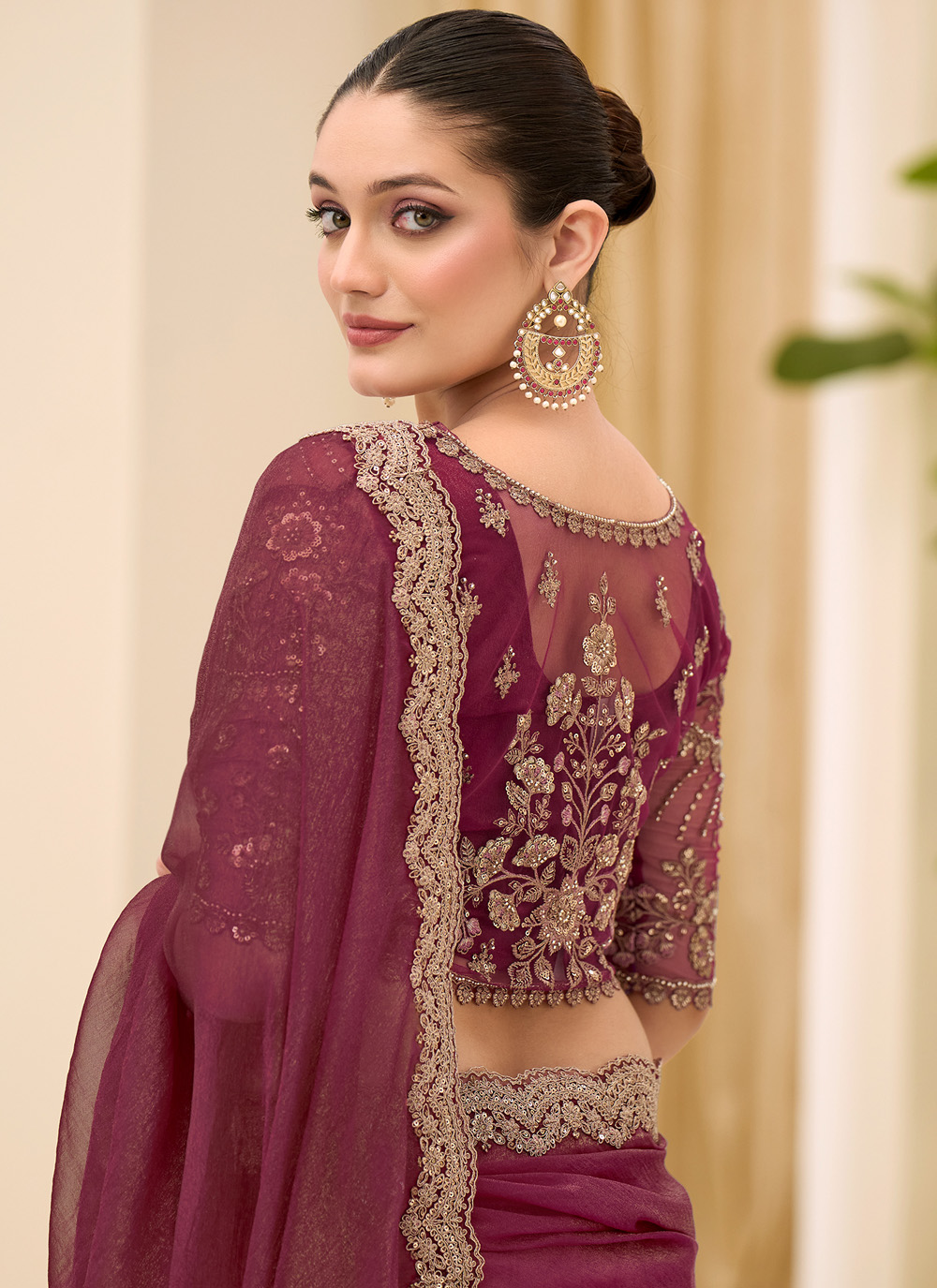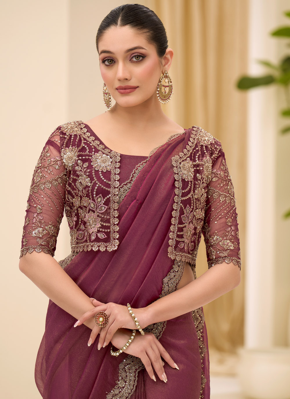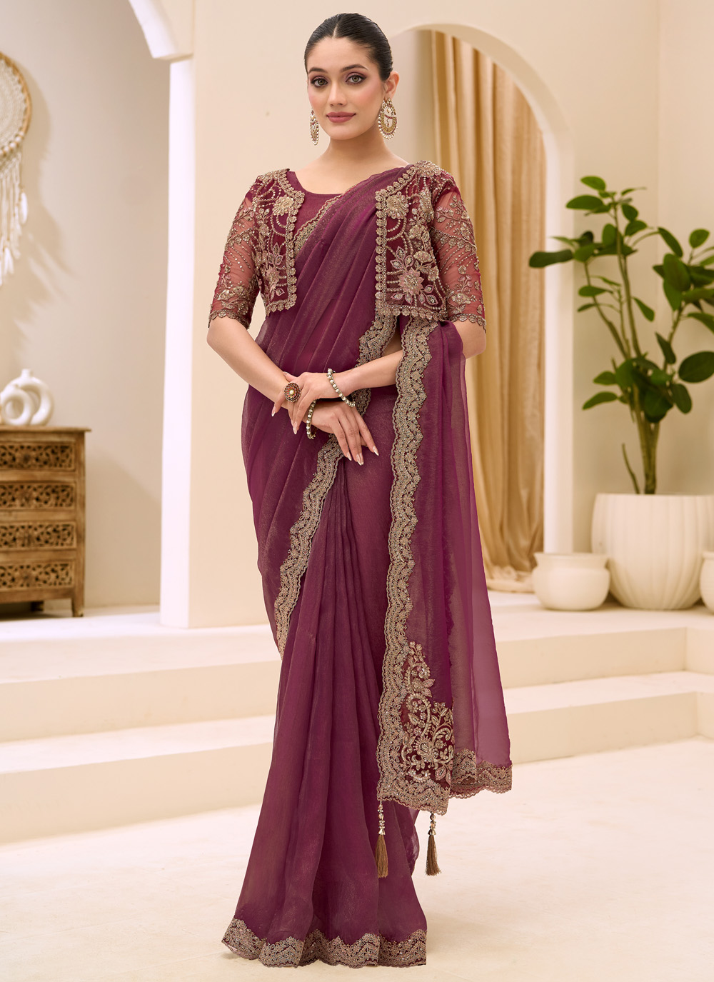 Add timeless charm to your ethnic collection with this rust georgette tissue classic saree adorned with finely crafted embroidered border work. Its lightweight texture and sophisticated design create a graceful festive look. Comes with matching blouse.