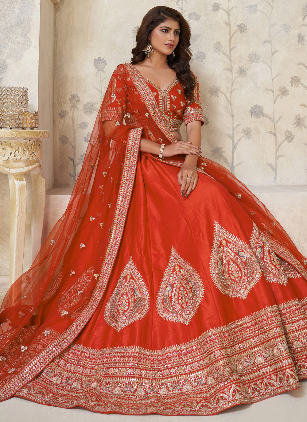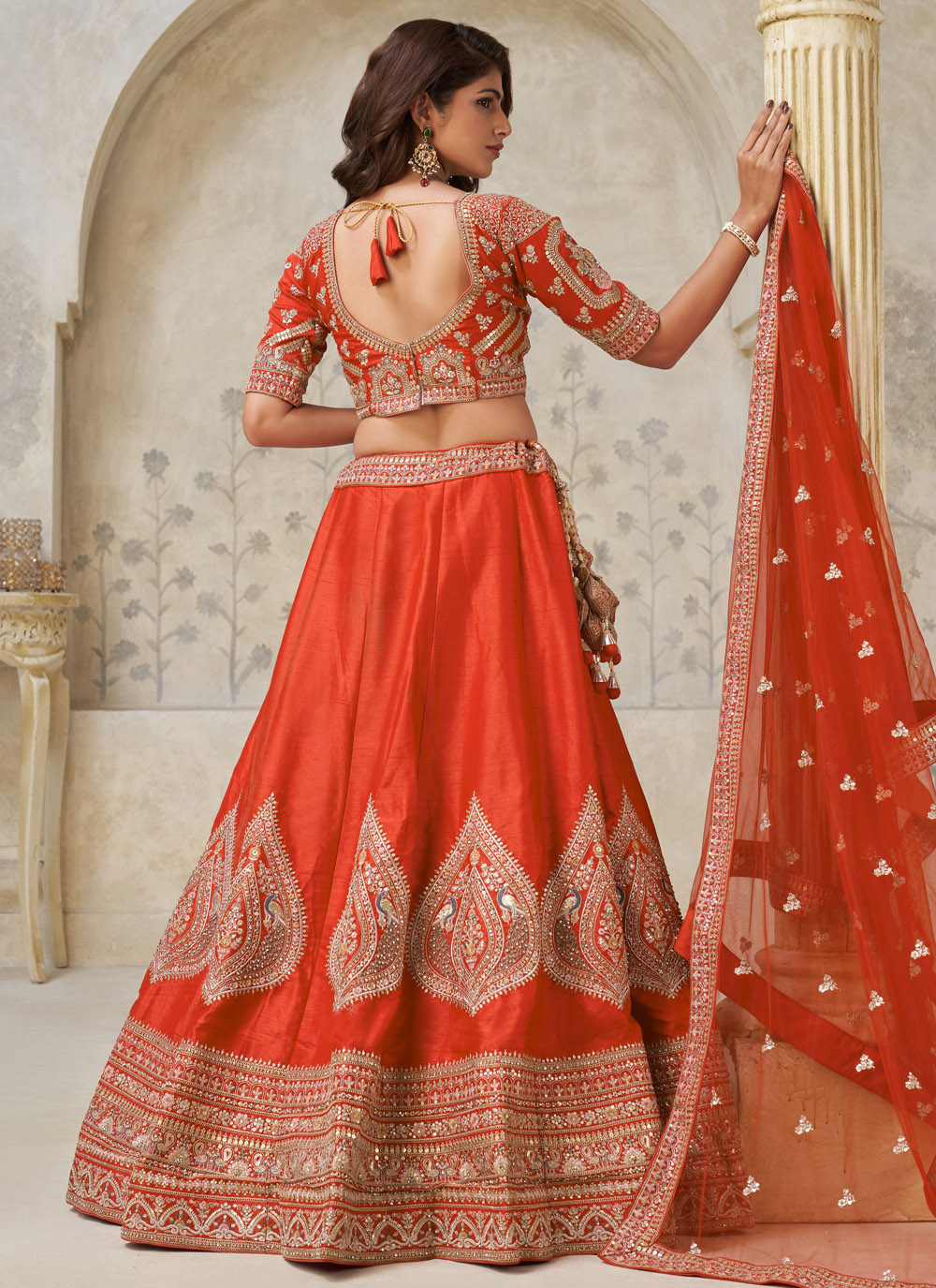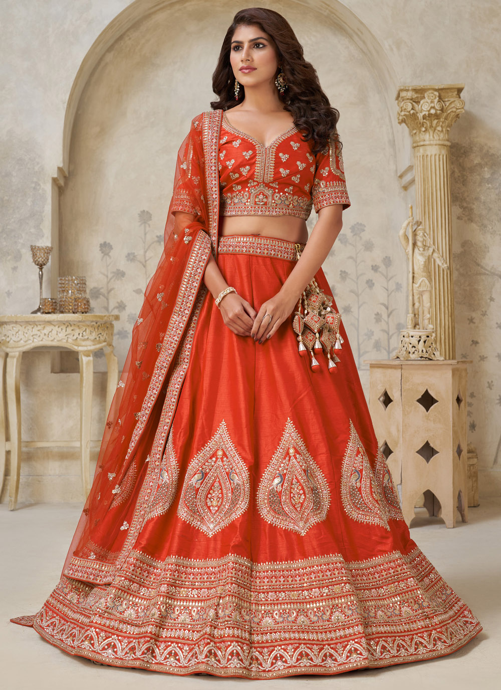 This ceremonial lehenga choli in rust silk showcases elegant zari work paired with delicate sequin detailing. The A-line pattern offers ease of movement while maintaining a rich and traditional appearance for special occasions. Comes with matching choli and dupatta.