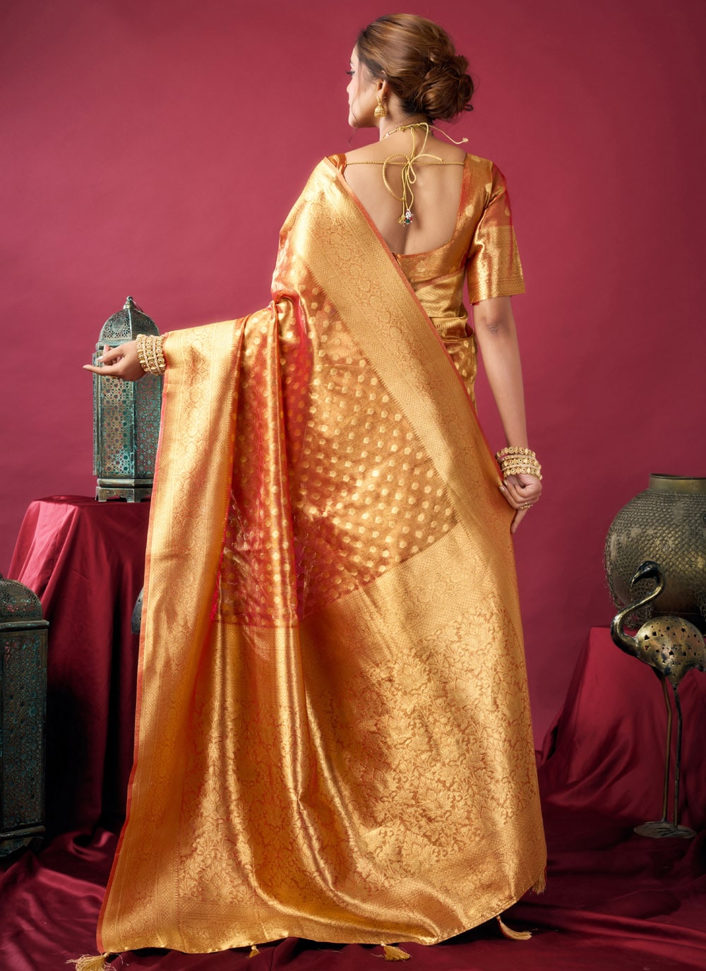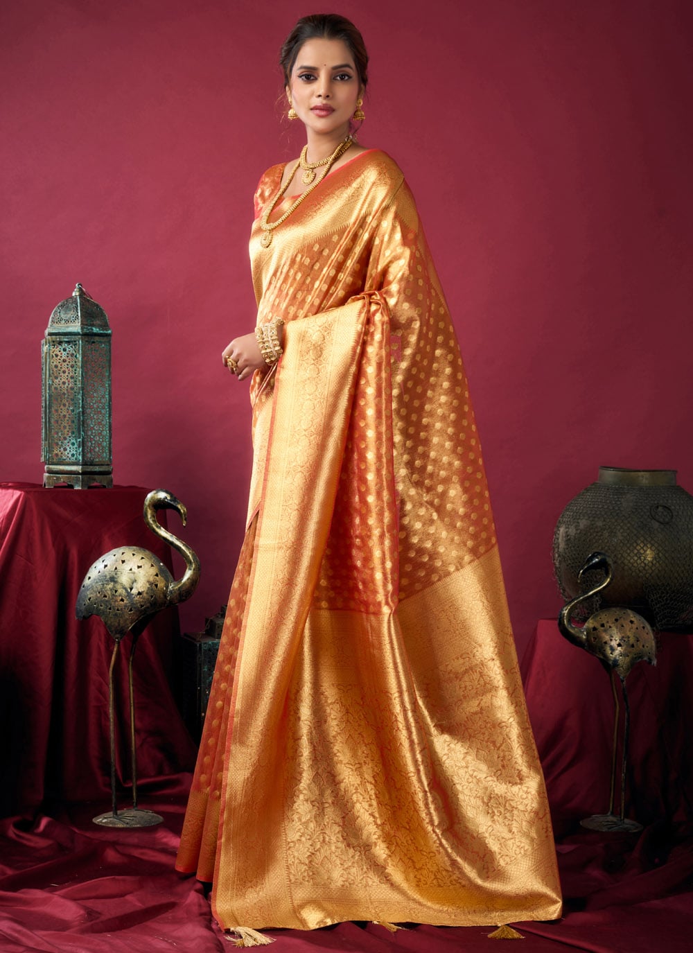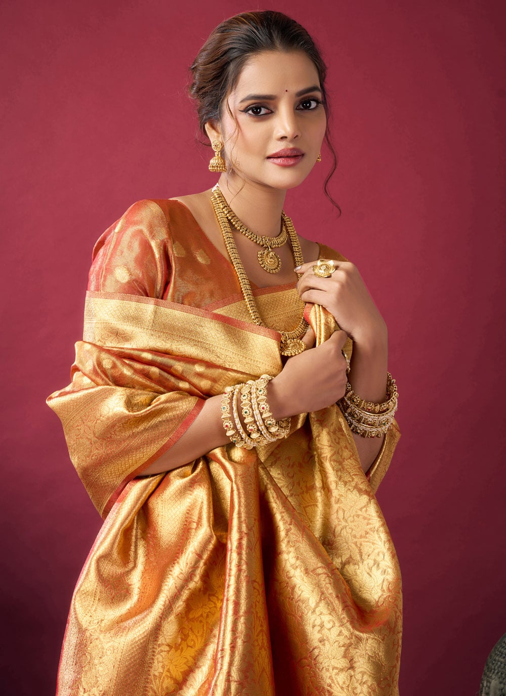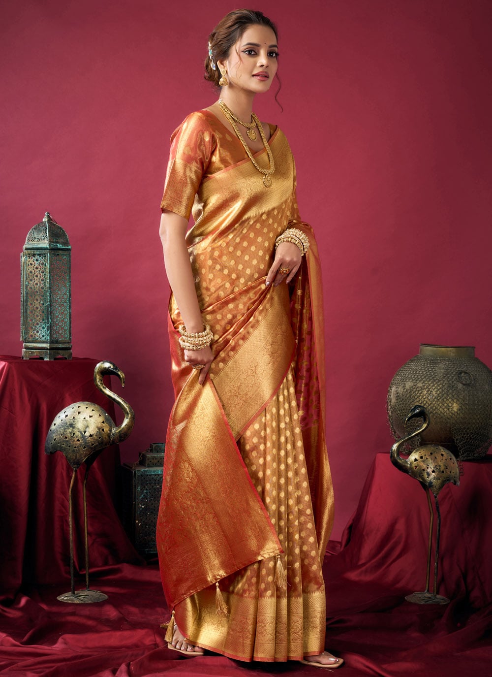 Redefine your ethnic elegance with this Rust Tissue Silk Saree, enriched with delicate jacquard weaving for a contemporary appeal. The rich rust shade adds warmth and sophistication. Perfect for festive evenings, receptions and cultural functions. Comes with matching blouse.