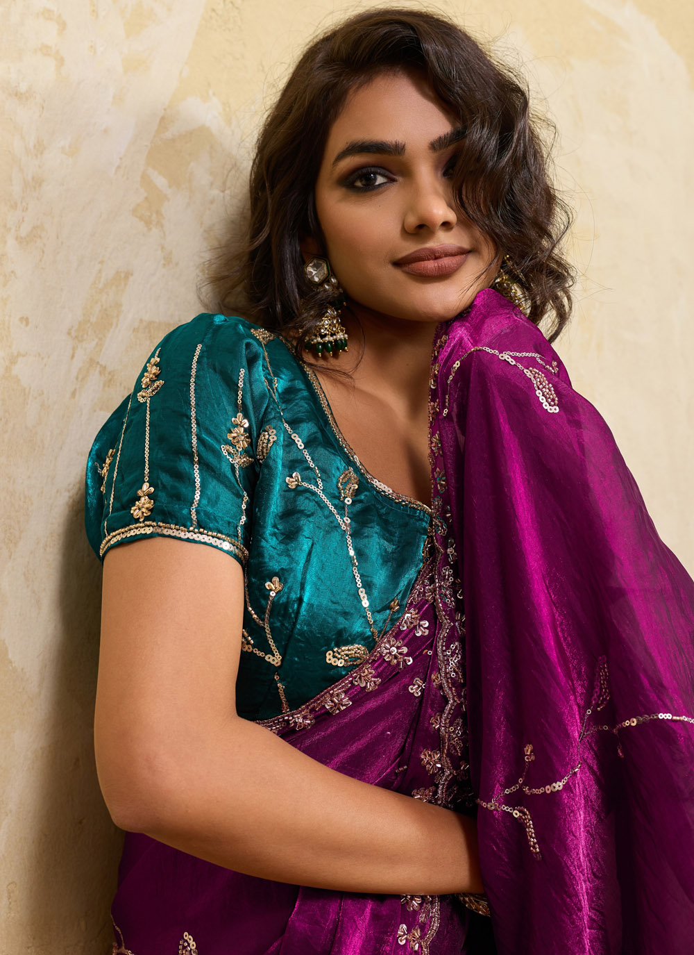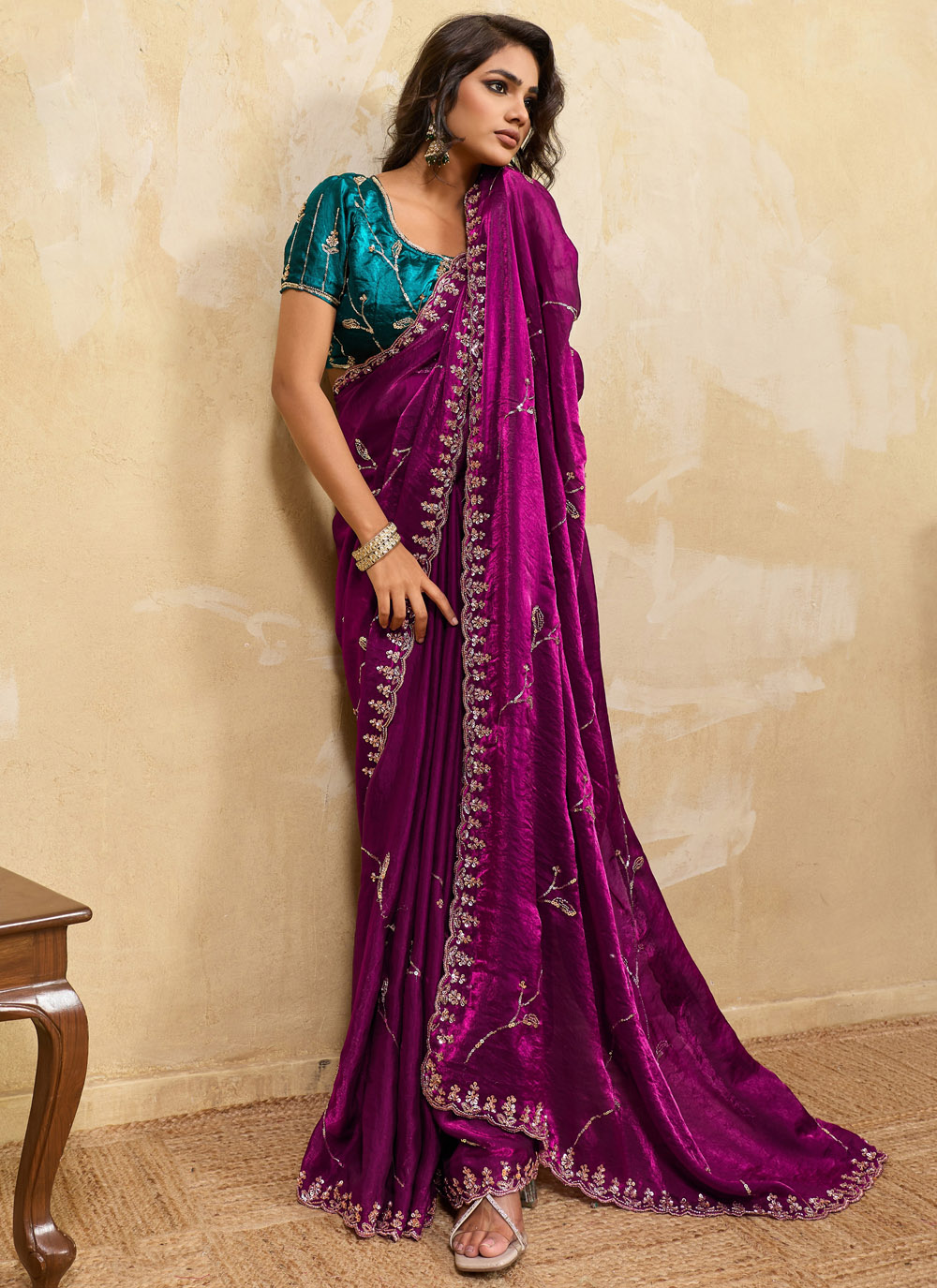 Experience timeless glamour with this trendy purple satin saree featuring elegant embroidery work. The premium satin base enhances comfort and elegance, while the detailed embellishments create a radiant finish. Comes with matching blouse.